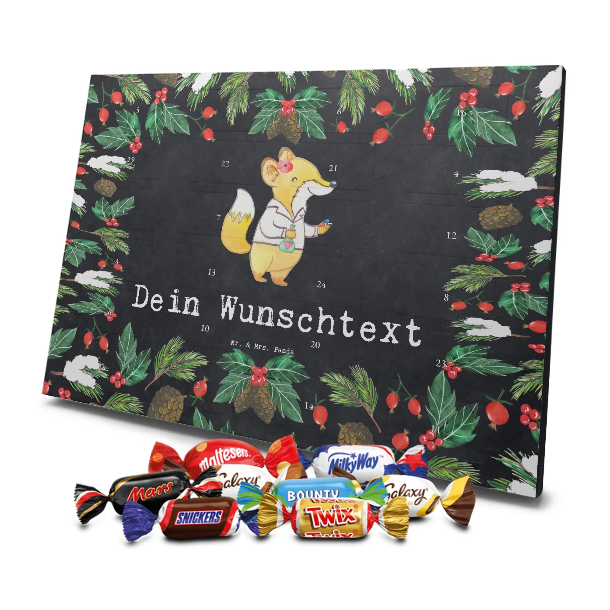 🐼 PERSONALISIERTER SCHOKO-ADVENTSKALENDER: Mit Wunschtext, bedruckt mit Mr. & Mrs. Panda Motiven, gefüllt mit MARKENNAMEN Schokolade.