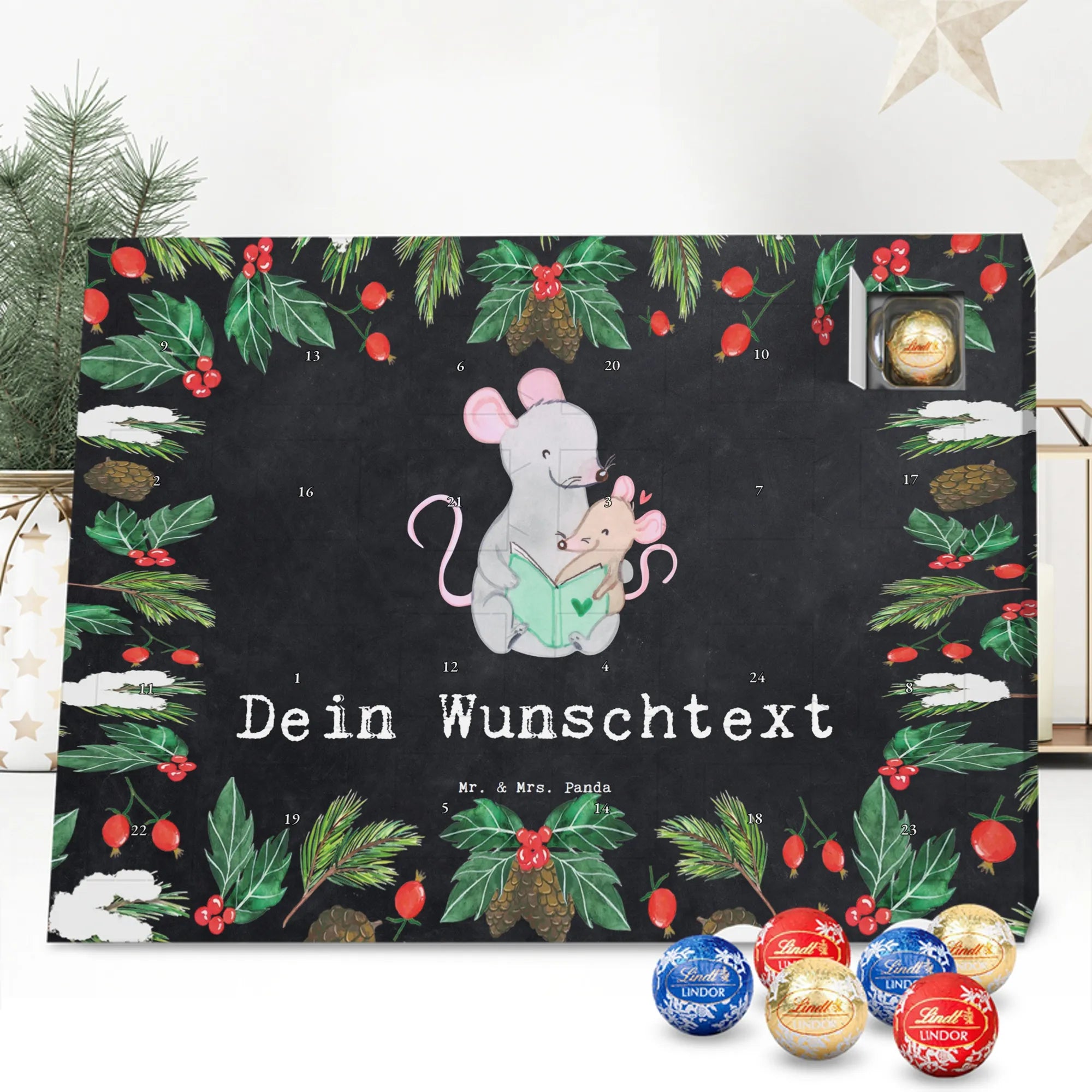 Personalisierter Schoko Adventskalender von Mr. & Mrs. Panda – der süße Countdown für dich oder deine Liebsten! Unser liebevoll gestalteter Adventskalender ist bedruckt mit wunderschönen Motiven und fröhlichen Sprüchen von Mr. & Mrs. Panda und lässt sich mit deinem Wunschnamen oder Wunschtext personalisieren. Die brillante Druckqualität kombiniert mit einer seidenmatten Oberflächenveredelung sorgt für ein edles Finish, zusätzlich sind die Seitenflächen bedruckt für ein durchgängiges Design. Maße: 233 mm x 178 mm x 24 mm. Der Kalender ist besonders praktisch: du kannst ihn entweder aufstellen oder an der Wand aufhängen – so passt er überall hin und verbreitet vorweihnachtliche Stimmung. Gefüllt mit Lindt Lindor Schokolade: 24 einzeln verpackte Markenschokoladen Kugeln in drei verschiedenen Sorten. Geschmacksrichtungen: Vollmilch, Feinherb und Weiße Schokolade. Zutaten: Zucker, pflanzliches Fett (Kokosnuss, Palmkern), Kakaobutter, Vollmilchpulver, Kakaomasse, Milchzucker, Magermilchpulver, Butterreinfett, Emulgator (Sojalecithin), Gerstenmalzextrakt, Aromen. Besondere Hinweise: Kann Haselnüsse und Mandeln enthalten. Dieser Adventskalender ist das perfekte Geschenk für Familien, Paare, Freunde oder für dich selbst – ein kleines tägliches Verwöhnmoment im Dezember. Bestell jetzt deinen personalisierten Schoko Adventskalender und zaubere ein Lächeln unter den Tannenbaum!
