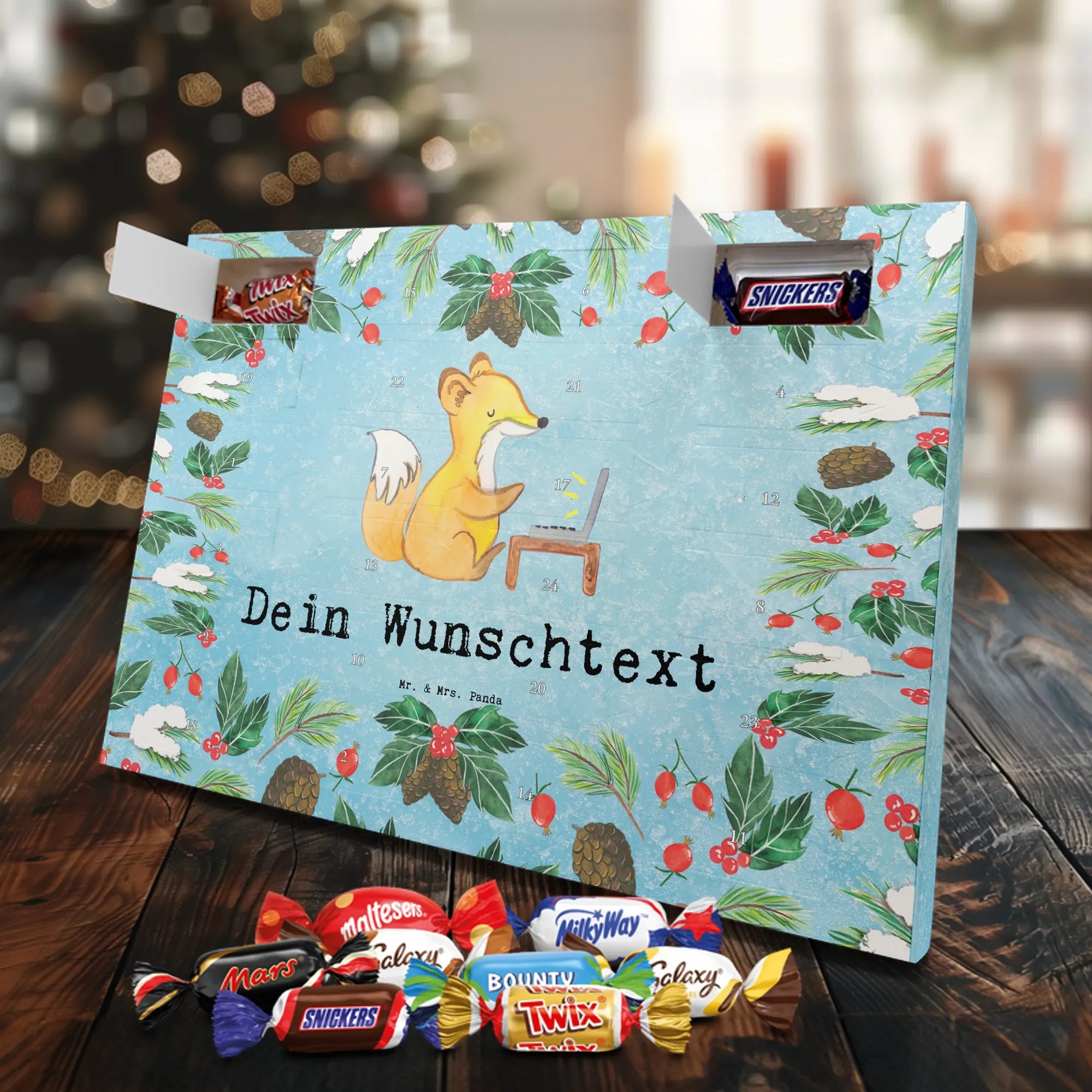 Stell dir vor, die Vorweihnachtszeit beginnt, draußen wird es kälter und im Büro duftet es nach frischem Kaffee und Plätzchen. Genau jetzt ist der richtige Moment, um deinem liebsten Arbeitskollegen eine ganz besondere Freude zu machen. Der Personalisierte Schoko Adventskalender von Mr. & Mrs. Panda mit dem zauberhaften Fuchs-Motiv ist mehr als nur ein Kalender - er ist eine tägliche Wertschätzung für all die Momente, in denen er dir den Rücken freigehalten hat. 🦊