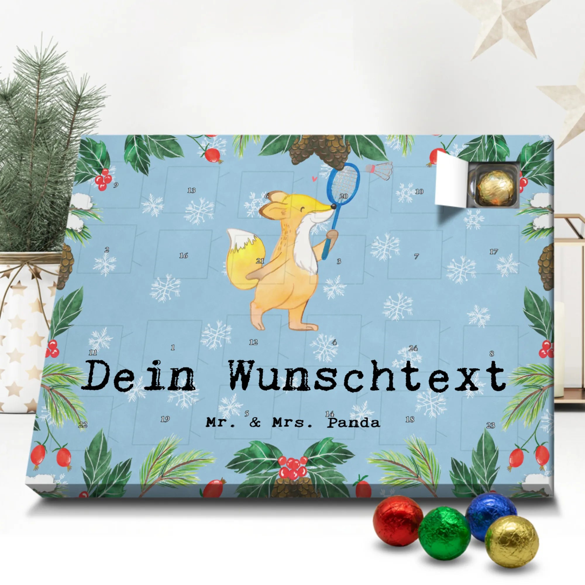 Personalisierter Adventskalender Fuchs Federball spielen - Classic - Eisblau