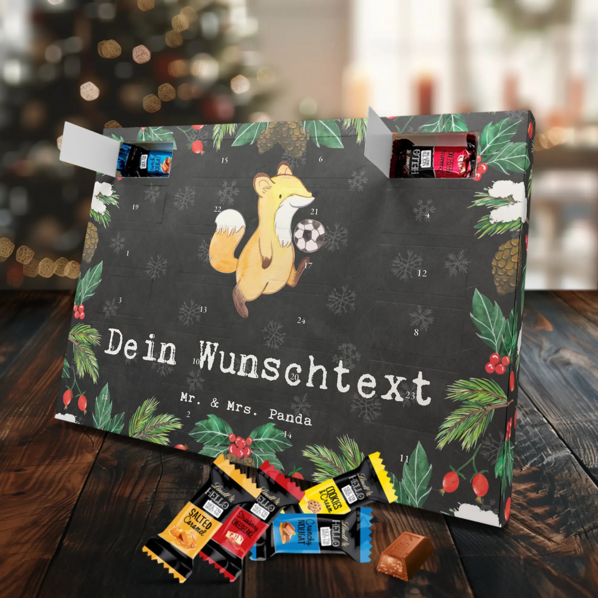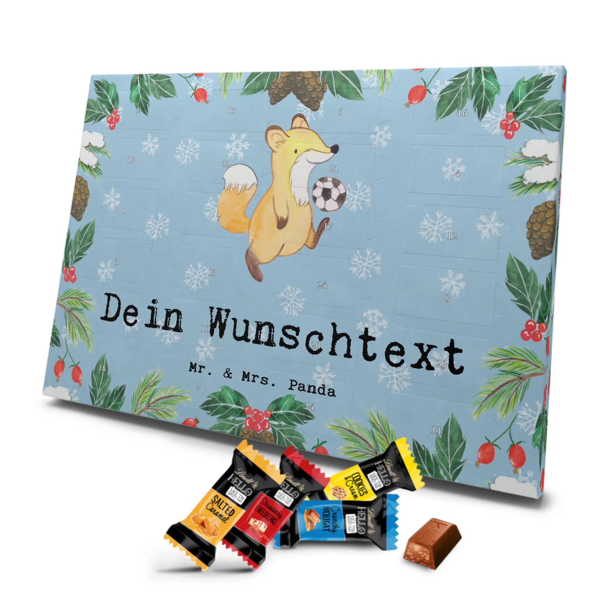 Personalisierter Schoko Adventskalender „Fußballer aus Leidenschaft“ – ein liebevolles Geschenk von Mr. & Mrs. Panda für alle, die Fußball leben und lieben ⚽️. Unser niedlicher Fuchs als Fußballer kickt mit voller Begeisterung und bringt jeden Adventstag ein Lächeln ins Gesicht.