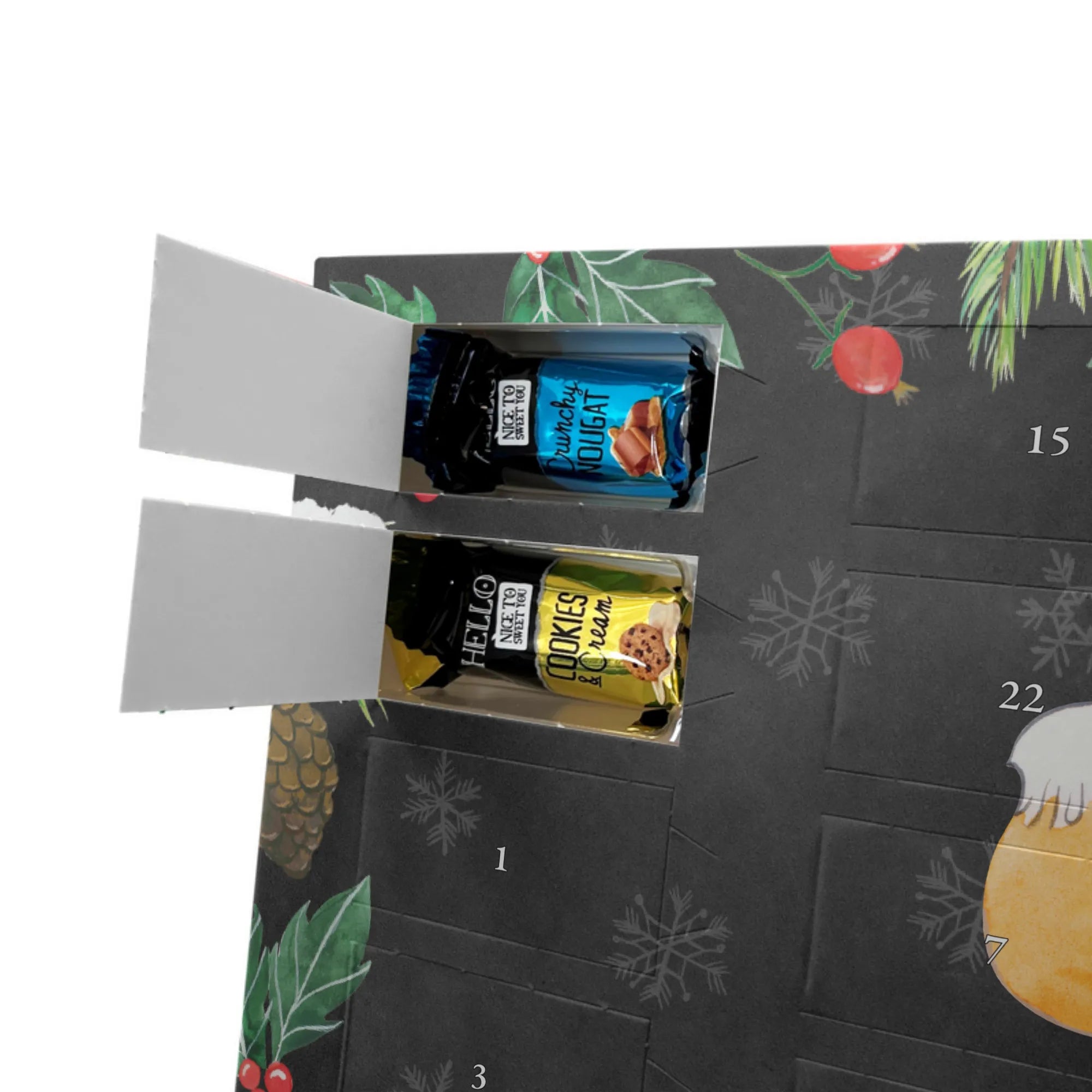 Verschenke Freude mit unserem Personalisierter Schokoladen Adventskalender von Mr. & Mrs. Panda. Der Kalender ist liebevoll gestaltet, bedruckt mit niedlichen Motiven und kurzen Sprüchen, und lässt sich ganz leicht mit deinem Wunschnamen oder einer kleinen Botschaft personalisieren. Die Druckqualität ist brillant und erhält durch eine seidenmatte Oberflächenveredelung eine hochwertige Haptik. Auch die Seitenflächen sind bedruckt, sodass du rundum ein stimmiges Design bekommst. Maße: 233 mm x 178 mm x 24 mm. Praktisch: Der Kalender kann entweder aufgehängt oder aufgestellt werden – ideal für jeden Ort in deiner Wohnung. Gefüllt mit MARKENNAMEN Schokolade und feinen Schokoladenkugeln bringt er jeden Tag eine leckere Überraschung. Bitte beachten: (Kann Spuren von Haselnüssen, Mandeln, Gluten und Soja enthalten!), kühl und trocken lagern! Ob als persönliches Geschenk für die Liebsten oder als besondere Adventsüberraschung für dich selbst – dieser personalisierte Kalender verbindet Charme, Qualität und süßen Genuss auf besondere Weise.