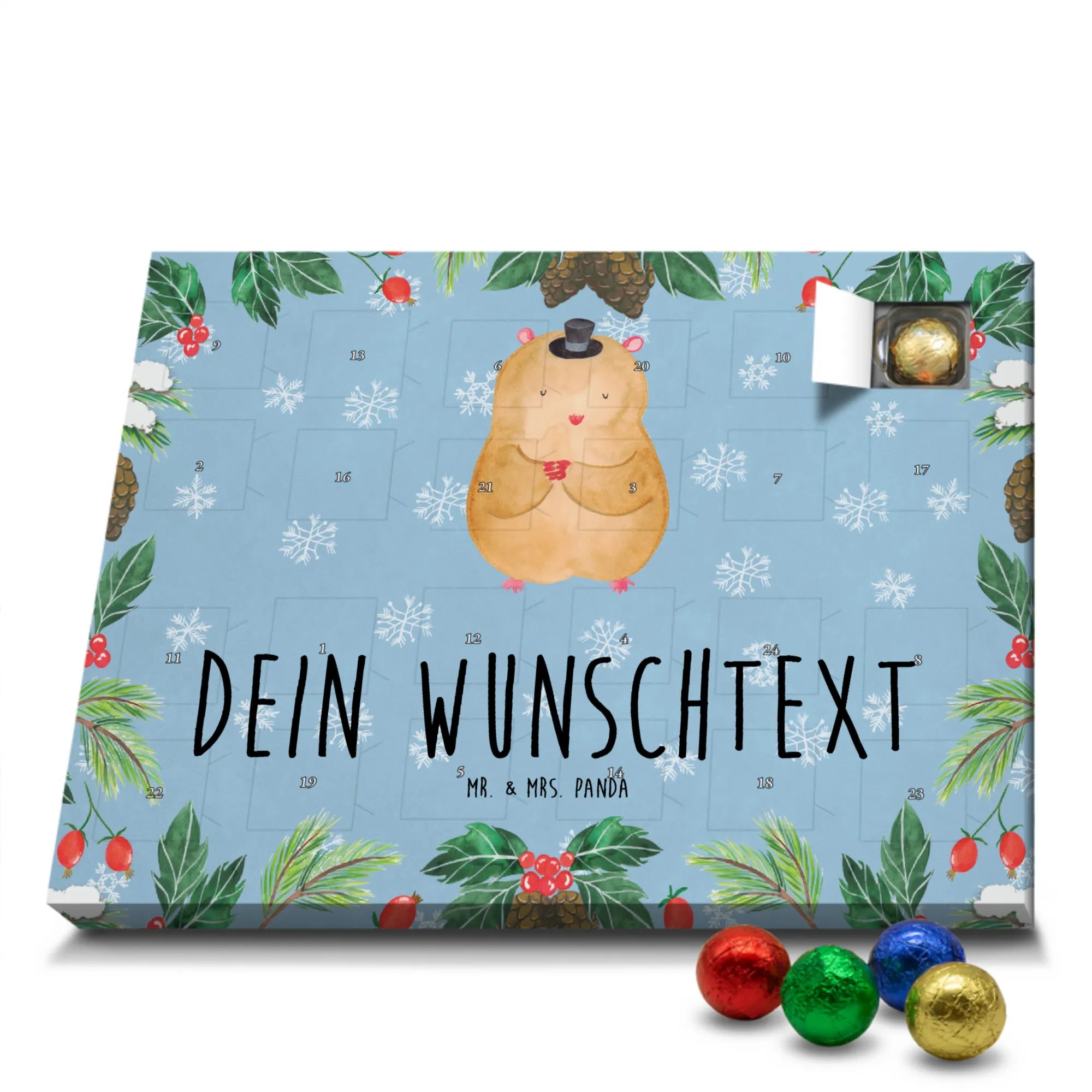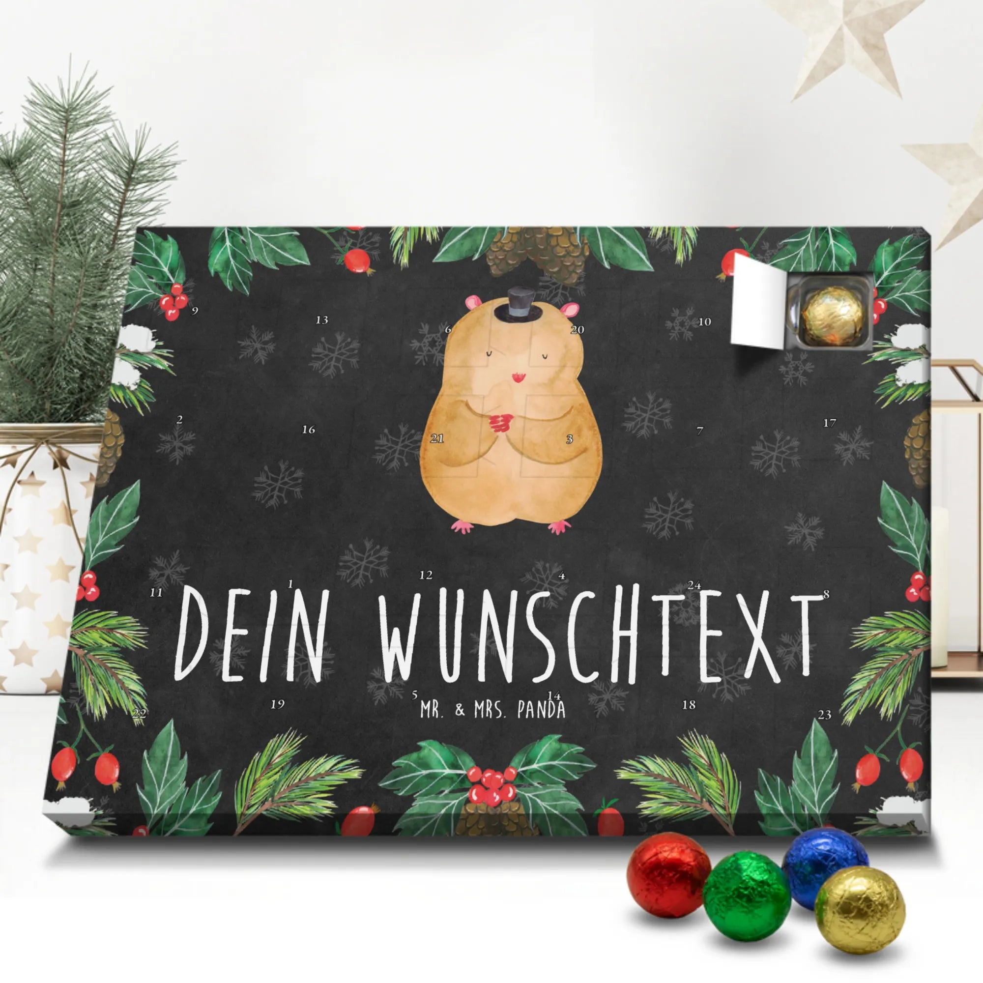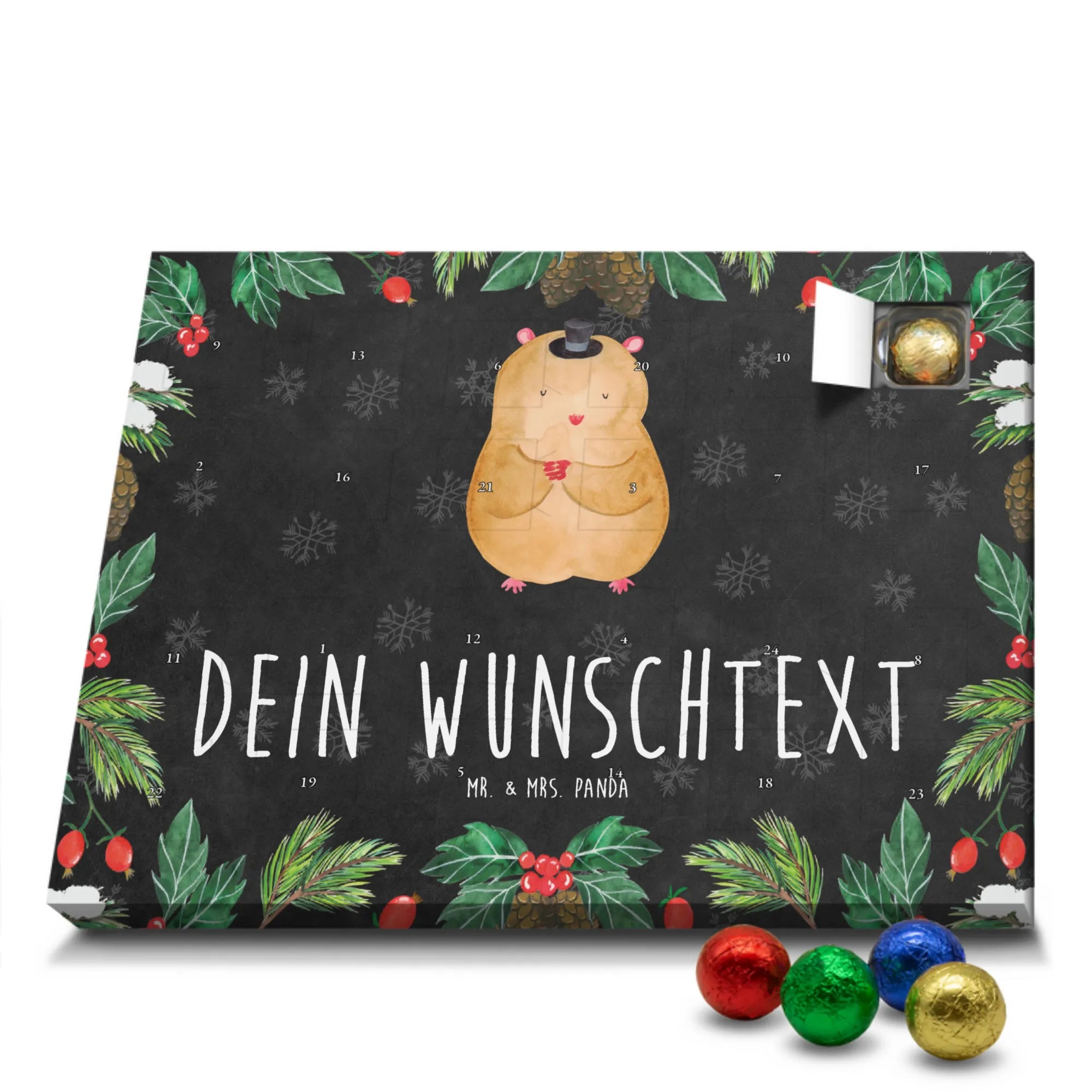 Mach die Adventszeit persönlich mit unserem Personalisierter Adventskalender mit Schokolade von Mr. & Mrs. Panda. Jeder Kalender ist liebevoll illustriert und bedruckt mit charmanten Sprüchen und Motiven – perfekt als Geschenk oder Deko für dein Zuhause. Du kannst deinen Wunschname oder einen kurzen Text hinzufügen, damit der Kalender ganz individuell wird. Die brillante Druckqualität und die seidenmatte Oberflächenveredelung sorgen für eine edle Optik, und auch die Seitenflächen sind komplett bedruckt. Maße: 233 mm x 178 mm x 24 mm. Die clevere Konstruktion erlaubt es, den Kalender aufzuhängen oder aufzustellen – flexibel und dekorativ zugleich. Gefüllt mit MARKENNAMEN Schokolade sowie köstlichen Schokoladenkugeln ist jeder Tag im Advent eine süße Überraschung. Wichtiger Hinweis: (Kann Spuren von Haselnüssen, Mandeln, Gluten und Soja enthalten!), kühl und trocken lagern! Egal ob für Kinder, Partner oder beste Freundin – dieser personalisierte Adventskalender bringt ein Lächeln und zaubert gemütliche Vorfreude. Bestell jetzt und gestalte deine Adventszeit mit einem Hauch Mr. & Mrs. Panda.