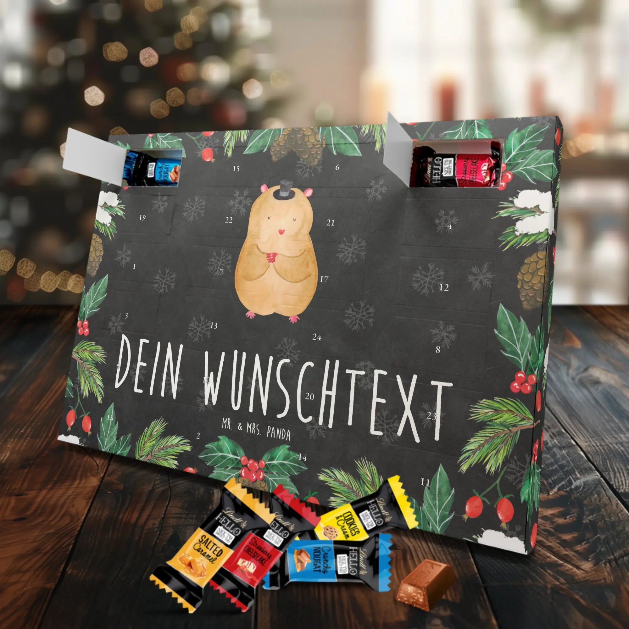 Individueller Schoko Adventskalender von Mr. & Mrs. Panda – das perfekte, persönliche Geschenk für die Adventszeit! Dieser Kalender wurde liebevoll gestaltet, mit fröhlichen Motiven und charmanten Sprüchen bedruckt und lässt sich mit deinem Wunschnamen oder einem individuellen Text versehen. Die brillante Druckqualität gepaart mit seidenmatter Oberflächenveredelung verleiht dem Kalender einen edlen Look; auch die Seitenflächen sind bedruckt, damit das Design rundum stimmig ist. Maße: 233 mm x 178 mm x 24 mm. Praktisch: Du kannst den Kalender aufstellen oder an der Wand aufhängen – ganz nach deinem Geschmack. Gefüllt mit Lindt Lindor Schokolade: 24 einzeln verpackte Markenschokoladen Kugeln in drei verführerischen Sorten. Geschmacksrichtungen: Vollmilch, Feinherb und Weiße Schokolade. Zutaten: Zucker, pflanzliches Fett (Kokosnuss, Palmkern), Kakaobutter, Vollmilchpulver, Kakaomasse, Milchzucker, Magermilchpulver, Butterreinfett, Emulgator (Sojalecithin), Gerstenmalzextrakt, Aromen. Besondere Hinweise: Kann Haselnüsse und Mandeln enthalten. Überrasche deine Liebsten mit einem persönlichen Adventskalender voller kleiner Schoko-Momente und viel Vorfreude.