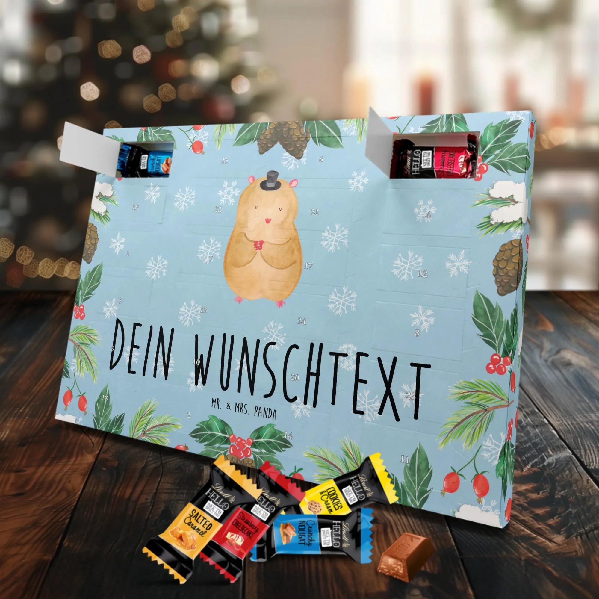 Personalisierter Adventskalender mit Schokolade – das Geschenk, das von Herzen kommt. Mr. & Mrs. Panda haben für dich einen Adventskalender gestaltet, der nicht nur mit süßen Überraschungen gefüllt ist, sondern auch optisch überzeugt: bedruckte Seitenflächen, charmante Motive und Sprüche sowie eine seidenmatte Oberflächenveredelung für edles Finish. Du kannst den Kalender mit deinem Wunschnamen oder Wunschtext personalisieren – ideal als Geschenk für die beste Freundin, Familie oder Kinder. Er kann aufgehängt oder einfach aufgestellt werden, je nachdem, wie du ihn präsentieren möchtest. Gefüllt mit Lindt Hello: 24 einzeln verpackte Schokoladen Mini Sticks in den Sorten Karamell-Schokoladenkuchen, Kekse, Knuspriger Nougat und Erdbeer-Cheesecake. Bitte beachte die Zutaten und Allergenhinweise (Milcheiweiß, Milchzucker, Soja, Weizen, Haselnüsse; kann Mandeln und andere Schalenfrüchte enthalten). Die brillante Druckqualität macht dein Design besonders lebendig. Maße: 325 mm x 225 mm x 27 mm – handliche Größe für jede Dekoration.