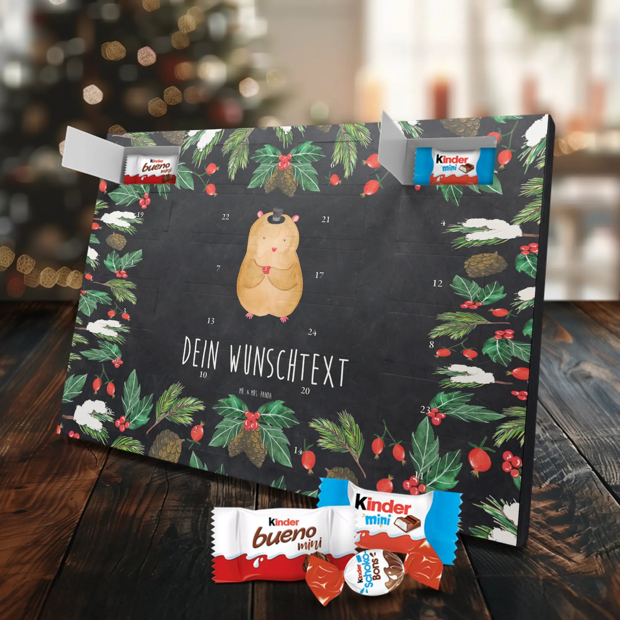 Feier die Vorfreude mit einem persönlichen Hingucker: unser Personalisierter Schoko Adventskalender von Mr. & Mrs. Panda. Dieser Kalender ist liebevoll mit wunderschönen Motiven & Sprüchen bedruckt und kann mit deinem Wunschnamen oder Wunschtext individualisiert werden – perfekt für eine persönliche Überraschung jeden Adventstag. Die brillante Druckqualität und die seidenmatte Oberflächenveredelung geben dem Kalender einen edlen Look, und die bedruckten Seitenflächen machen ihn rundum dekorativ. Besonders praktisch: der Kalender kann aufgehängt oder aufgestellt werden, je nachdem, wie du ihn präsentieren möchtest. Maße: 355 mm x 245 mm x 11 mm – ein ideales Format für dekorative Platzierung und genügend Raum für leckere Türchenüberraschungen. Gefüllt mit kinder® Schokolade: Adventskalender gefüllt mit kinder® Schokolade; Inhalt: kinder® Schoko-Bons, kinder® Bueno mini und kinder® Schokolade mini. Ob als Geschenk für Kinder, Partner oder beste Freunde – mit Mr. & Mrs. Panda verschenkst du nicht nur Süßes, sondern echte Vorfreude und liebevolle Gestaltung.