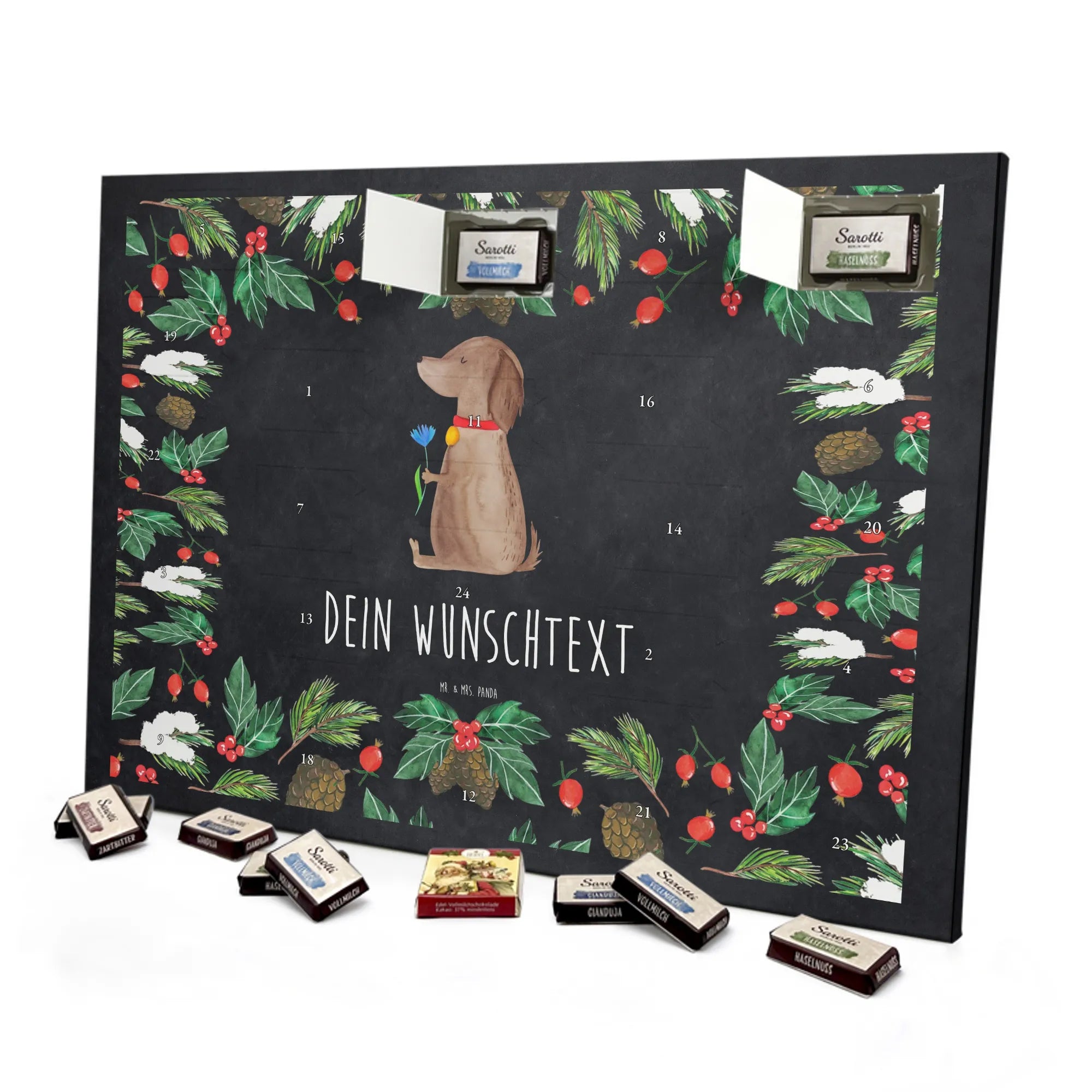 Personalisierter Schoko Adventskalender „Hund Blume“ – die liebevolle Geschenkidee aus der Hunde Kollektion von Mr. & Mrs. Panda. Dieser Adventskalender vereint zauberhafte Illustration, persönlichen Charme und köstliche Schokolade zu einem besonderen Erlebnis für Hundebesitzer und Tierfreunde.