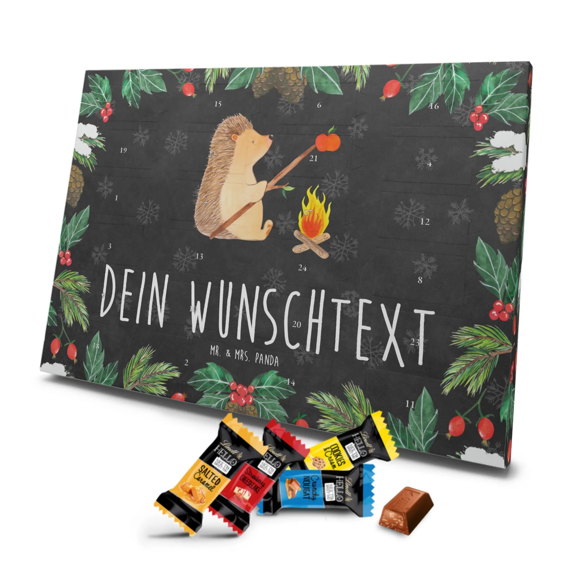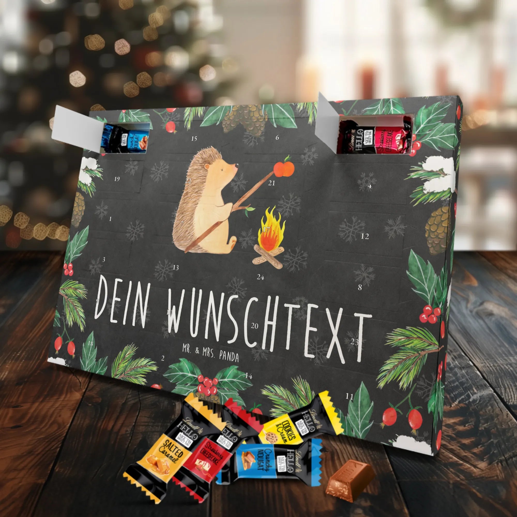 Unser Personalisierter Schoko-Adventskalender von Mr. & Mrs. Panda bringt Freude ins Adventsfenster und zaubert jedem ein Lächeln aufs Gesicht. Du gestaltest ihn ganz individuell: wähle deinen Wunschtext oder Namen und wir drucken ihn auf den Kalender – inklusive bedruckter Seitenflächen für ein rundum schönes Ergebnis. Die seidenmatte Oberflächenveredelung sorgt für eine elegante Haptik, während die brillante Druckqualität die Motive zum Strahlen bringt. Der Kalender ist flexibel einsetzbar, denn er kann aufgehängt oder einfach aufgestellt werden. Gefüllt mit Lindt Hello: 24 einzelne Schokoladen Mini Sticks in vier leckeren Geschmacksrichtungen (Karamell-Schokoladenkuchen, Kekse, Knuspriger Nougat, Erdbeer-Cheesecake). Zutaten und Allergene (Milcheiweiß, Milchzucker, Soja, Weizen, Haselnüsse; kann Mandeln und andere Schalenfrüchte enthalten) sind ausgewiesen. Ideal als persönliches Geschenk für Familienmitglieder, Freundinnen oder für dich selbst – mit viel Liebe gestaltet von Mr. & Mrs. Panda. Maße: 325 mm x 225 mm x 27 mm, praktische Größe für Regal oder Wand.