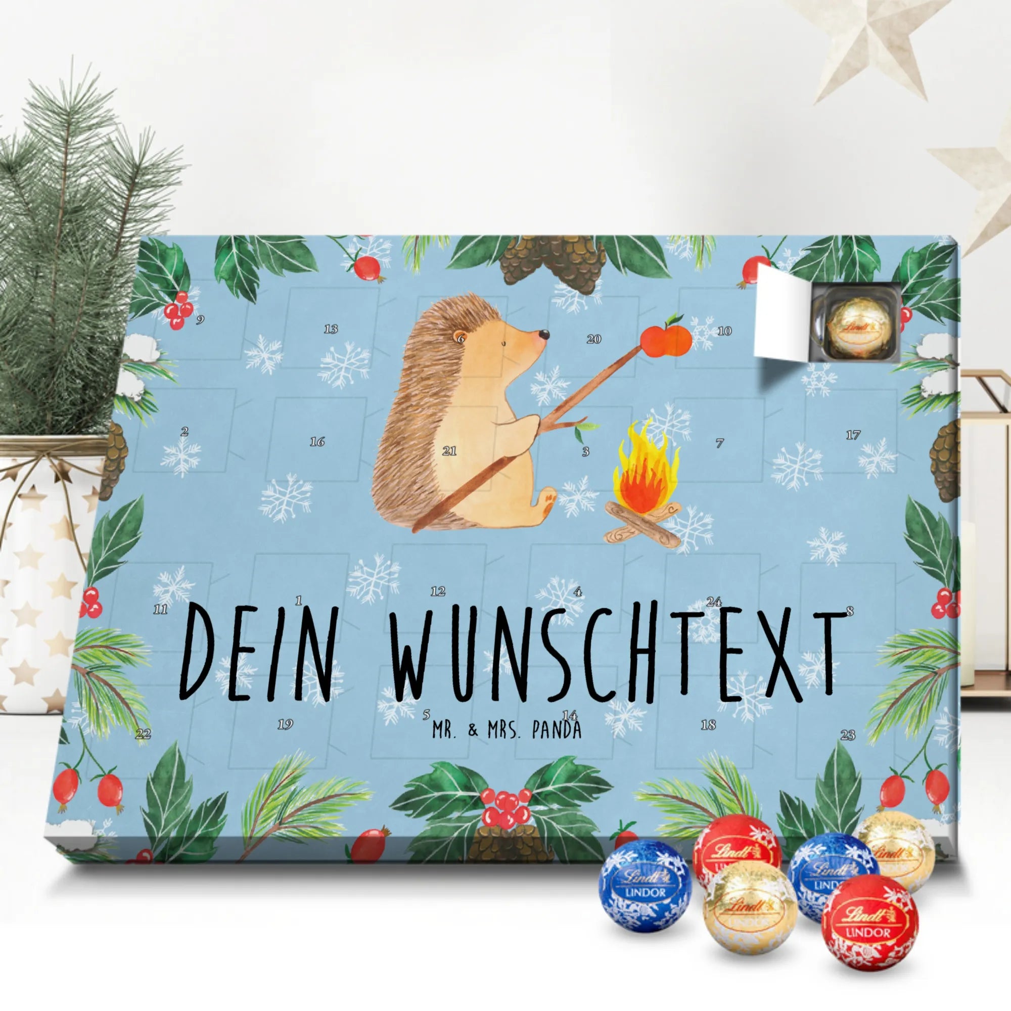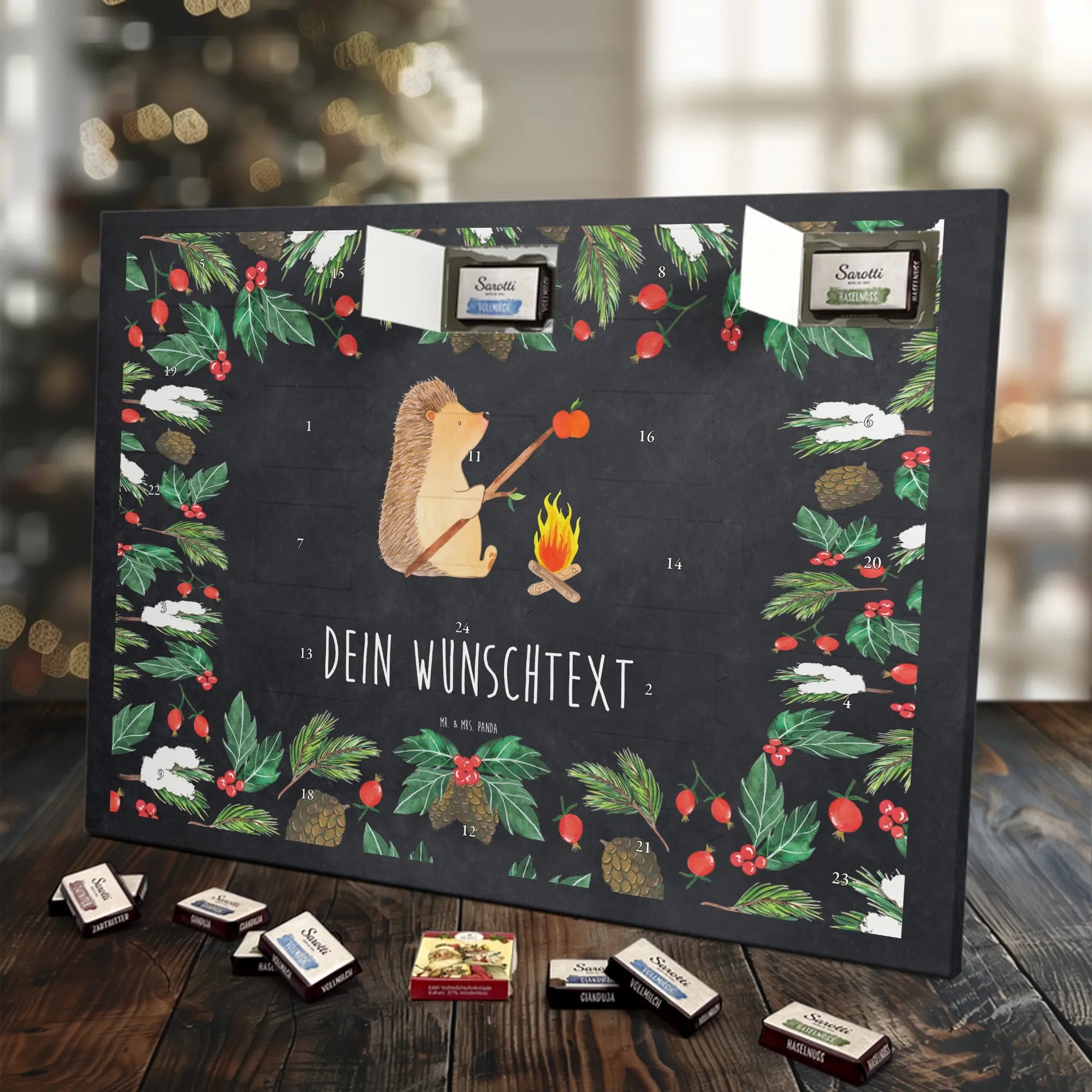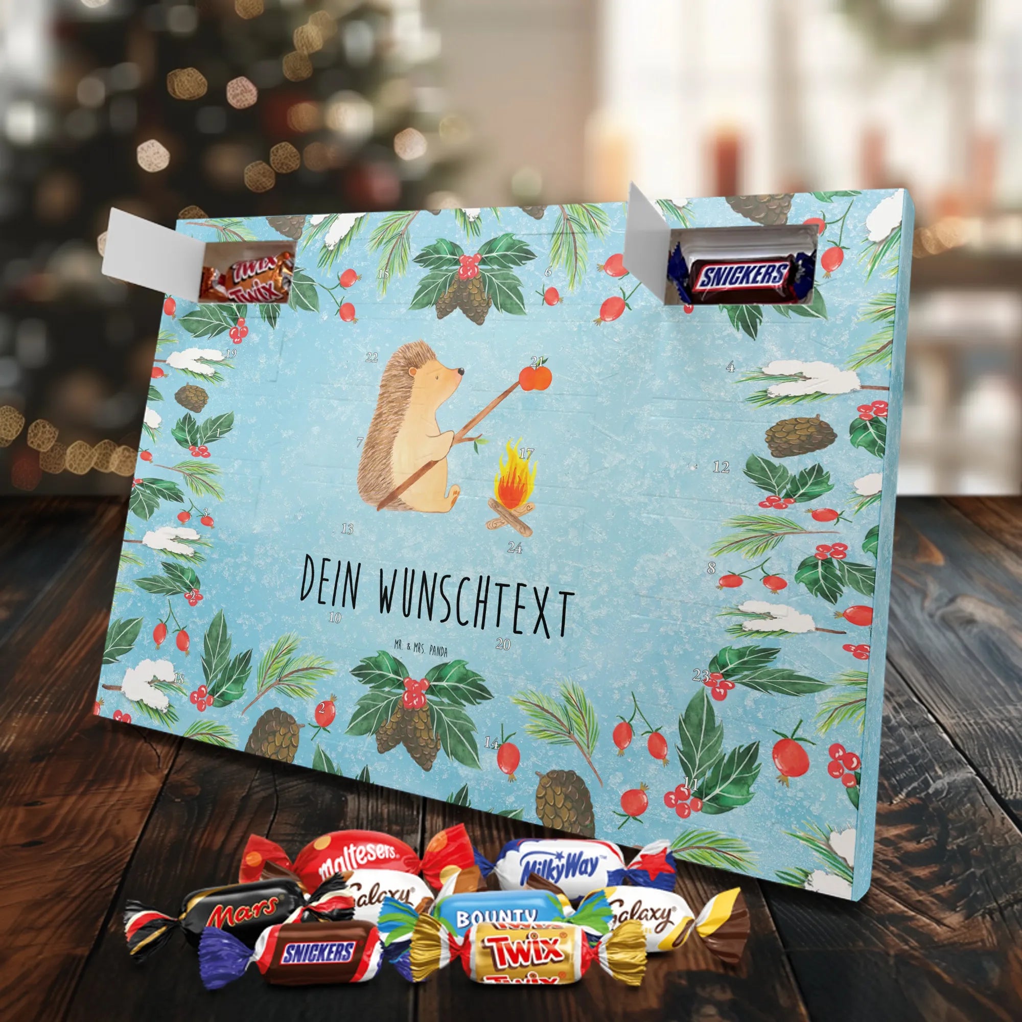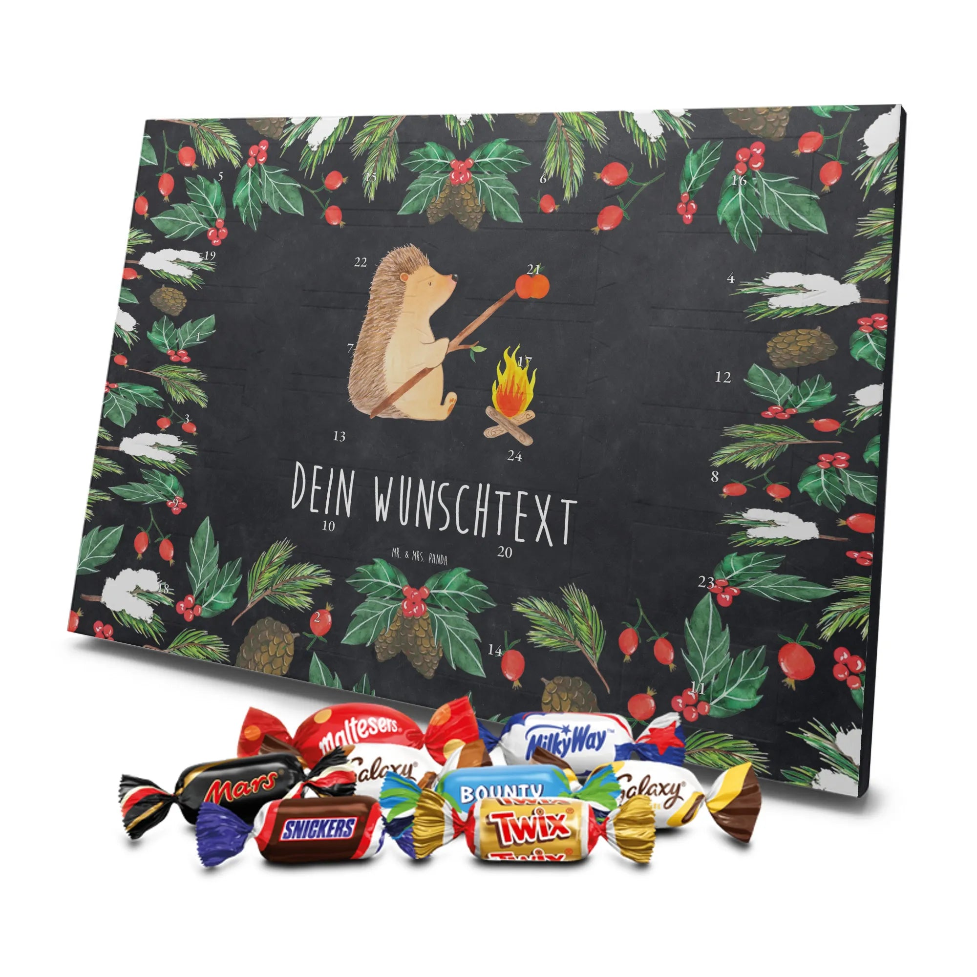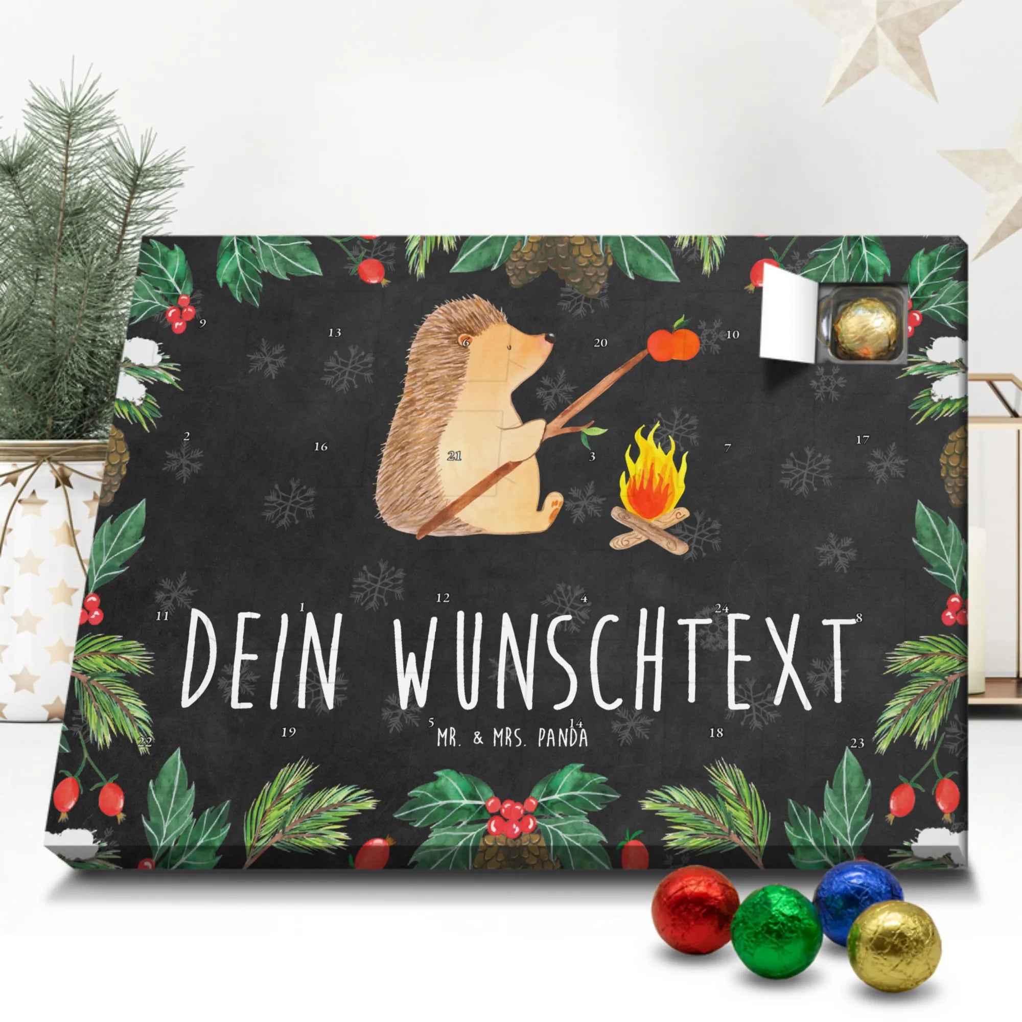 Mach die Adventszeit persönlich mit unserem Personalisierter Adventskalender mit Schokolade von Mr. & Mrs. Panda. Jeder Kalender ist liebevoll illustriert und bedruckt mit charmanten Sprüchen und Motiven – perfekt als Geschenk oder Deko für dein Zuhause. Du kannst deinen Wunschname oder einen kurzen Text hinzufügen, damit der Kalender ganz individuell wird. Die brillante Druckqualität und die seidenmatte Oberflächenveredelung sorgen für eine edle Optik, und auch die Seitenflächen sind komplett bedruckt. Maße: 233 mm x 178 mm x 24 mm. Die clevere Konstruktion erlaubt es, den Kalender aufzuhängen oder aufzustellen – flexibel und dekorativ zugleich. Gefüllt mit MARKENNAMEN Schokolade sowie köstlichen Schokoladenkugeln ist jeder Tag im Advent eine süße Überraschung. Wichtiger Hinweis: (Kann Spuren von Haselnüssen, Mandeln, Gluten und Soja enthalten!), kühl und trocken lagern! Egal ob für Kinder, Partner oder beste Freundin – dieser personalisierte Adventskalender bringt ein Lächeln und zaubert gemütliche Vorfreude. Bestell jetzt und gestalte deine Adventszeit mit einem Hauch Mr. & Mrs. Panda.