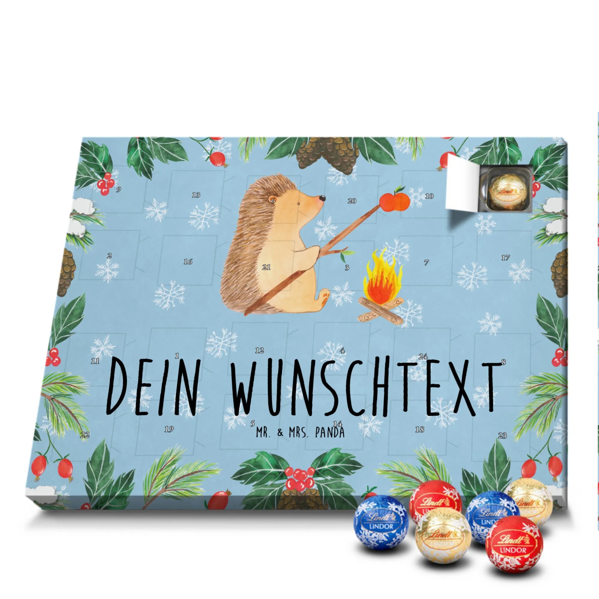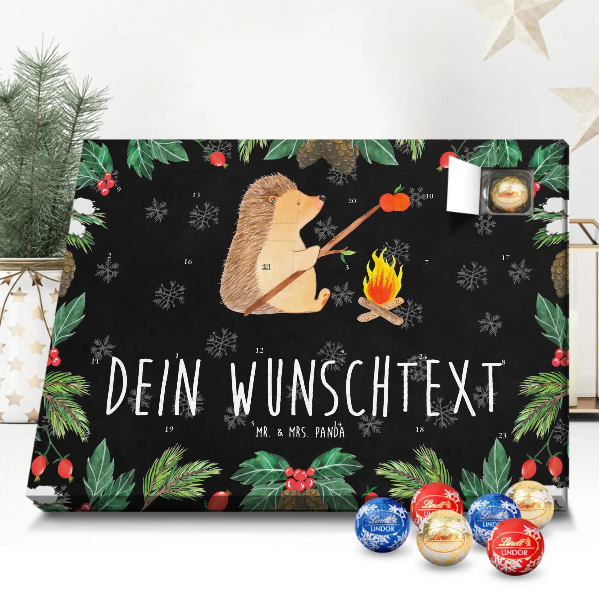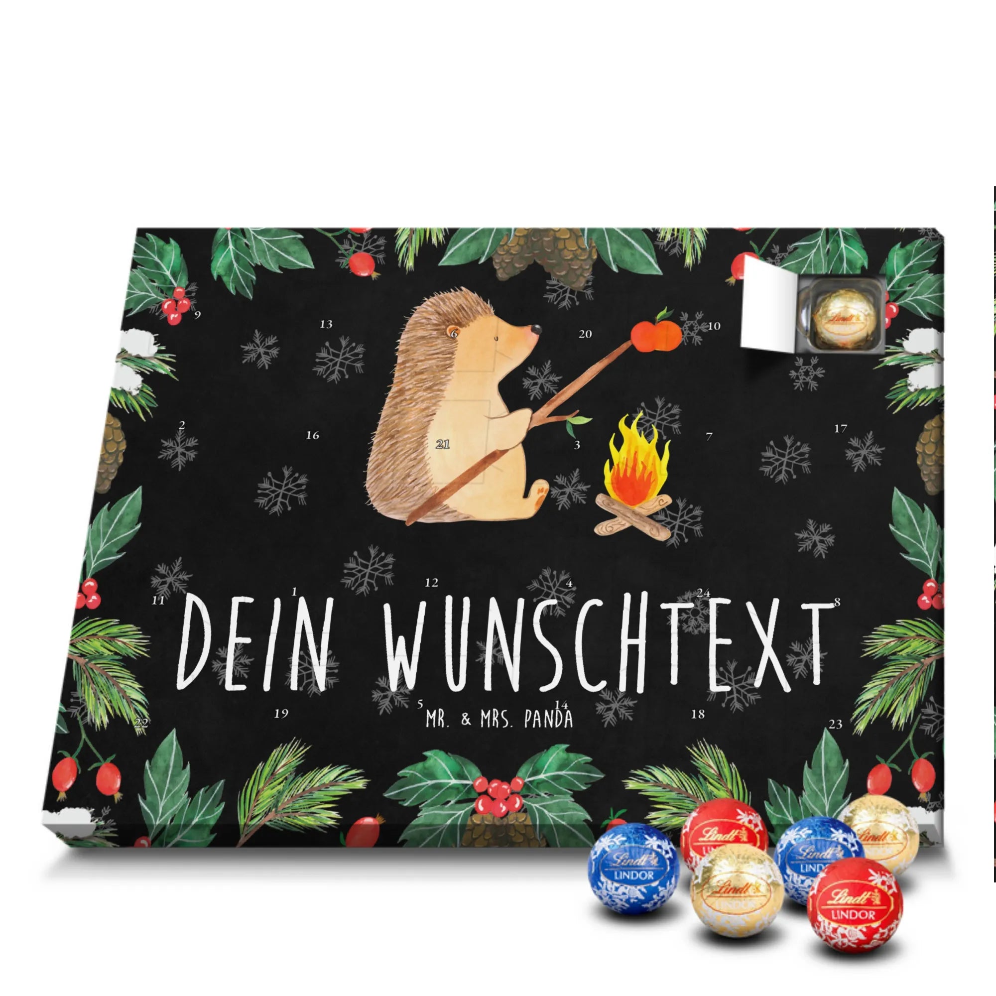 Personalisierter Schokoladen Adventskalender von Mr. & Mrs. Panda – perfekt für alle, die es süß und persönlich mögen. Unser Adventskalender ist mit liebevollen Illustrationen und charmanten Sprüchen von Mr. & Mrs. Panda bedruckt und kann mit deinem Namen oder Wunschtext individualisiert werden. Die brillante Druckqualität und die seidenmatte Oberflächenveredelung sorgen für ein edles Erscheinungsbild, zudem sind die Seitenflächen bedruckt. Maße: 233 mm x 178 mm x 24 mm. Du kannst den Kalender aufstellen oder aufhängen – je nachdem, wie du ihn am schönsten präsentierst. Gefüllt mit Lindt Lindor Schokolade: 24 einzeln verpackte Markenschokoladen Kugeln in drei köstlichen Sorten. Geschmacksrichtungen: Vollmilch, Feinherb und Weiße Schokolade. Zutaten: Zucker, pflanzliches Fett (Kokosnuss, Palmkern), Kakaobutter, Vollmilchpulver, Kakaomasse, Milchzucker, Magermilchpulver, Butterreinfett, Emulgator (Sojalecithin), Gerstenmalzextrakt, Aromen. Besondere Hinweise: Kann Haselnüsse und Mandeln enthalten. Ob als Advents-Überraschung für deine Liebsten oder als kleines Geschenk für Kollegen – dieser Kalender bringt personalisierten Genuss in die Vorweihnachtszeit.