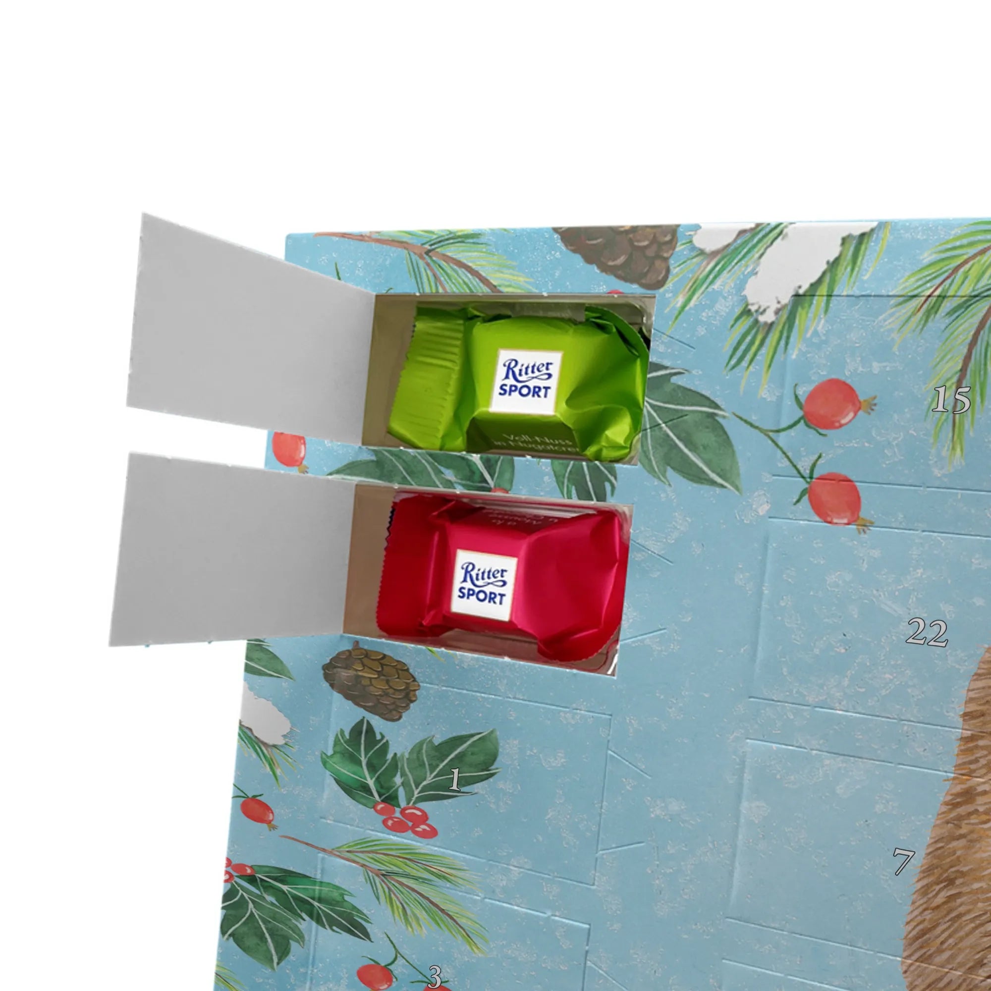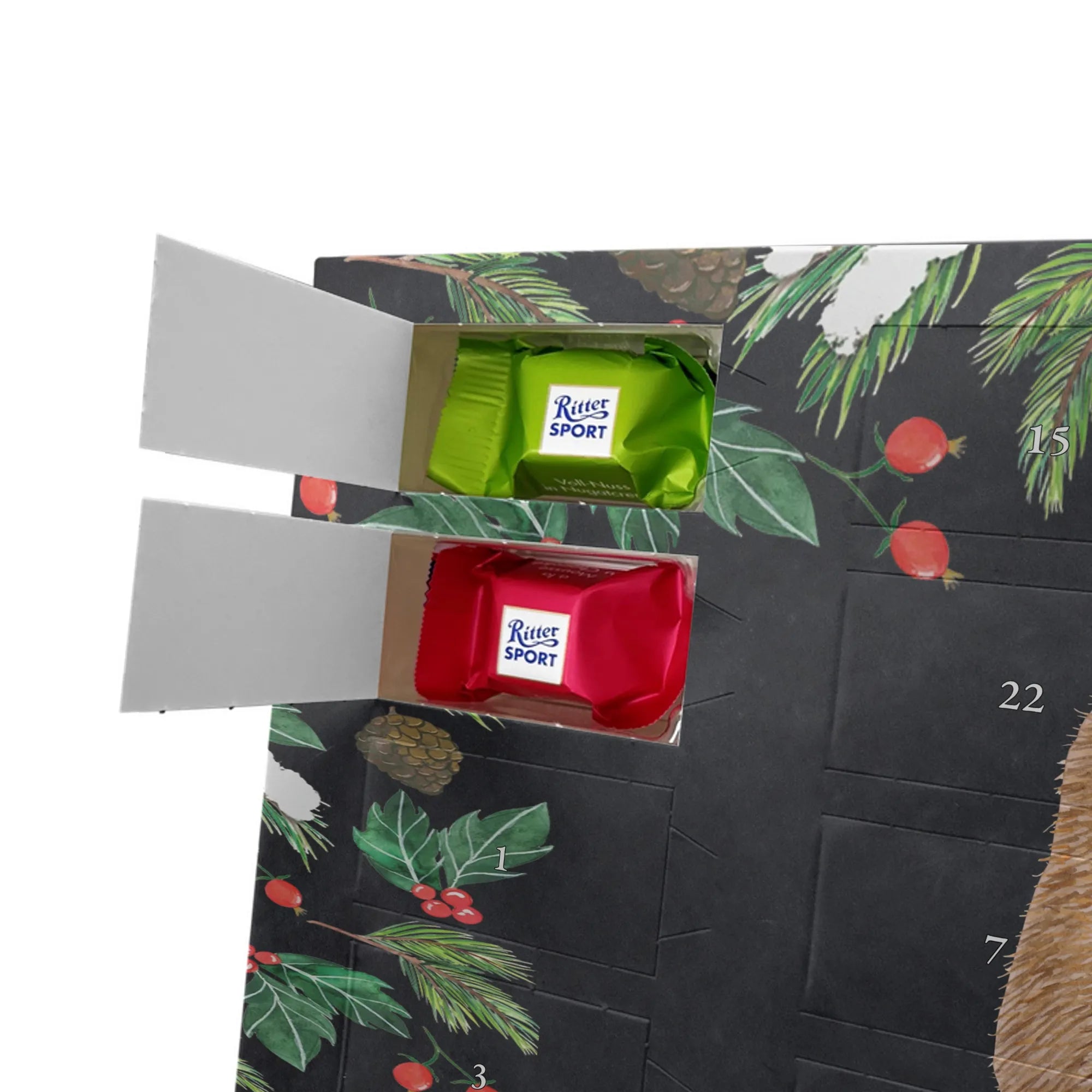 Liebevoll gestaltet und perfekt für persönliche Geschenke: unser Personalisierter Schoko Adventskalender von Mr. & Mrs. Panda macht die Adventszeit besonders süß. Du kannst jeden Kalender mit dem Namen oder einem kurzen Wunschtext individuell gestalten – so wird das Auspacken jeden Tag zu einem kleinen Highlight. Die Motive und Sprüche von Mr. & Mrs. Panda sind fröhlich und warmherzig, gedruckt in brillanter Qualität und veredelt mit einer seidenmatten Oberfläche, die dem Kalender eine hochwertige Anmutung verleiht. Auch die Seitenflächen sind bedruckt, damit das Design rundum überzeugt. Der Kalender ist flexibel: aufstellen oder aufhängen, ganz wie du möchtest. Gefüllt ist er mit Ritter Sport Schokowürfeln in beliebten Geschmacksrichtungen: Mousse au Chocolat, Schoko Crisp, Voll-Nuss in Nougatcreme, Karamell Duo, Joghurt und Erdbeer-Joghurt – jeden Tag ein anderes Geschmackserlebnis. Maße: 325 mm x 225 mm x 27 mm. Ein liebevolles Geschenk für Freundinnen, Freunde, Kinder oder Kolleginnen und Kollegen.