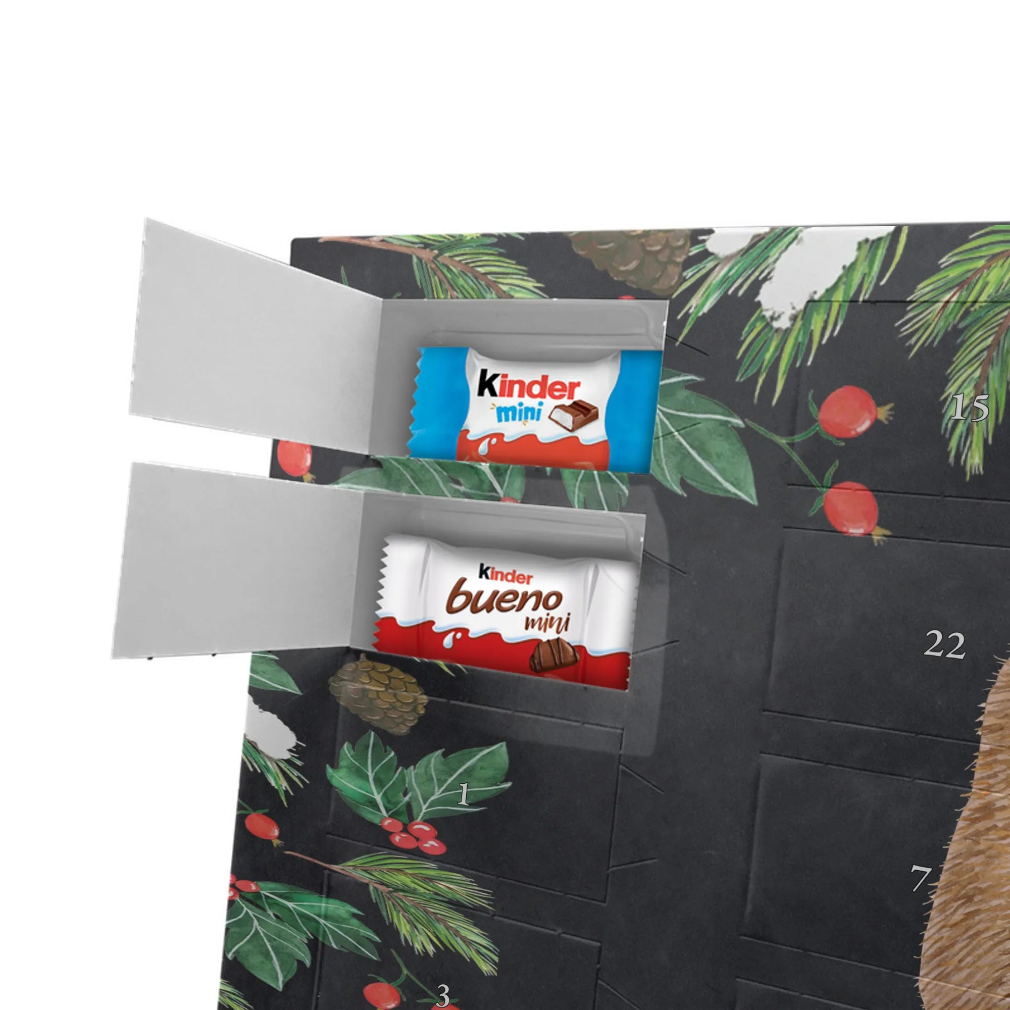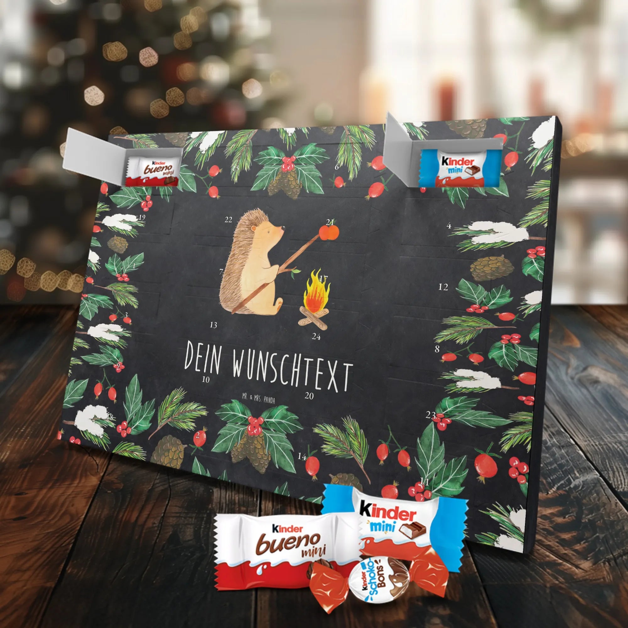 Feier die Vorfreude mit einem persönlichen Hingucker: unser Personalisierter Schoko Adventskalender von Mr. & Mrs. Panda. Dieser Kalender ist liebevoll mit wunderschönen Motiven & Sprüchen bedruckt und kann mit deinem Wunschnamen oder Wunschtext individualisiert werden – perfekt für eine persönliche Überraschung jeden Adventstag. Die brillante Druckqualität und die seidenmatte Oberflächenveredelung geben dem Kalender einen edlen Look, und die bedruckten Seitenflächen machen ihn rundum dekorativ. Besonders praktisch: der Kalender kann aufgehängt oder aufgestellt werden, je nachdem, wie du ihn präsentieren möchtest. Maße: 355 mm x 245 mm x 11 mm – ein ideales Format für dekorative Platzierung und genügend Raum für leckere Türchenüberraschungen. Gefüllt mit kinder® Schokolade: Adventskalender gefüllt mit kinder® Schokolade; Inhalt: kinder® Schoko-Bons, kinder® Bueno mini und kinder® Schokolade mini. Ob als Geschenk für Kinder, Partner oder beste Freunde – mit Mr. & Mrs. Panda verschenkst du nicht nur Süßes, sondern echte Vorfreude und liebevolle Gestaltung.
