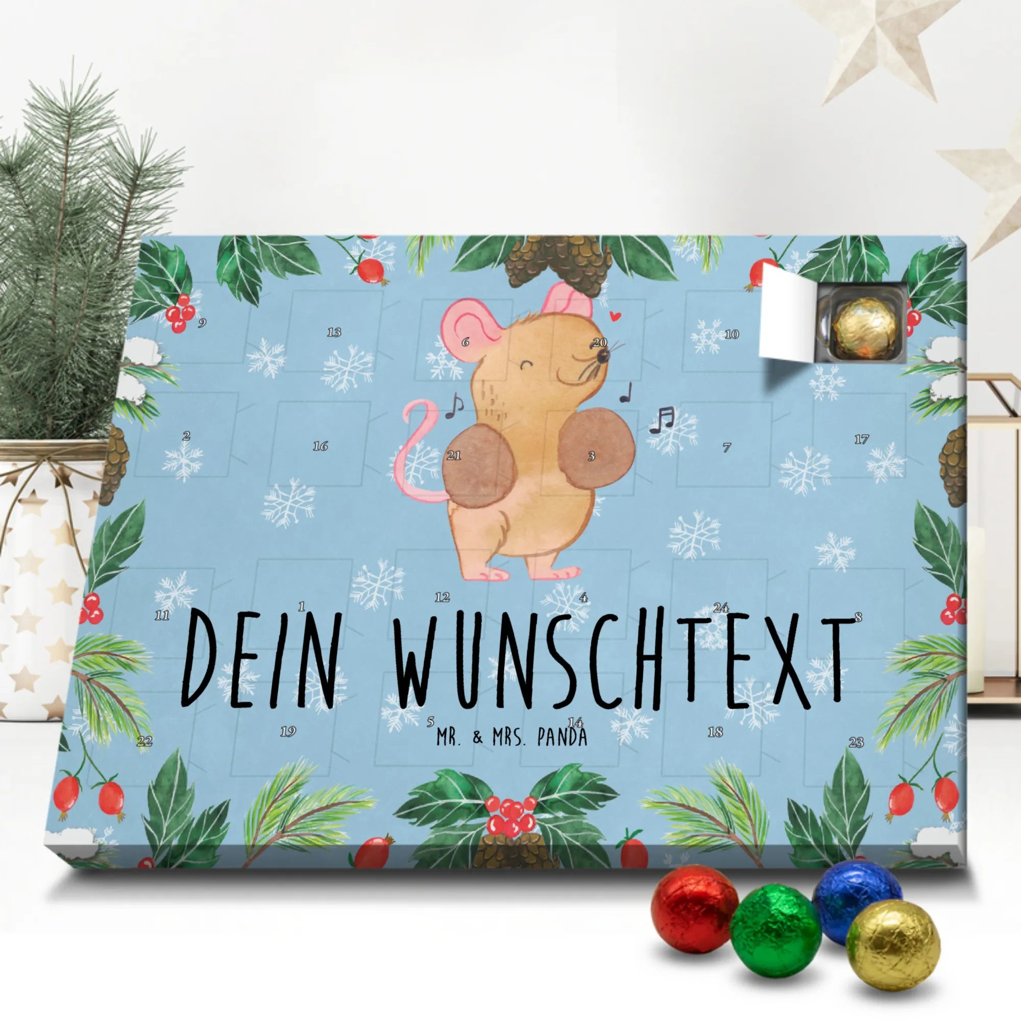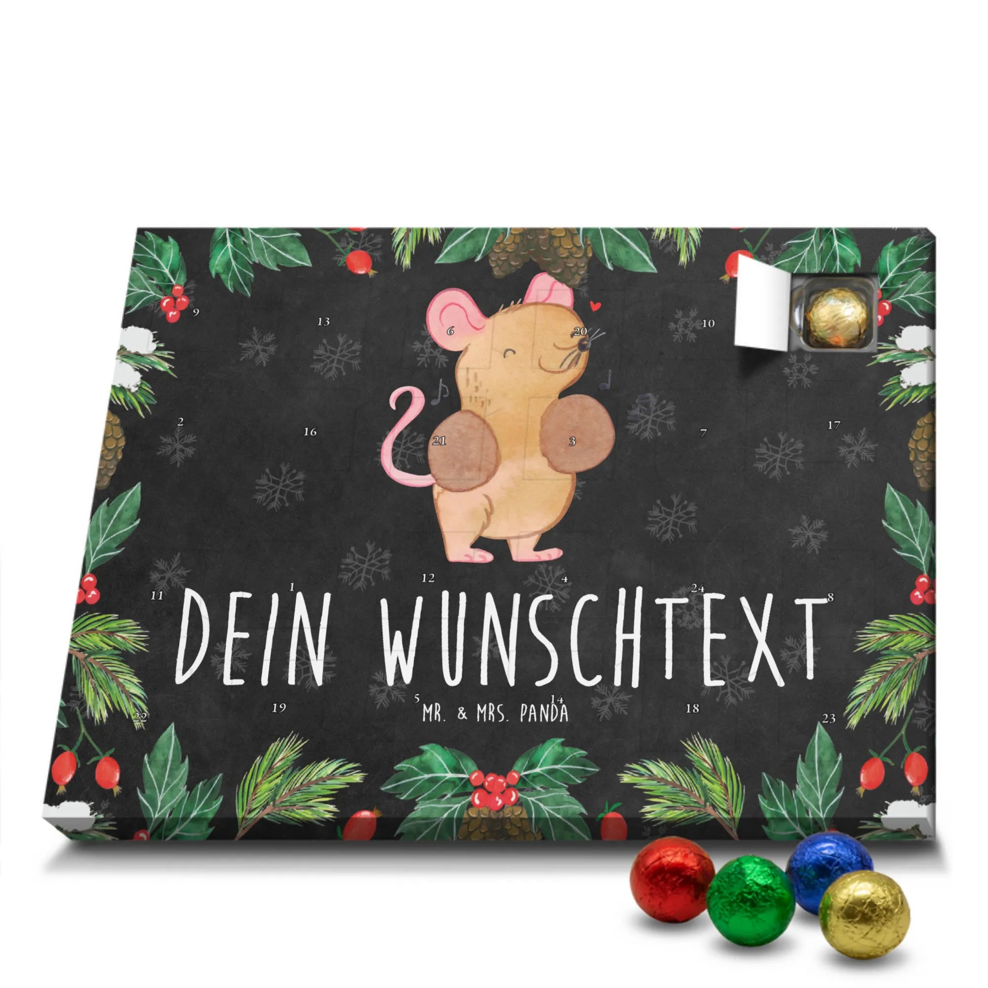 Mach die Adventszeit persönlich mit unserem Personalisierter Adventskalender mit Schokolade von Mr. & Mrs. Panda. Jeder Kalender ist liebevoll illustriert und bedruckt mit charmanten Sprüchen und Motiven – perfekt als Geschenk oder Deko für dein Zuhause. Du kannst deinen Wunschname oder einen kurzen Text hinzufügen, damit der Kalender ganz individuell wird. Die brillante Druckqualität und die seidenmatte Oberflächenveredelung sorgen für eine edle Optik, und auch die Seitenflächen sind komplett bedruckt. Maße: 233 mm x 178 mm x 24 mm. Die clevere Konstruktion erlaubt es, den Kalender aufzuhängen oder aufzustellen – flexibel und dekorativ zugleich. Gefüllt mit MARKENNAMEN Schokolade sowie köstlichen Schokoladenkugeln ist jeder Tag im Advent eine süße Überraschung. Wichtiger Hinweis: (Kann Spuren von Haselnüssen, Mandeln, Gluten und Soja enthalten!), kühl und trocken lagern! Egal ob für Kinder, Partner oder beste Freundin – dieser personalisierte Adventskalender bringt ein Lächeln und zaubert gemütliche Vorfreude. Bestell jetzt und gestalte deine Adventszeit mit einem Hauch Mr. & Mrs. Panda.