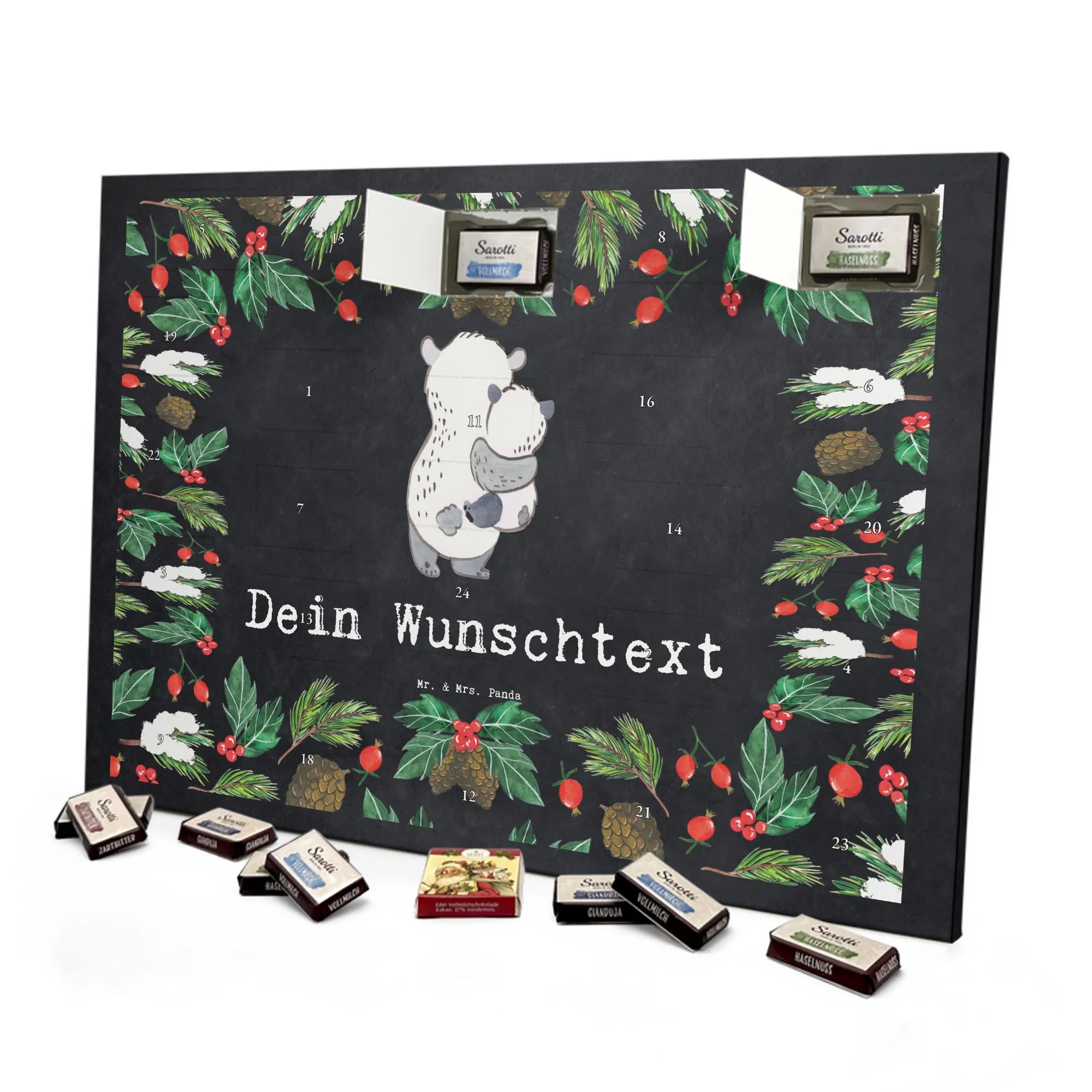🐼 PERSONALISIERTER SCHOKO-ADVENTSKALENDER: Mit Wunschtext, bedruckt mit Mr. & Mrs. Panda Motiven, gefüllt mit MARKENNAMEN Schokolade.