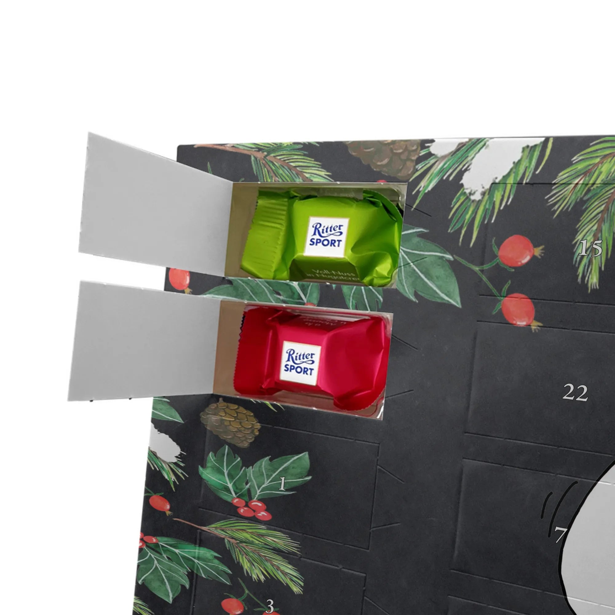 Suchst du einen besonderen Adventskalender, der persönlich und hochwertig ist? Unser Adventskalender mit Namen von Mr. & Mrs. Panda ist genau das – individualisierbar mit dem Namen deiner Liebsten oder einem kurzen Spruch und bedruckt mit unseren beliebten, charmanten Motiven. Die Druckqualität ist brillant, die seidenmatte Oberflächenveredelung verleiht dem Kalender eine elegante Haptik. Auch die Seitenflächen sind liebevoll bedruckt, sodass das Design rundum überzeugt. Du kannst den Kalender aufstellen oder an einer Stelle aufhängen, die du magst – die besondere Form macht beides möglich. Gefüllt ist der Kalender mit Ritter Sport Schokowürfeln in sechs beliebten Sorten: Mousse au Chocolat, Schoko Crisp, Voll-Nuss in Nougatcreme, Karamell Duo, Joghurt und Erdbeer-Joghurt. So gibt es hinter jedem Türchen eine kleine, leckere Überraschung. Maße: 325 mm x 225 mm x 27 mm – kompakt genug, um überall Platz zu finden, groß genug für 24 sorgfältig verpackte Schokowürfel.
