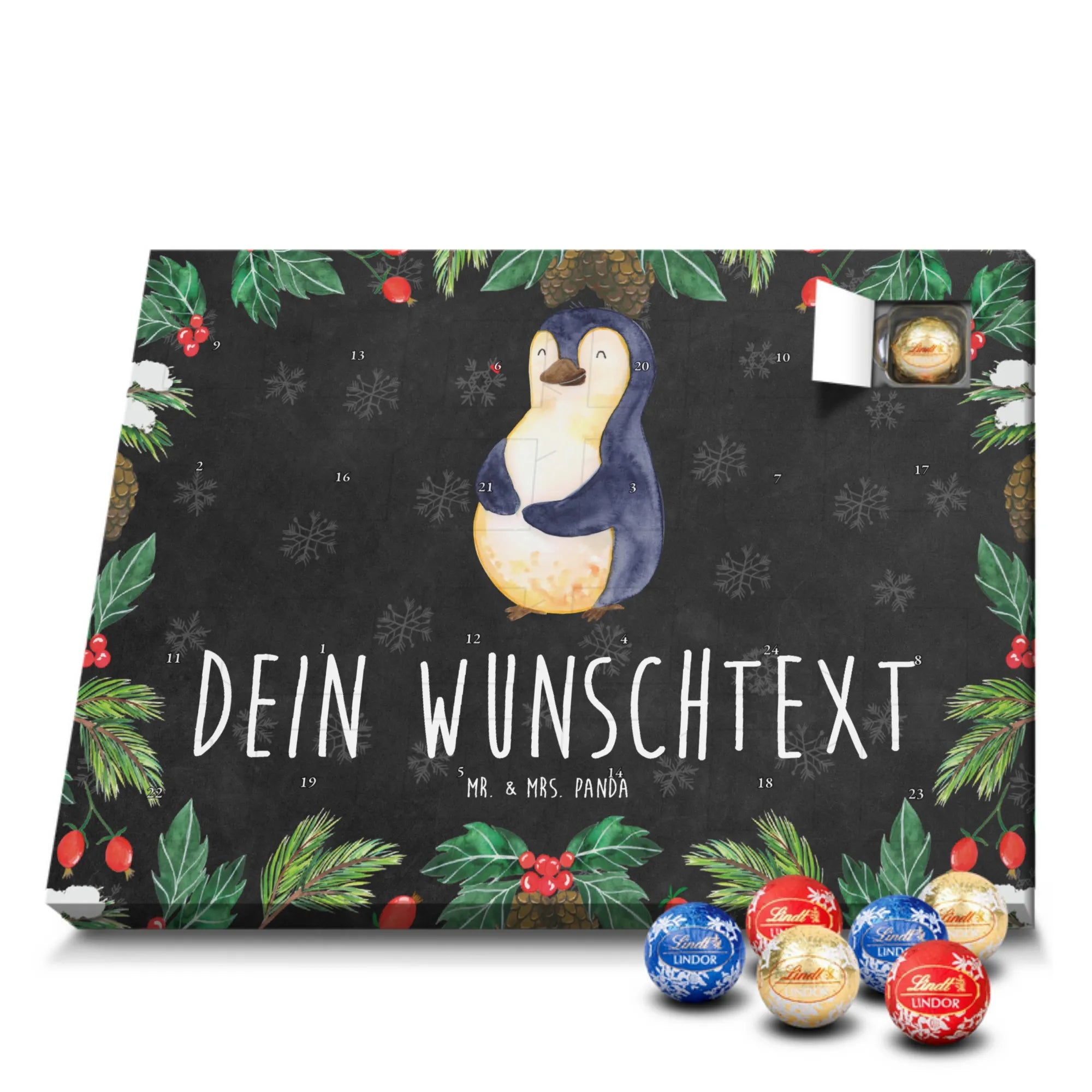 Personalisierter Schoko Adventskalender von Mr. & Mrs. Panda – der süße Countdown für dich oder deine Liebsten! Unser liebevoll gestalteter Adventskalender ist bedruckt mit wunderschönen Motiven und fröhlichen Sprüchen von Mr. & Mrs. Panda und lässt sich mit deinem Wunschnamen oder Wunschtext personalisieren. Die brillante Druckqualität kombiniert mit einer seidenmatten Oberflächenveredelung sorgt für ein edles Finish, zusätzlich sind die Seitenflächen bedruckt für ein durchgängiges Design. Maße: 233 mm x 178 mm x 24 mm. Der Kalender ist besonders praktisch: du kannst ihn entweder aufstellen oder an der Wand aufhängen – so passt er überall hin und verbreitet vorweihnachtliche Stimmung. Gefüllt mit Lindt Lindor Schokolade: 24 einzeln verpackte Markenschokoladen Kugeln in drei verschiedenen Sorten. Geschmacksrichtungen: Vollmilch, Feinherb und Weiße Schokolade. Zutaten: Zucker, pflanzliches Fett (Kokosnuss, Palmkern), Kakaobutter, Vollmilchpulver, Kakaomasse, Milchzucker, Magermilchpulver, Butterreinfett, Emulgator (Sojalecithin), Gerstenmalzextrakt, Aromen. Besondere Hinweise: Kann Haselnüsse und Mandeln enthalten. Dieser Adventskalender ist das perfekte Geschenk für Familien, Paare, Freunde oder für dich selbst – ein kleines tägliches Verwöhnmoment im Dezember. Bestell jetzt deinen personalisierten Schoko Adventskalender und zaubere ein Lächeln unter den Tannenbaum!