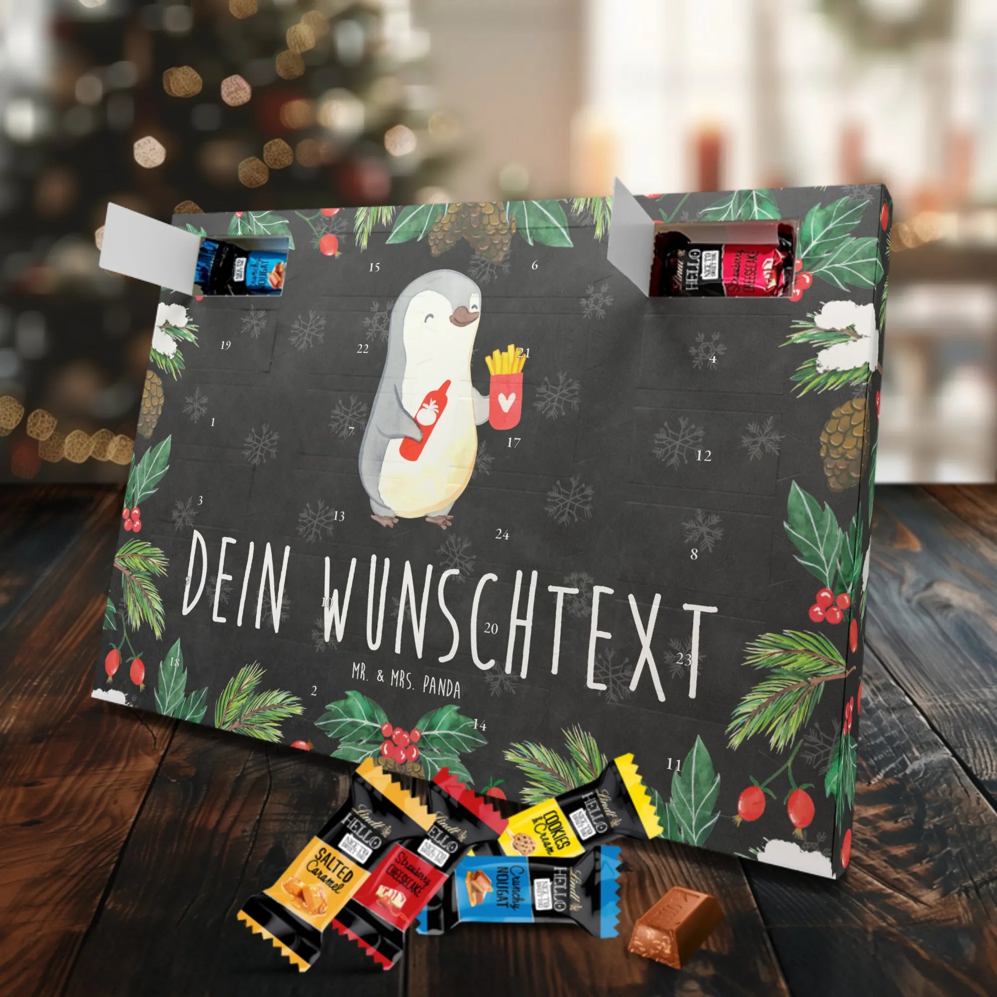 Personalisierter Schoko Adventskalender von Mr. & Mrs. Panda – der süße Countdown für dich oder deine Liebsten! Unser liebevoll gestalteter Adventskalender ist bedruckt mit wunderschönen Motiven und fröhlichen Sprüchen von Mr. & Mrs. Panda und lässt sich mit deinem Wunschnamen oder Wunschtext personalisieren. Die brillante Druckqualität kombiniert mit einer seidenmatten Oberflächenveredelung sorgt für ein edles Finish, zusätzlich sind die Seitenflächen bedruckt für ein durchgängiges Design. Maße: 233 mm x 178 mm x 24 mm. Der Kalender ist besonders praktisch: du kannst ihn entweder aufstellen oder an der Wand aufhängen – so passt er überall hin und verbreitet vorweihnachtliche Stimmung. Gefüllt mit Lindt Lindor Schokolade: 24 einzeln verpackte Markenschokoladen Kugeln in drei verschiedenen Sorten. Geschmacksrichtungen: Vollmilch, Feinherb und Weiße Schokolade. Zutaten: Zucker, pflanzliches Fett (Kokosnuss, Palmkern), Kakaobutter, Vollmilchpulver, Kakaomasse, Milchzucker, Magermilchpulver, Butterreinfett, Emulgator (Sojalecithin), Gerstenmalzextrakt, Aromen. Besondere Hinweise: Kann Haselnüsse und Mandeln enthalten. Dieser Adventskalender ist das perfekte Geschenk für Familien, Paare, Freunde oder für dich selbst – ein kleines tägliches Verwöhnmoment im Dezember. Bestell jetzt deinen personalisierten Schoko Adventskalender und zaubere ein Lächeln unter den Tannenbaum!