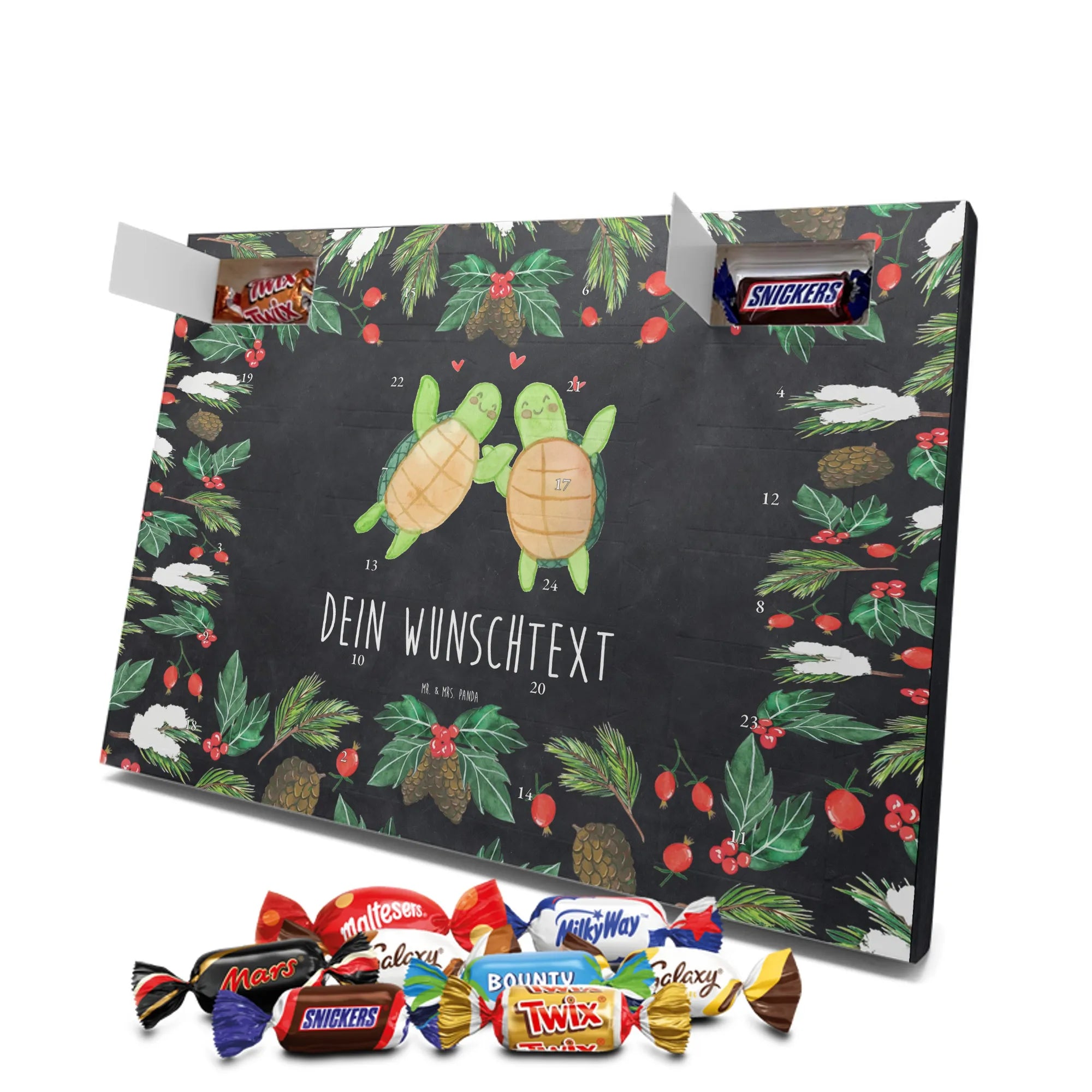 Personalisierter Schoko-Adventskalender von Mr. & Mrs. Panda – liebevoll gestaltet und ideal als individuelles Geschenk in der Adventszeit. Wir bedrucken den Kalender mit zauberhaften Motiven & herzlichen Sprüchen und personalisieren ihn mit deinem Wunschnamen oder Wunschtext. Die hochwertige Druckqualität kombiniert mit einer seidenmatten Oberflächenveredelung sorgt für ein edles Erscheinungsbild, und die bedruckten Seitenflächen geben dem Motiv zusätzlichen Charme. Der Kalender kann aufgehängt oder aufgestellt werden, sodass du ihn flexibel platzieren kannst. Gefüllt ist der Kalender mit Celebrations, die 24 hochwertige Überraschungen in 8 verschiedenen Sorten beinhalten: Maltesers, Mars, Snickers, Twix, Milky Way, Bounty, Galaxy und Galaxy Caramel. Maße: 325 mm x 225 mm x 27 mm – handlich und doch großzügig für die kleinen Leckereien hinter den Türchen. Ob für Kinder, Partner oder beste Freunde: dieser personalisierte Schoko-Adventskalender macht das Warten auf Weihnachten bunter und leckerer. Verschenke eine persönliche Erinnerung und jeden Tag ein kleines Schokoladen-Glück!