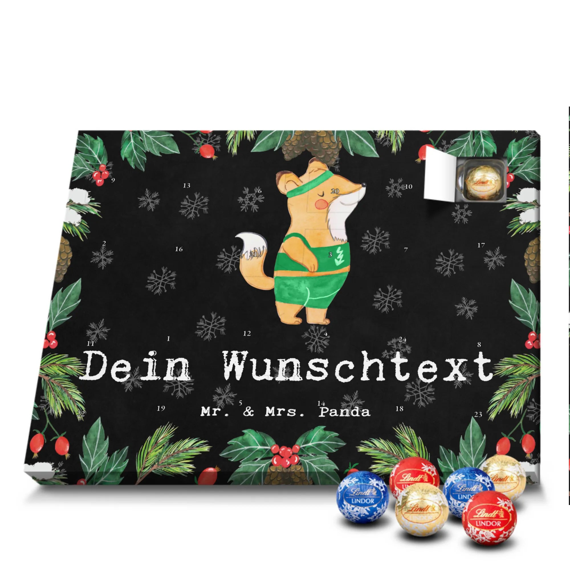 Personalisierter Schoko Adventskalender von Mr. & Mrs. Panda – der süße Countdown für dich oder deine Liebsten! Unser liebevoll gestalteter Adventskalender ist bedruckt mit wunderschönen Motiven und fröhlichen Sprüchen von Mr. & Mrs. Panda und lässt sich mit deinem Wunschnamen oder Wunschtext personalisieren. Die brillante Druckqualität kombiniert mit einer seidenmatten Oberflächenveredelung sorgt für ein edles Finish, zusätzlich sind die Seitenflächen bedruckt für ein durchgängiges Design. Maße: 233 mm x 178 mm x 24 mm. Der Kalender ist besonders praktisch: du kannst ihn entweder aufstellen oder an der Wand aufhängen – so passt er überall hin und verbreitet vorweihnachtliche Stimmung. Gefüllt mit Lindt Lindor Schokolade: 24 einzeln verpackte Markenschokoladen Kugeln in drei verschiedenen Sorten. Geschmacksrichtungen: Vollmilch, Feinherb und Weiße Schokolade. Zutaten: Zucker, pflanzliches Fett (Kokosnuss, Palmkern), Kakaobutter, Vollmilchpulver, Kakaomasse, Milchzucker, Magermilchpulver, Butterreinfett, Emulgator (Sojalecithin), Gerstenmalzextrakt, Aromen. Besondere Hinweise: Kann Haselnüsse und Mandeln enthalten. Dieser Adventskalender ist das perfekte Geschenk für Familien, Paare, Freunde oder für dich selbst – ein kleines tägliches Verwöhnmoment im Dezember. Bestell jetzt deinen personalisierten Schoko Adventskalender und zaubere ein Lächeln unter den Tannenbaum!