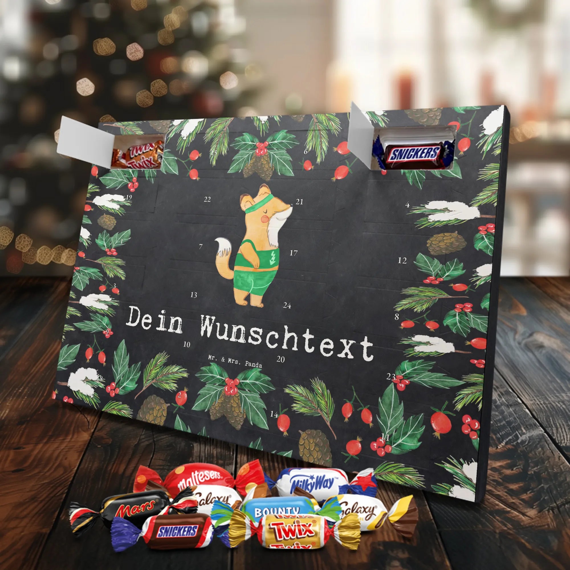 Mach die Adventszeit persönlich mit unserem Personalisierter Adventskalender mit Schokolade von Mr. & Mrs. Panda. Jeder Kalender ist liebevoll illustriert und bedruckt mit charmanten Sprüchen und Motiven – perfekt als Geschenk oder Deko für dein Zuhause. Du kannst deinen Wunschname oder einen kurzen Text hinzufügen, damit der Kalender ganz individuell wird. Die brillante Druckqualität und die seidenmatte Oberflächenveredelung sorgen für eine edle Optik, und auch die Seitenflächen sind komplett bedruckt. Maße: 233 mm x 178 mm x 24 mm. Die clevere Konstruktion erlaubt es, den Kalender aufzuhängen oder aufzustellen – flexibel und dekorativ zugleich. Gefüllt mit MARKENNAMEN Schokolade sowie köstlichen Schokoladenkugeln ist jeder Tag im Advent eine süße Überraschung. Wichtiger Hinweis: (Kann Spuren von Haselnüssen, Mandeln, Gluten und Soja enthalten!), kühl und trocken lagern! Egal ob für Kinder, Partner oder beste Freundin – dieser personalisierte Adventskalender bringt ein Lächeln und zaubert gemütliche Vorfreude. Bestell jetzt und gestalte deine Adventszeit mit einem Hauch Mr. & Mrs. Panda.