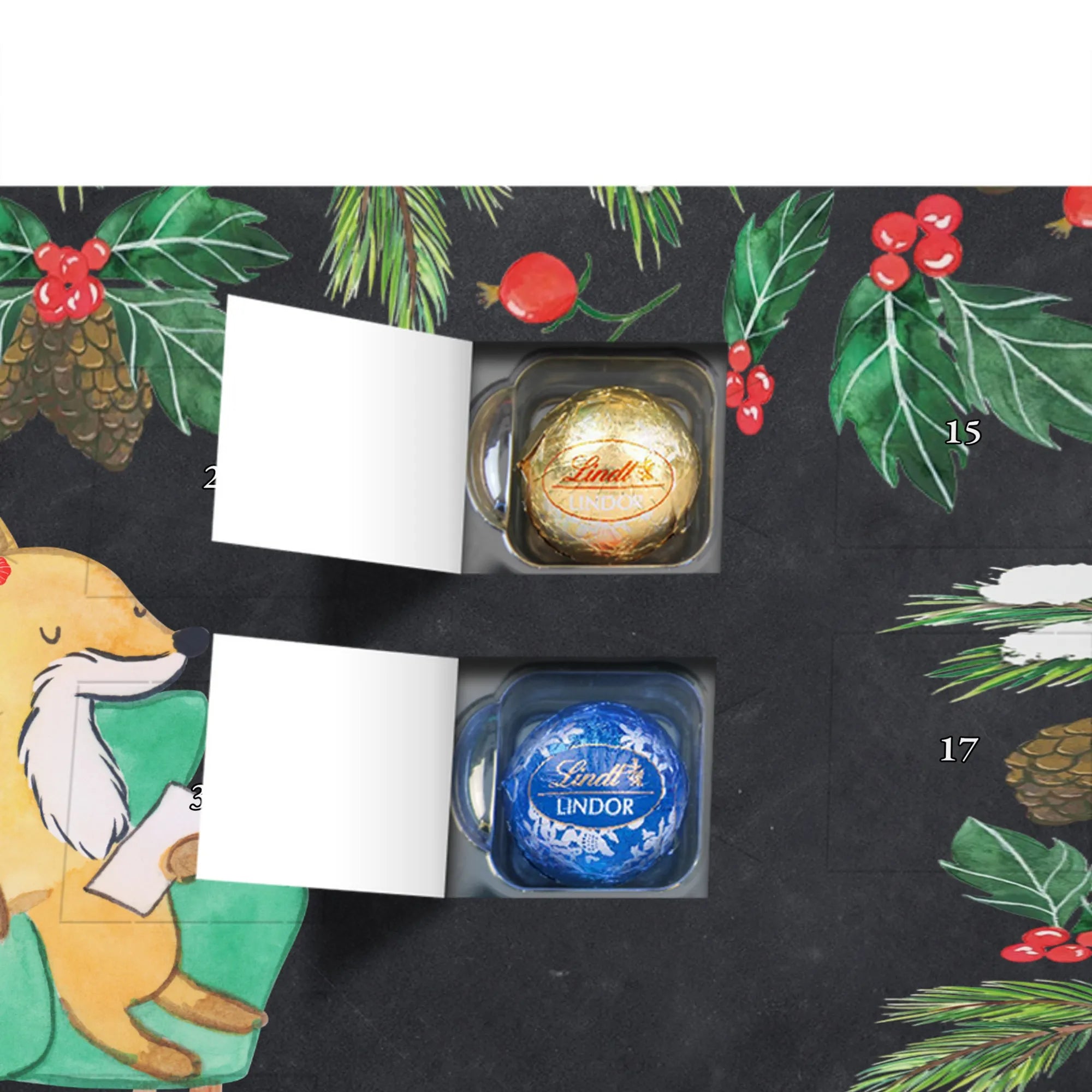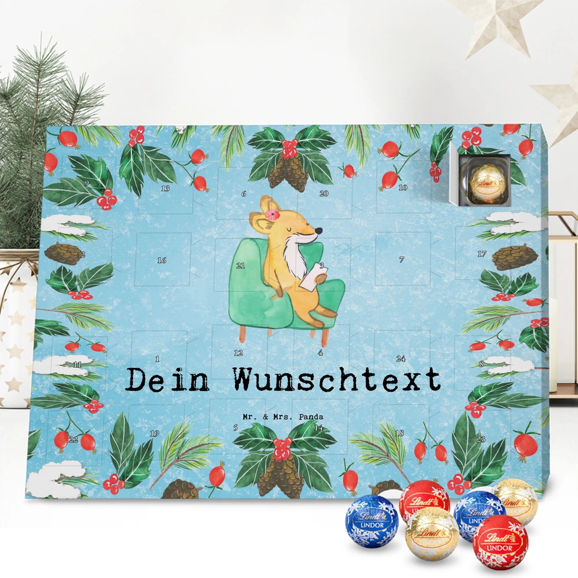 Personalisierter Schoko-Adventskalender von Mr. & Mrs. Panda – dein persönlicher Begleiter bis Weihnachten! Dieser zauberhafte Adventskalender ist bedruckt mit liebevollen Motiven und witzigen Sprüchen von Mr. & Mrs. Panda und lässt sich ganz einfach mit deinem Wunschtext oder Namen individualisieren. Die brillante Druckqualität in Kombination mit einer seidenmatten Oberflächenveredelung verleiht dem Kalender eine hochwertige Optik; auch die Seitenflächen sind bedruckt für ein rundum schönes Erscheinungsbild. Maße: 233 mm x 178 mm x 24 mm. Besonders praktisch: Du kannst den Kalender aufstellen oder an die Wand hängen – je nachdem, wo er am besten wirkt. Gefüllt mit Lindt Lindor Schokolade: 24 einzeln verpackte Markenschokoladen Kugeln in drei leckeren Sorten. Geschmacksrichtungen: Vollmilch, Feinherb und Weiße Schokolade. Zutaten: Zucker, pflanzliches Fett (Kokosnuss, Palmkern), Kakaobutter, Vollmilchpulver, Kakaomasse, Milchzucker, Magermilchpulver, Butterreinfett, Emulgator (Sojalecithin), Gerstenmalzextrakt, Aromen. Besondere Hinweise: Kann Haselnüsse und Mandeln enthalten. Ideal als Geschenk für Kinder, Partner oder beste Freunde – ein täglicher Schoko-Moment mit persönlicher Note.