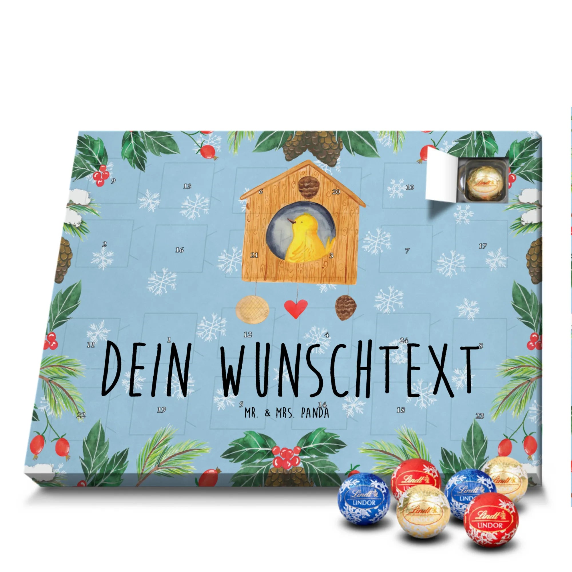 Personalisierter Schoko Adventskalender von Mr. & Mrs. Panda – der süße Countdown für dich oder deine Liebsten! Unser liebevoll gestalteter Adventskalender ist bedruckt mit wunderschönen Motiven und fröhlichen Sprüchen von Mr. & Mrs. Panda und lässt sich mit deinem Wunschnamen oder Wunschtext personalisieren. Die brillante Druckqualität kombiniert mit einer seidenmatten Oberflächenveredelung sorgt für ein edles Finish, zusätzlich sind die Seitenflächen bedruckt für ein durchgängiges Design. Maße: 233 mm x 178 mm x 24 mm. Der Kalender ist besonders praktisch: du kannst ihn entweder aufstellen oder an der Wand aufhängen – so passt er überall hin und verbreitet vorweihnachtliche Stimmung. Gefüllt mit Lindt Lindor Schokolade: 24 einzeln verpackte Markenschokoladen Kugeln in drei verschiedenen Sorten. Geschmacksrichtungen: Vollmilch, Feinherb und Weiße Schokolade. Zutaten: Zucker, pflanzliches Fett (Kokosnuss, Palmkern), Kakaobutter, Vollmilchpulver, Kakaomasse, Milchzucker, Magermilchpulver, Butterreinfett, Emulgator (Sojalecithin), Gerstenmalzextrakt, Aromen. Besondere Hinweise: Kann Haselnüsse und Mandeln enthalten. Dieser Adventskalender ist das perfekte Geschenk für Familien, Paare, Freunde oder für dich selbst – ein kleines tägliches Verwöhnmoment im Dezember. Bestell jetzt deinen personalisierten Schoko Adventskalender und zaubere ein Lächeln unter den Tannenbaum!