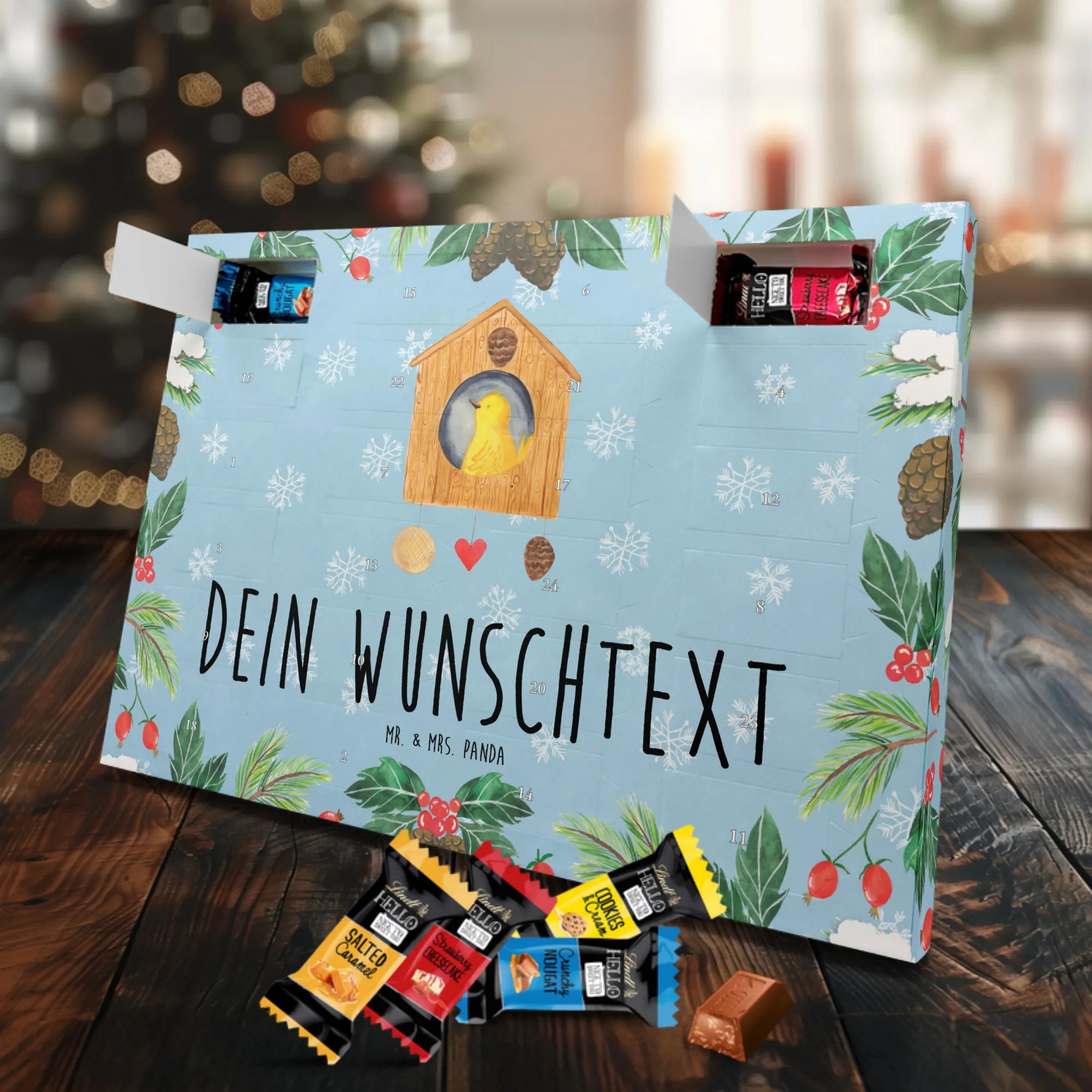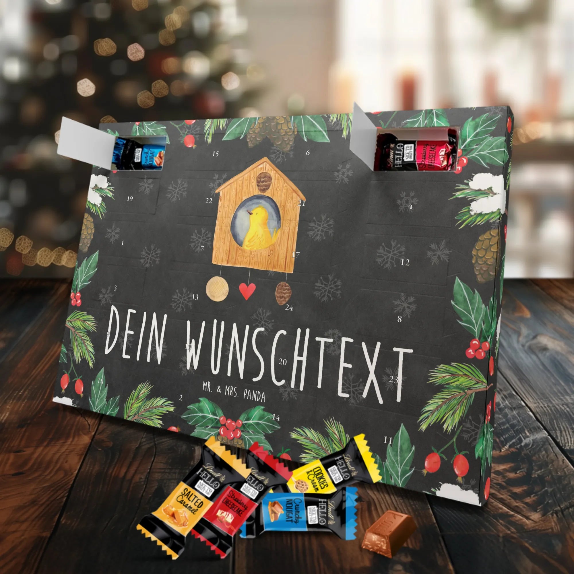 Personalisierter Adventskalender mit Schokolade – das Geschenk, das von Herzen kommt. Mr. & Mrs. Panda haben für dich einen Adventskalender gestaltet, der nicht nur mit süßen Überraschungen gefüllt ist, sondern auch optisch überzeugt: bedruckte Seitenflächen, charmante Motive und Sprüche sowie eine seidenmatte Oberflächenveredelung für edles Finish. Du kannst den Kalender mit deinem Wunschnamen oder Wunschtext personalisieren – ideal als Geschenk für die beste Freundin, Familie oder Kinder. Er kann aufgehängt oder einfach aufgestellt werden, je nachdem, wie du ihn präsentieren möchtest. Gefüllt mit Lindt Hello: 24 einzeln verpackte Schokoladen Mini Sticks in den Sorten Karamell-Schokoladenkuchen, Kekse, Knuspriger Nougat und Erdbeer-Cheesecake. Bitte beachte die Zutaten und Allergenhinweise (Milcheiweiß, Milchzucker, Soja, Weizen, Haselnüsse; kann Mandeln und andere Schalenfrüchte enthalten). Die brillante Druckqualität macht dein Design besonders lebendig. Maße: 325 mm x 225 mm x 27 mm – handliche Größe für jede Dekoration.