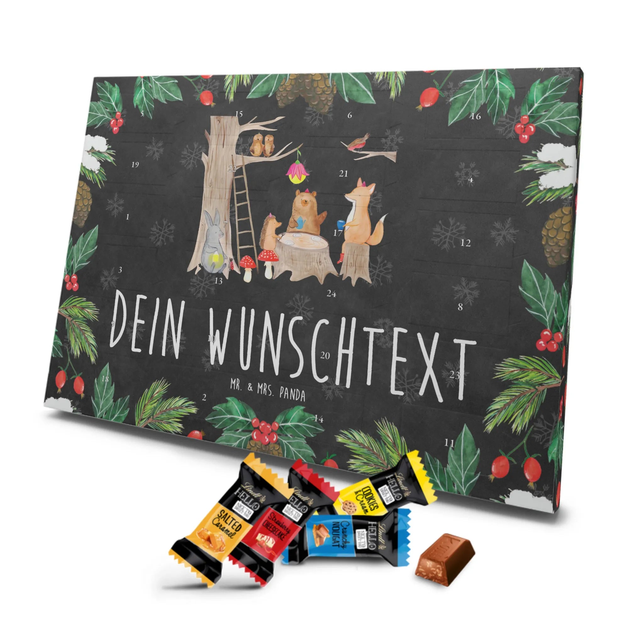 Warum du ihn liebst: Charmantes Waldmotiv, persönliche Namensoption, leckere Markenschokolade und hochwertige Verarbeitung – ein Adventskalender mit Herz von Mr. & Mrs. Panda.