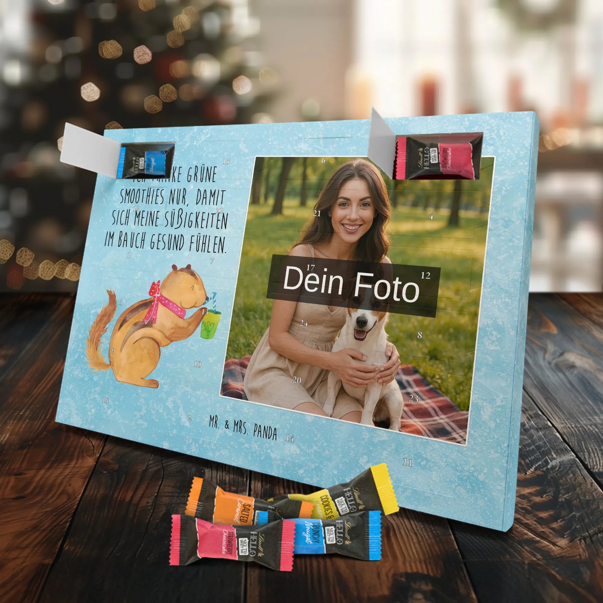 Verschenke Vorfreude: Unser individueller Foto-Adventskalender mit Schokolade von Mr. & Mrs. Panda macht jeden Dezembertag zum kleinen Fest. Der Kalender kombiniert bezaubernde Illustrationen und Sprüche von Mr. & Mrs. Panda mit deinem eigenen Foto – so entsteht ein ganz persönliches Geschenk. Achte auf Bildqualität und Bildausschnitt, damit das Foto optimal zur Geltung kommt, und nutze nur Bilder, für die du die Rechte besitzt. Die hochwertige seidenmatte Oberfläche mit bedruckten Seitenflächen veredelt das Design. Maße: 325 mm x 225 mm x 27 mm. Gefüllt mit Lindt Hello Schokolade: 24 einzeln verpackte Mini Sticks in den Sorten Karamell-Schokoladenkuchen, Kekse, Knuspriger Nougat und Erdbeer-Cheesecake. Zutaten und Allergene findest du auf der Verpackung; enthalten sind z. B. Milcheiweiß, Milchzucker, Soja, Weizen und Haselnüsse. Besonderheit: Du kannst den Kalender aufstellen oder an der Wand aufhängen. Bitte beachten: Die Fotos werden weder aufbereitet noch zugeschnitten – personalisierte Foto-Artikel sind vom Rückgaberecht ausgeschlossen. Hol dir ein Stück Adventszauber mit deinem persönlichen Foto-Adventskalender!