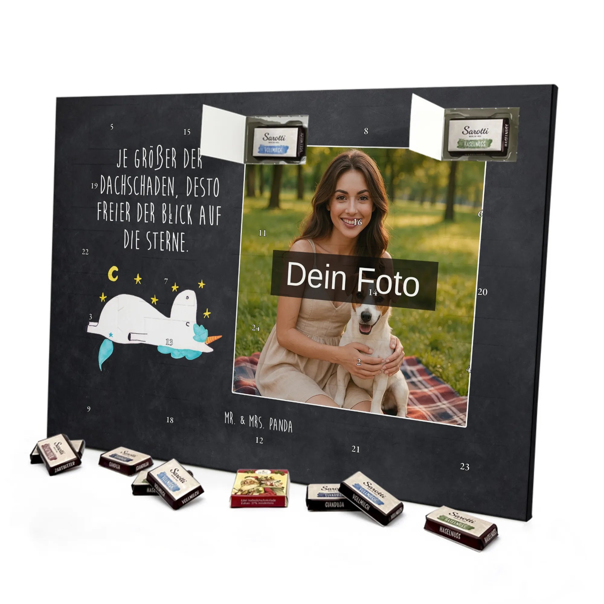 Suchst du ein besonderes Geschenk, das persönlich, zauberhaft und voller Vorfreude ist? Unser Personalisierter Schoko Foto Adventskalender aus der Einhorn - Kollektion von Mr. & Mrs. Panda vereint ein liebevoll handgezeichnetes Einhornmotiv mit deiner eigenen Lieblingsfoto-Erinnerung. Das süße Einhorn blickt verträumt in den Sternenhimmel und trägt den frechen Spruch: „Je größer der Dachschaden, desto freier der Blick auf die Sterne.“ – perfekt für alle, die das Besondere lieben.