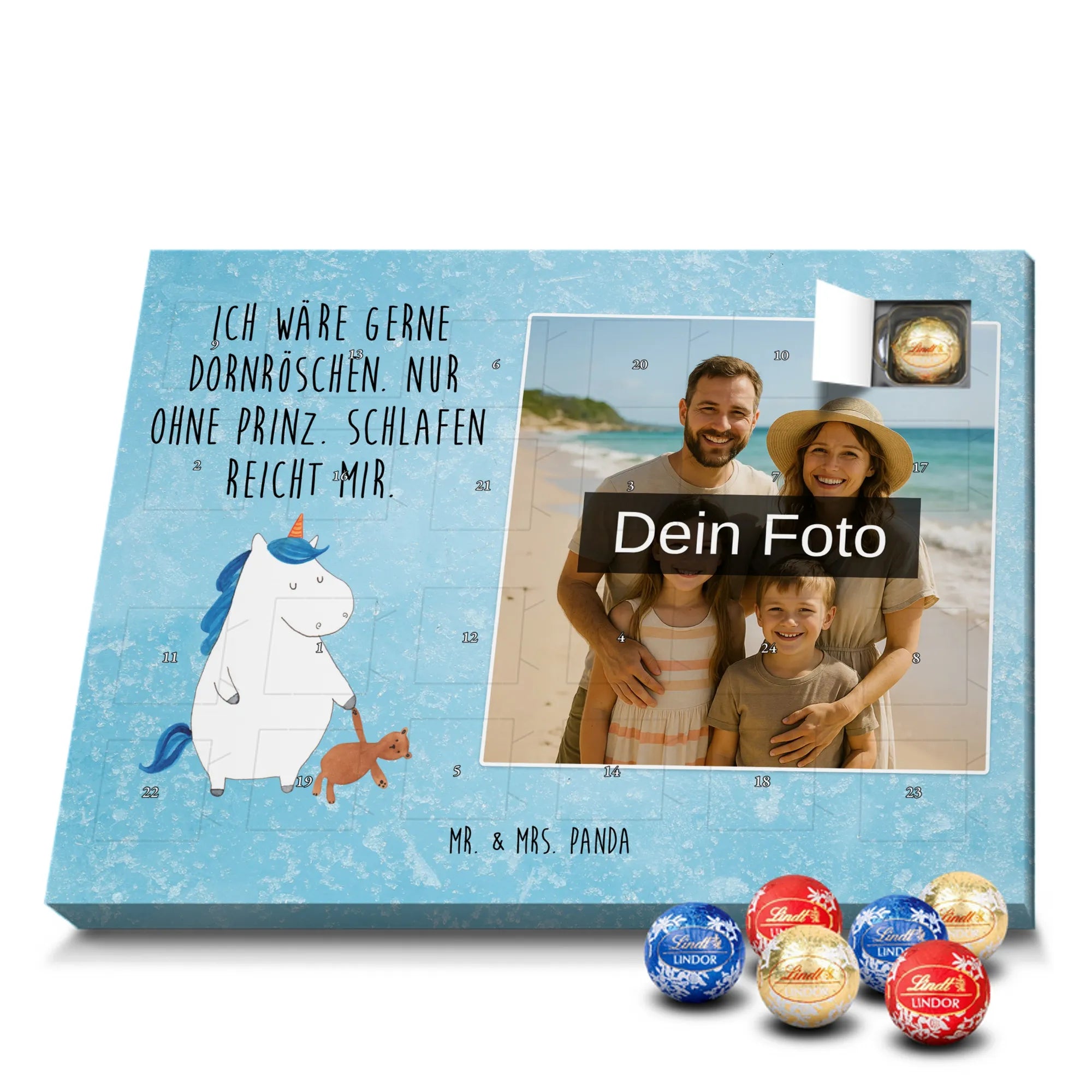 Wunderschöner Personalisierter Schoko Foto Adventskalender von Mr. & Mrs. Panda – perfekt zum Verschenken oder zum Verwöhnen. Dieser Adventskalender verbindet liebevolle Mr. & Mrs. Panda-Motive und Sprüche mit deinem persönlichen Foto auf der Vorderseite. Die hochwertige Verarbeitung mit seidenmatter Oberflächenveredelung sorgt für brillante Farben und eine edle Haptik, die man gerne anfasst. Bedruckte Seitenflächen und die stabile Ausführung machen den Kalender zum echten Hingucker in der Adventszeit. Bitte achte auf eine hohe Auflösung deines Fotos, damit das Druckergebnis klar und scharf wird, und wähle einen passenden Bildausschnitt, damit keine wichtigen Details abgeschnitten werden. Lade nur Bilder hoch, bei denen du die Rechte besitzt oder die Erlaubnis hast, besonders bei Fotos mit Personen. Wichtig: Die Fotos werden weder aufbereitet noch zugeschnitten – eine Rücknahme bei personalisierten Foto-Artikeln ist ausgeschlossen. Der Kalender kann aufgehängt oder aufgestellt werden, so wie es dir gefällt. Maße: 233 mm x 178 mm x 24 mm. Gefüllt mit Lindt Lindor Markenschokolade: 24 einzeln verpackte Markenschokoladen Kugeln in drei Sorten (Vollmilch, Feinherb, Weiße Schokolade). Zutatenhinweis: Kann Haselnüsse und Mandeln enthalten. Ein liebevoller, personalisierter Adventsmoment von Mr. & Mrs. Panda.
