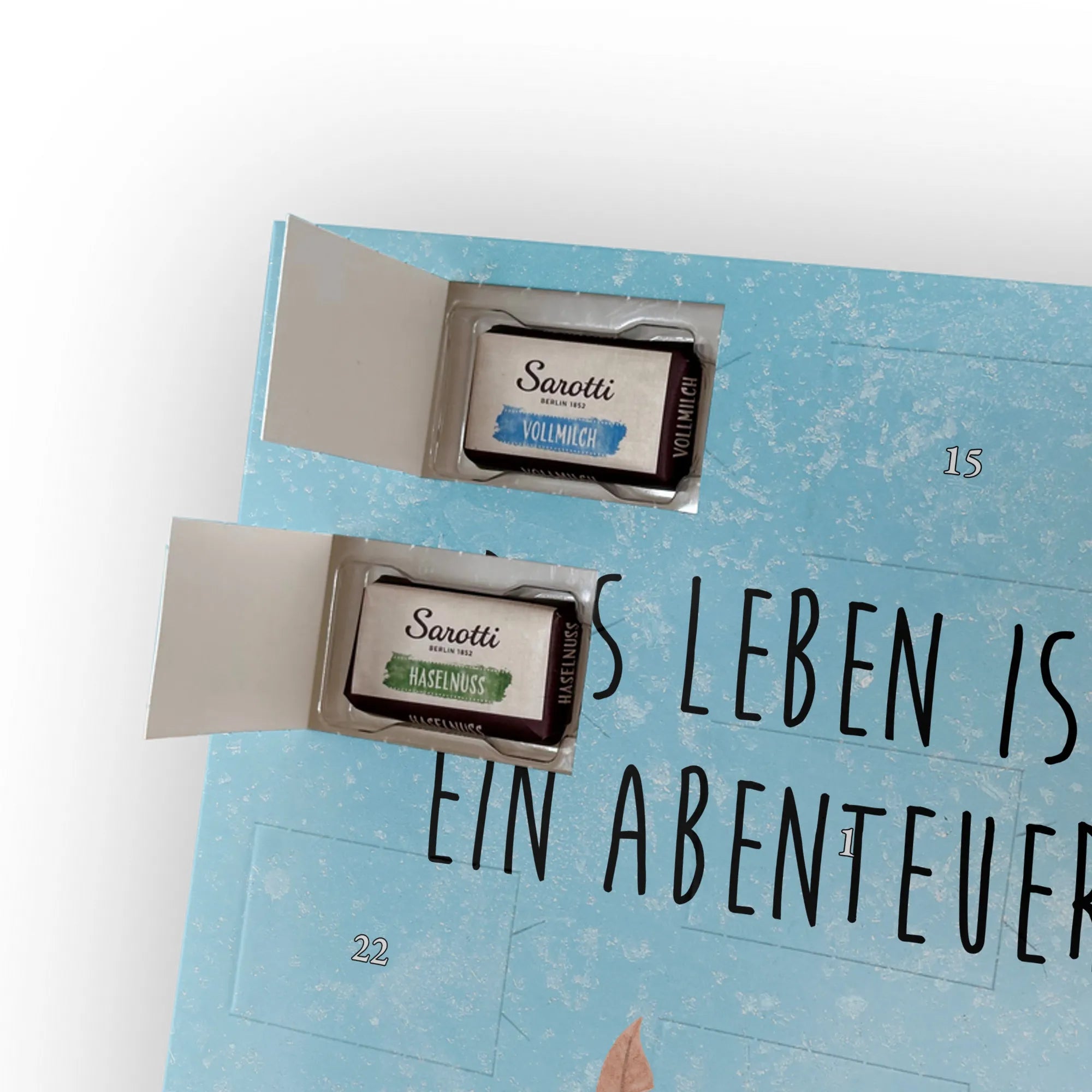 Doch was wäre ein Adventskalender ohne den Genuss? Im Inneren verbirgt sich eine hochwertige Füllung aus 107 g feinster Markenschokolade von Sarotti und Confiserie Heidel. In 24 Türchen entdeckst du vier köstliche Geschmacksrichtungen: Vollmilch, Nougat, Zartbitter und Haselnuss. Jedes einzelne Täfelchen ist ein kleiner Moment des Glücks. 🍫