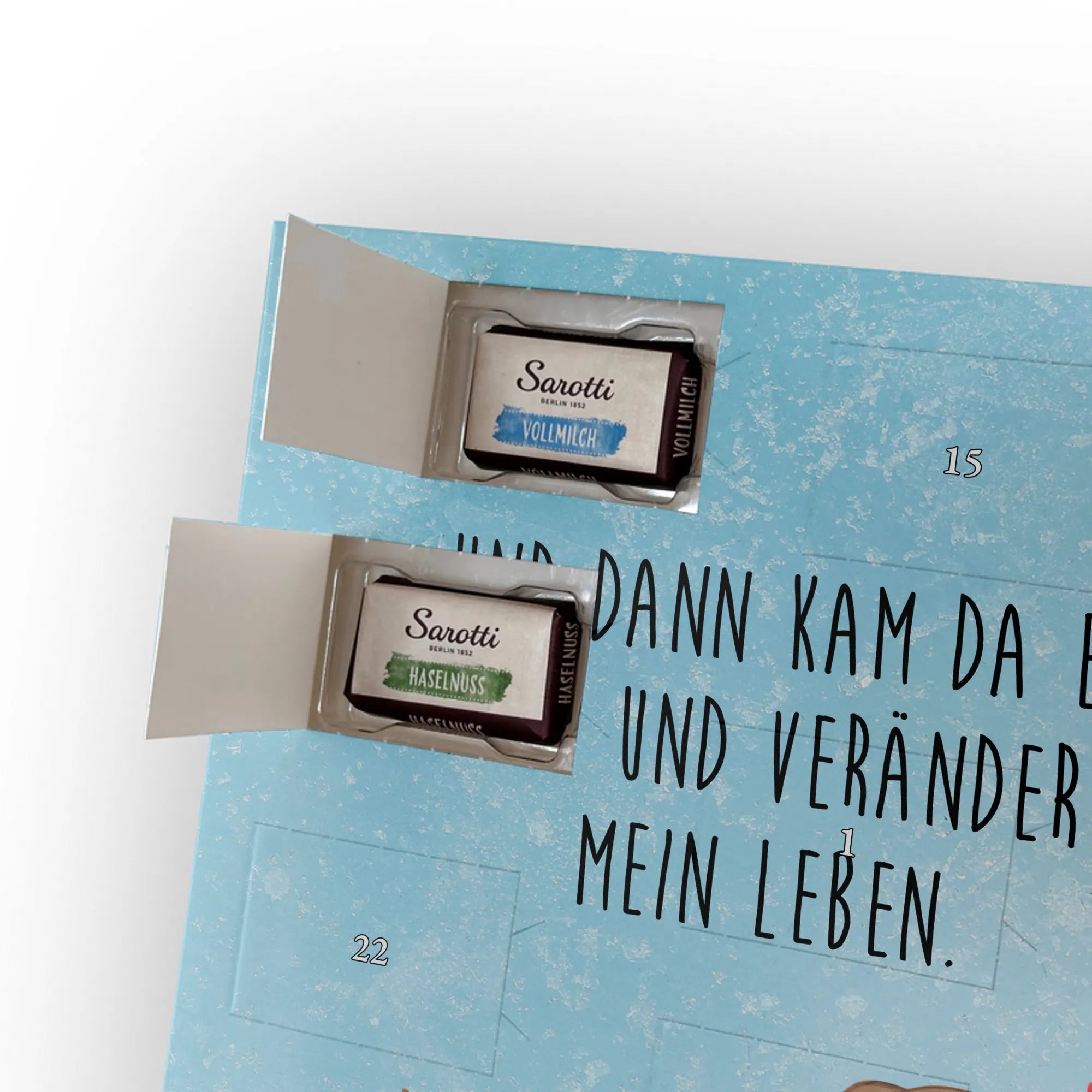 Schoko Foto Adventskalender personalisiert – ein zauberhaftes Geschenk, das Erinnerungen und Geschmack vereint. Mr. & Mrs. Panda haben liebevolle Motive und Sprüche gestaltet, die den Kalender umrahmen; dein Foto setzt die persönliche Note. Für ein optimales Druckbild lade bitte ein Foto mit hoher Auflösung hoch und achte auf einen passenden Bildausschnitt, damit wichtige Details nicht abgeschnitten werden. Bitte nur Bilder verwenden, für die du die Rechte besitzt. Die seidenmatte Oberflächenveredelung sorgt für edle Haptik und die bedruckten Seitenflächen für ein rundum gelungenes Design. Maße: 355 mm x 245 mm x 11 mm – kann aufgehängt oder aufgestellt werden. Wichtiger Hinweis: Wir bearbeiten oder schneiden die Fotos nicht nach; eine Rücknahme personalisierter Foto Artikel ist ausgeschlossen. Gefüllt mit 24 einzeln verpackten Schokoladentäfelchen in den Geschmacksrichtungen Vollmilch, Nougat, Zartbitter und Haselnuss von Sarotti® und Confiserie Heidel®. Insgesamt enthält der Kalender 107 g Markenschokolade. Ideal als Geschenk für Partner, Familie oder Freunde – persönlich, süß und liebevoll verpackt von Mr. & Mrs. Panda.
