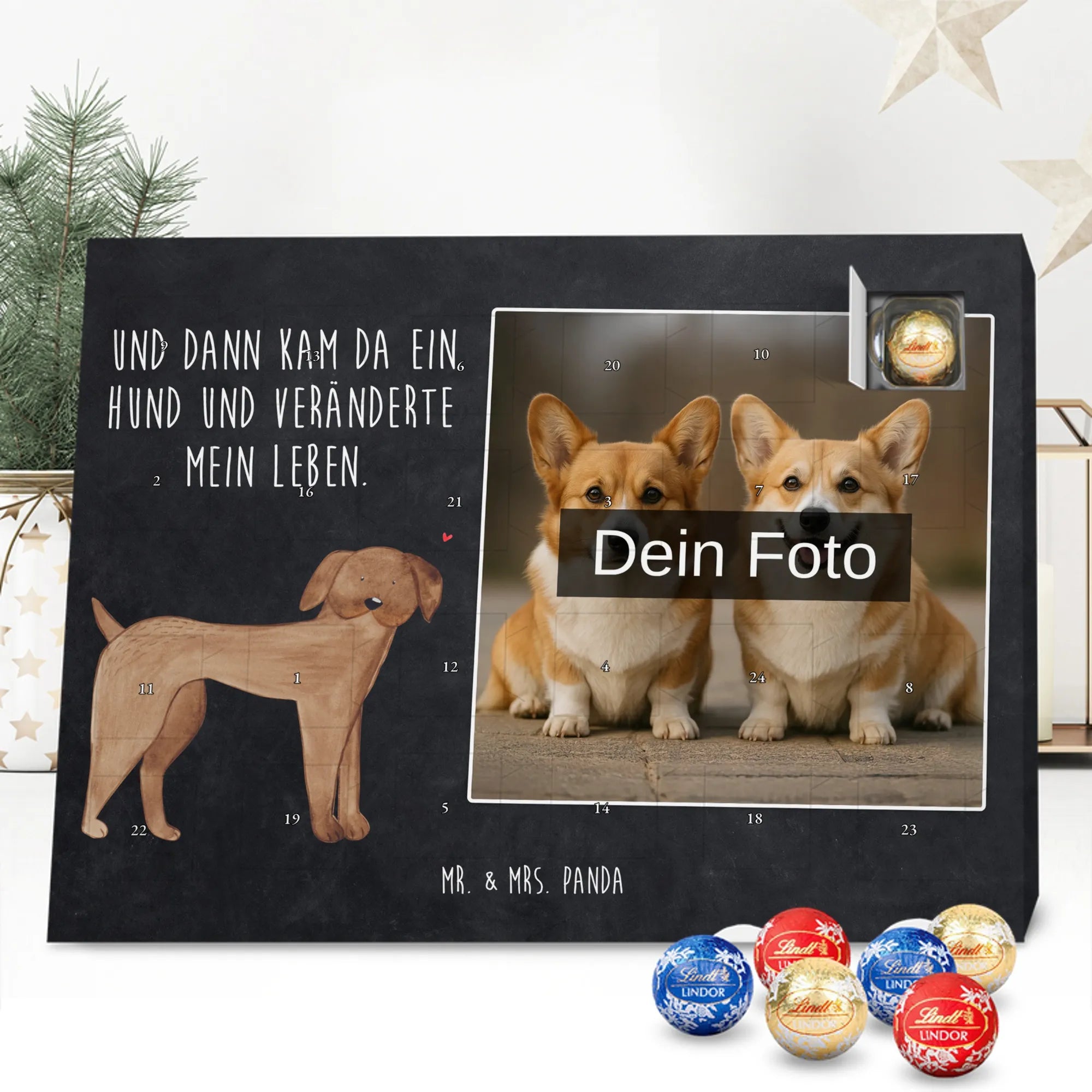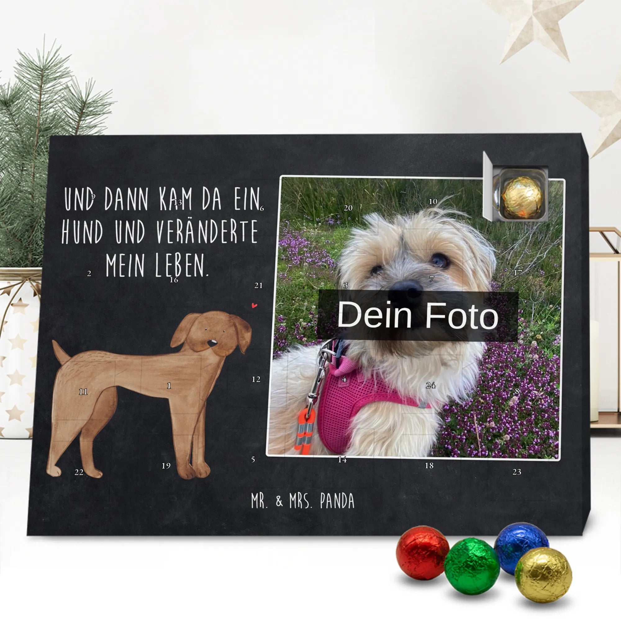 Zauberhafter Personalisierter Schoko-Foto-Adventskalender von Mr. & Mrs. Panda – ein kleines Stück Weihnachten zum Aufhängen oder Aufstellen. Der Kalender ist mit wunderschönen Motiven & Sprüchen bedruckt und du kannst ihn ganz einfach mit einem Foto personalisieren. Bitte achte auf hohe Auflösung: Lade ein Foto in guter Qualität und ausreichender Auflösung hoch, damit das Druckergebnis schön klar wird. Prüfe den Bildausschnitt, damit nichts Wichtiges abgeschnitten wird. Achte außerdem auf Bildrechte: Verwende nur Fotos, bei denen du die Rechte besitzt. Unsere Drucke glänzen durch brillante Qualität mit seidenmatter Oberflächenveredelung und bedruckten Seitenflächen. Maße: 233 mm x 178 mm x 24 mm. Besonderheit: Fotos werden weder aufbereitet noch zugeschnitten – daher ist eine Rücknahme bei personalisierten Foto-Artikeln ausgeschlossen. Gefüllt mit MARKENNAMEN Schokolade und leckeren Schokoladenkugeln, kann der Kalender Spuren von Haselnüssen, Mandeln, Gluten und Soja enthalten. Kühl und trocken lagern! Verschenke Erinnerungen in Schokoladeform – perfekt für Freunde, Familie oder als liebevolle Überraschung für dich selbst.