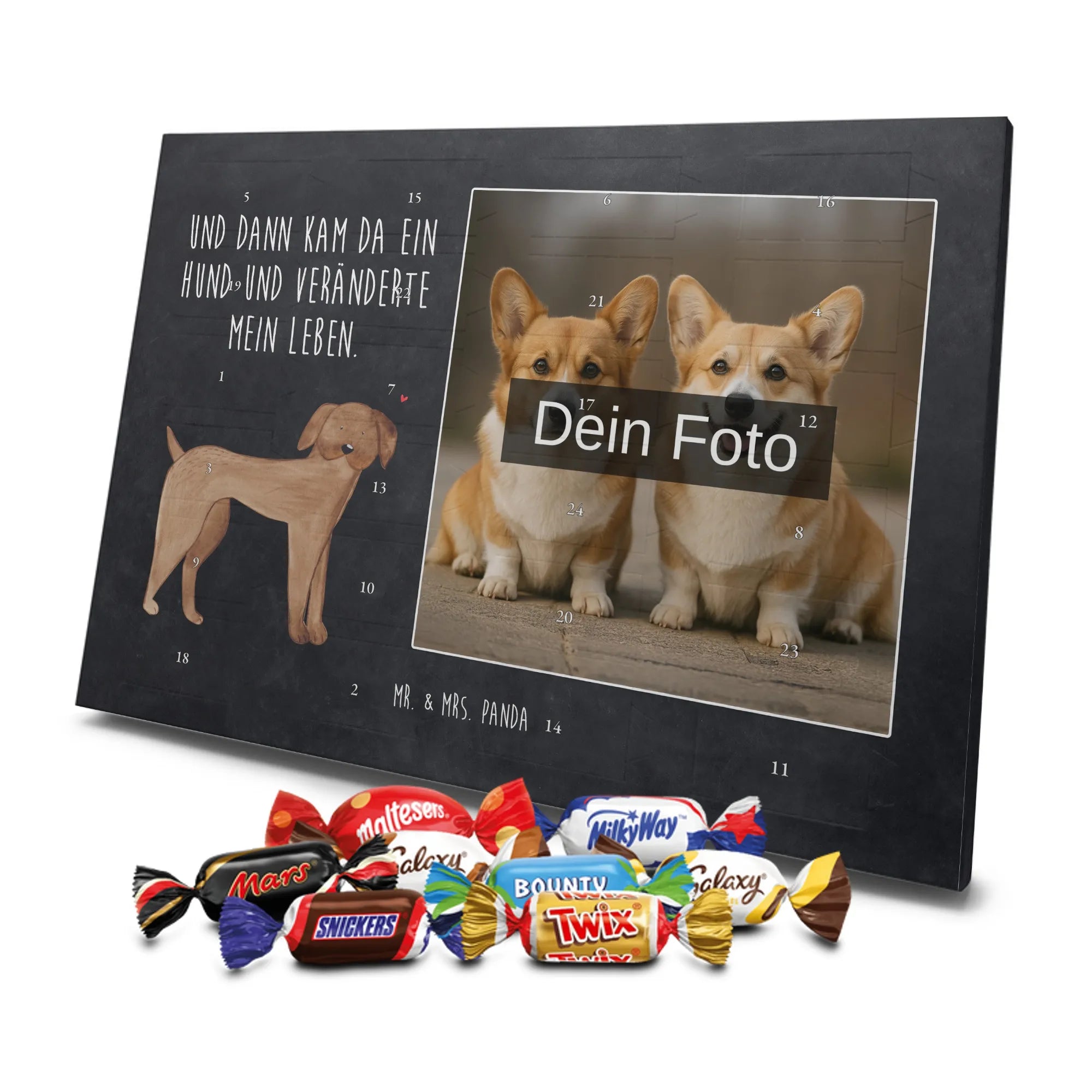 Herziger Personalisierter Foto Adventskalender mit Schokolade von Mr. & Mrs. Panda – perfekt, um schöne Erinnerungen sichtbar zu machen und jeden Dezembertag zu versüßen. Die Vorderseite ziert dein persönliches Foto, der Rest des Kalenders ist mit warmen Motiven und liebevollen Sprüchen von Mr. & Mrs. Panda gestaltet. Bitte lade ein Bild in hoher Auflösung hoch und prüfe den Bildausschnitt, damit nichts Wichtiges abgeschnitten wird. Verwende nur Fotos, bei denen du die Rechte besitzt oder die Zustimmung der abgebildeten Personen vorliegt. Unsere Drucke bestechen durch brillante Qualität und eine seidenmatte Oberflächenveredelung; auch die Seitenflächen sind bedruckt. Maße: 325 mm x 225 mm x 27 mm. Der Adventskalender lässt sich aufhängen oder aufstellen – ganz flexibel. Wichtiger Hinweis: Fotos werden nicht nachbearbeitet oder zugeschnitten; personalisierte Foto-Artikel sind vom Widerruf ausgeschlossen. Gefüllt ist der Kalender mit Celebrations Schokolade – 24 hochwertige Füllungen in 8 leckeren Sorten (Maltesers, Mars, Snickers, Twix, Milky Way, Bounty, Galaxy, Galaxy Caramel). Schenke ein persönliches Unikat, das Freude und Süße verbindet.