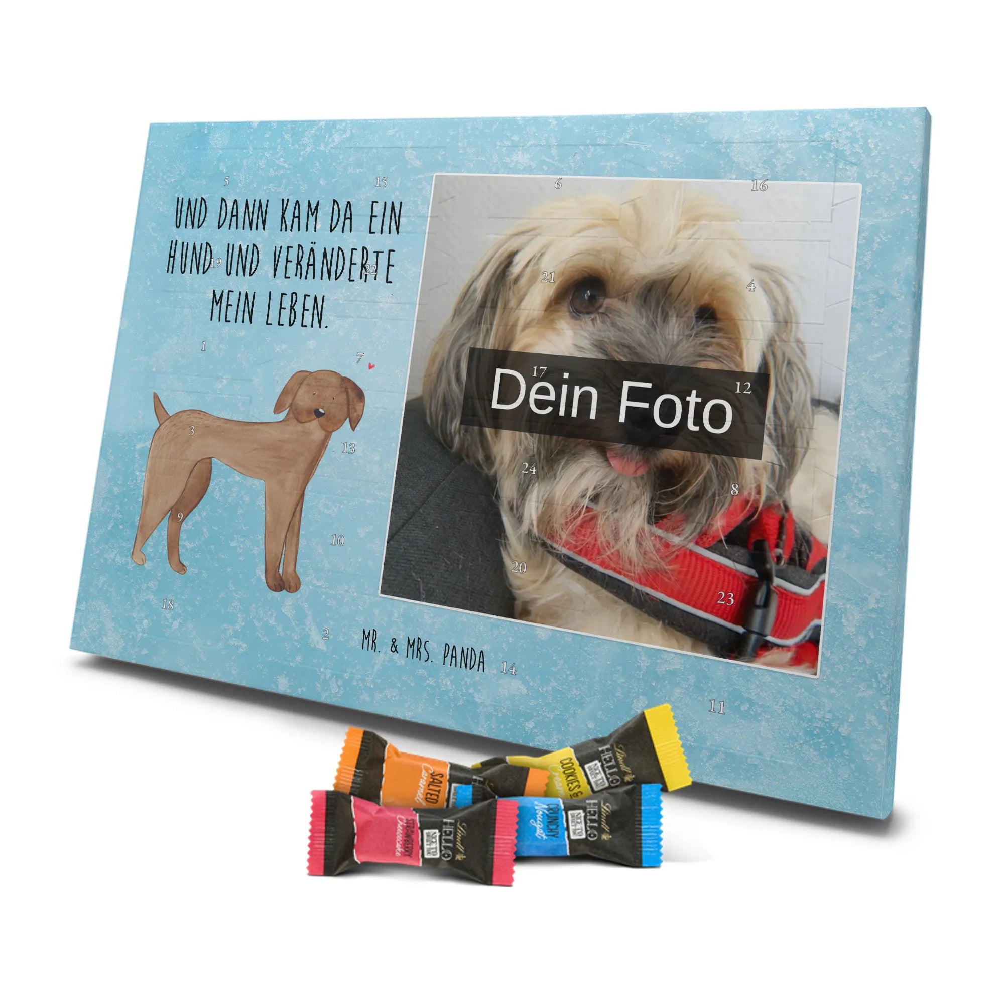 Kreiere persönliche Adventsmomente mit dem Foto Adventskalender personalisiert von Mr. & Mrs. Panda. Jede Tür ist umrahmt von liebevollen Illustrationen und charmanten Sprüchen, der zentrale Bereich ist für dein Foto reserviert – so wird der Kalender zum individuellen Highlight. Achte auf eine hohe Auflösung und den richtigen Bildausschnitt, damit das Foto klar gedruckt wird; lade nur Bilder hoch, deren Nutzung du erlauben darfst. Die seidenmatte Veredelung und die komplett bedruckten Seitenflächen machen den Kalender besonders hochwertig. Maße: 325 mm x 225 mm x 27 mm. Im Inneren: 24 einzeln verpackte Schokoladen Mini Sticks in vier leckeren Varianten: Karamell-Schokoladenkuchen, Kekse, Knuspriger Nougat und Erdbeer-Cheesecake. Gefüllt mit Lindt Hello Schokolade. Allergene: Milcheiweiß, Milchzucker, Soja, Weizen, Haselnüsse; kann Spuren von Mandeln und weiteren Schalenfrüchten enthalten. Der Kalender lässt sich aufstellen oder aufhängen. Wichtiger Hinweis: Fotos werden weder nachbearbeitet noch zugeschnitten – personalisierte Foto-Artikel sind vom Umtausch ausgeschlossen. Verschenke Freude, Erinnerungen und Schokolade in einem liebevoll gestalteten Adventskalender!