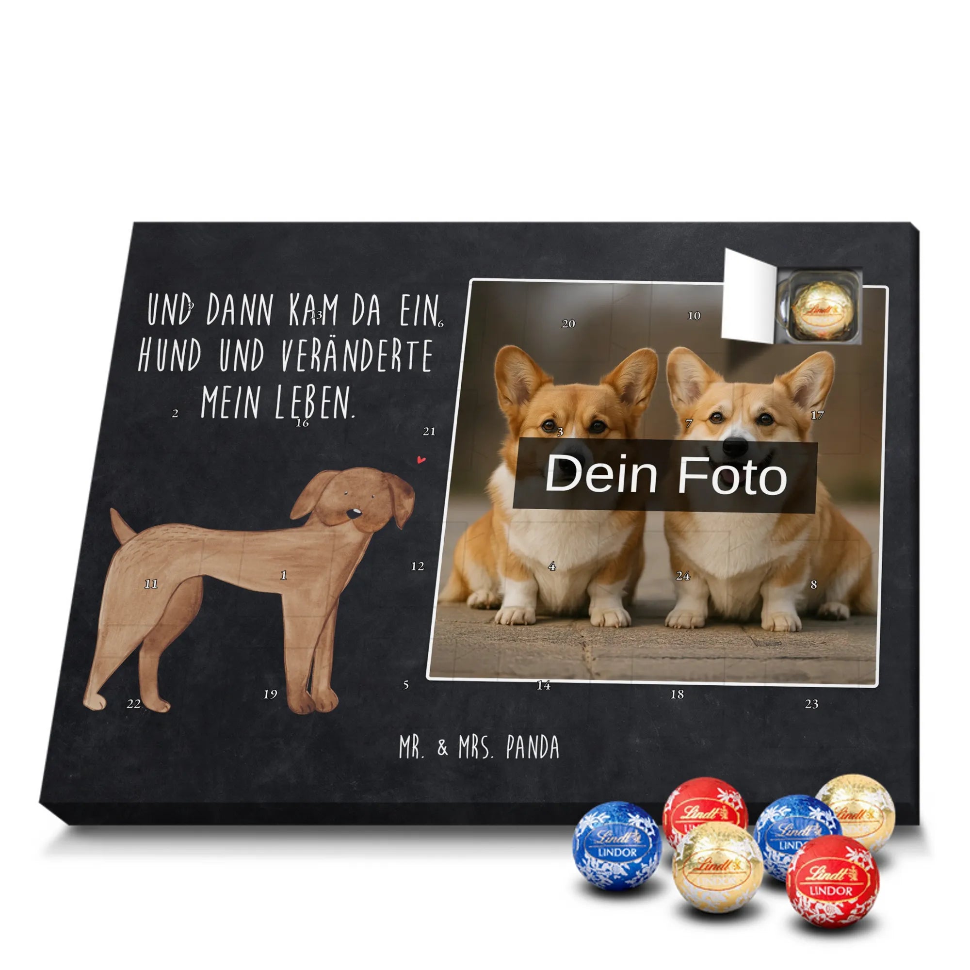 Foto-Adventskalender mit Schokolade von Mr. & Mrs. Panda – personalisiere den Advent mit deinem Lieblingsfoto und unseren liebevollen Motiven & Sprüchen. Dieser Kalender ist ideal, wenn du etwas Persönliches schenken willst: Einfach Foto hochladen, auf hohe Auflösung achten und den passenden Bildausschnitt wählen. Denk daran, nur Bilder zu verwenden, bei denen du die Bildrechte besitzt. Fotos werden nicht nachbearbeitet oder zugeschnitten; Rücknahme bei personalisierten Foto Artikeln ist ausgeschlossen. Die Druckqualität ist brillant, mit seidenmatter Oberflächenveredelung und bedruckten Seitenflächen für ein hochwertiges Erscheinungsbild. Maße: 325 mm x 225 mm x 27 mm. Besonderheit: Du kannst den Kalender sowohl aufhängen als auch aufstellen. Gefüllt ist er mit Ritter Sport Schokowürfeln – köstliche Sorten wie Mousse au Chocolat, Schoko Crisp, Voll-Nuss in Nougatcreme, Karamell Duo, Joghurt und Erdbeer-Joghurt warten hinter den Türchen. Ein liebevoll gestaltetes Geschenk, das Erinnerungen und Genuss verbindet und die Vorfreude auf Weihnachten jeden Tag versüßt.