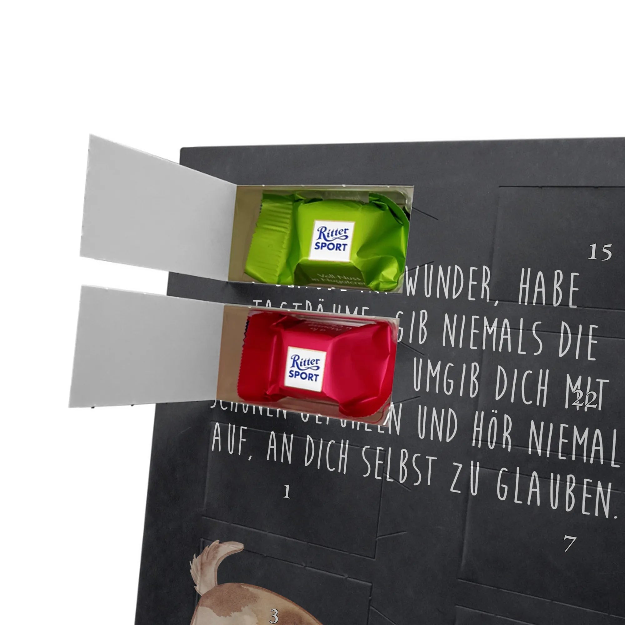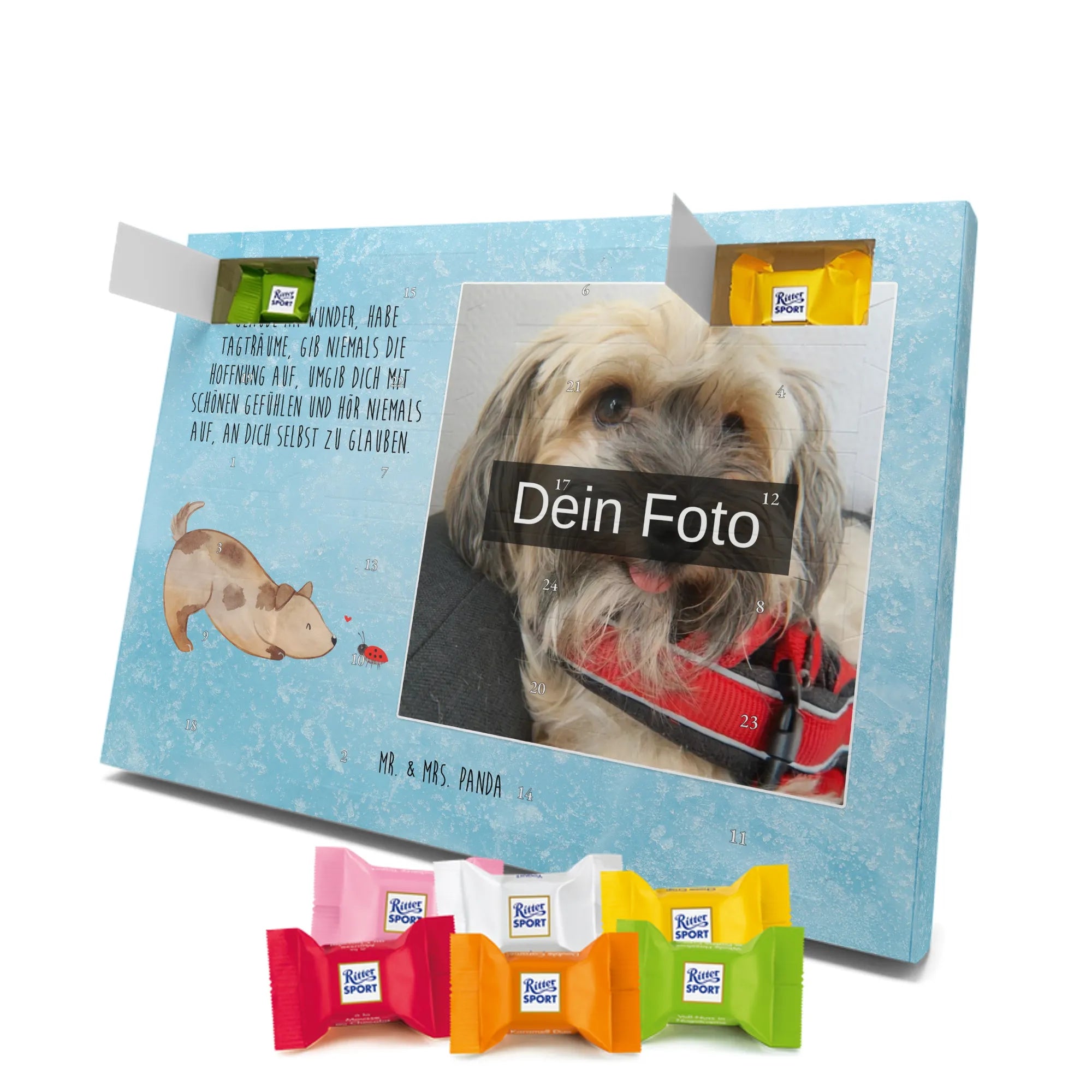 Schoko Foto Adventskalender personalisiert – ein fröhlicher Hingucker von Mr. & Mrs. Panda, der Adventszeit und Erinnerungen verbindet. Der Kalender ist bedruckt mit zauberhaften Motiven & Sprüchen von Mr. & Mrs. Panda und lässt sich ganz leicht mit einem Foto deiner Wahl personalisieren. Achtung Bildqualität: Für ein scharfes Druckbild solltest du ein Foto in hoher Auflösung verwenden. Kontrolliere den Bildausschnitt, damit wichtige Gesichter oder Details nicht verloren gehen. Verwende nur Fotos, für die du die Rechte besitzt oder die frei nutzbar sind. Bitte beachte: Die Fotos werden weder nachbearbeitet noch zugeschnitten und personalisierte Foto Artikel sind vom Umtausch ausgeschlossen. Die Verarbeitung überzeugt mit seidenmatter Oberflächenveredelung und bedruckten Seitenflächen für ein edles Finish. Maße: 325 mm x 225 mm x 27 mm. Besonderheit: Du kannst den Kalender aufhängen oder aufstellen – ganz flexibel. Gefüllt ist der Kalender mit Ritter Sport Schokowürfeln in leckeren Geschmacksrichtungen wie Mousse au Chocolat, Schoko Crisp, Voll-Nuss in Nougatcreme, Karamell Duo, Joghurt und Erdbeer-Joghurt. Ein liebevolles Geschenk, das jeden Tag im Advent versüßt.