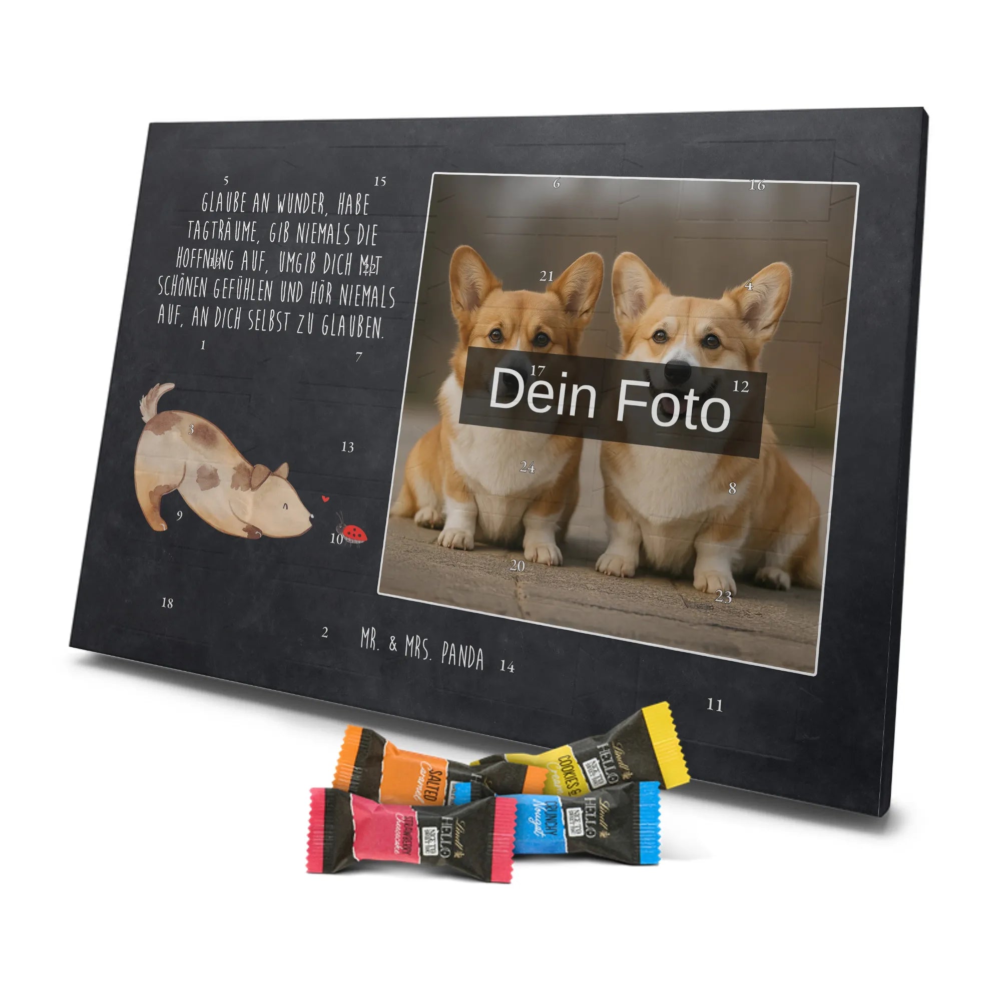 Lustiger Personalisierter Schoko Foto-Adventskalender – das Must-have für eine persönliche Adventszeit von Mr. & Mrs. Panda. Jeder Kalender wird mit unseren charmanten Illustrationen und liebevollen Sprüchen bedruckt, während dein Foto die Vorderseite einzigartig macht. Achte bitte darauf, ein Foto mit guter Qualität und ausreichend hoher Auflösung hochzuladen, damit der Druck gestochen scharf wirkt. Überprüfe den Bildausschnitt, damit wichtige Bereiche nicht verloren gehen. Denk daran, nur Bilder zu verwenden, bei denen du die nötigen Rechte besitzt. Die Verarbeitung ist hochwertig: brillante Druckqualität mit seidenmatter Oberflächenveredelung und bedruckten Seitenflächen. Maße: 325 mm x 225 mm x 27 mm. Du kannst den Kalender aufhängen oder aufstellen – sehr praktisch. Hinweis: Die hochgeladenen Fotos werden nicht nachbearbeitet oder zugeschnitten; Rücknahme bei personalisierten Foto-Artikeln ist ausgeschlossen. Gefüllt ist der Kalender mit Celebrations Schokolade – 24 Stück in 8 verschiedenen Sorten (Maltesers, Mars, Snickers, Twix, Milky Way, Bounty, Galaxy, Galaxy Caramel). Verschenke ein Stück persönlich gestaltete Vorfreude und mache jeden Dezembertag zu etwas Besonderem.