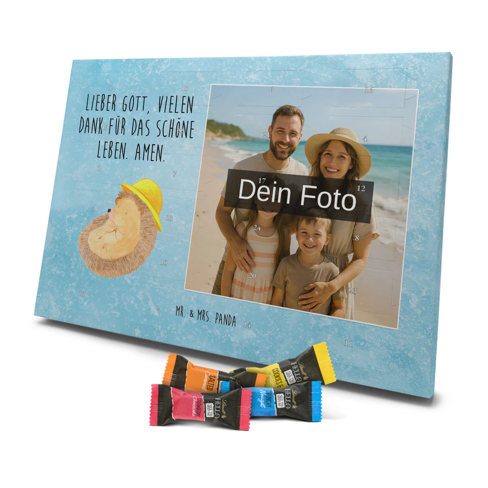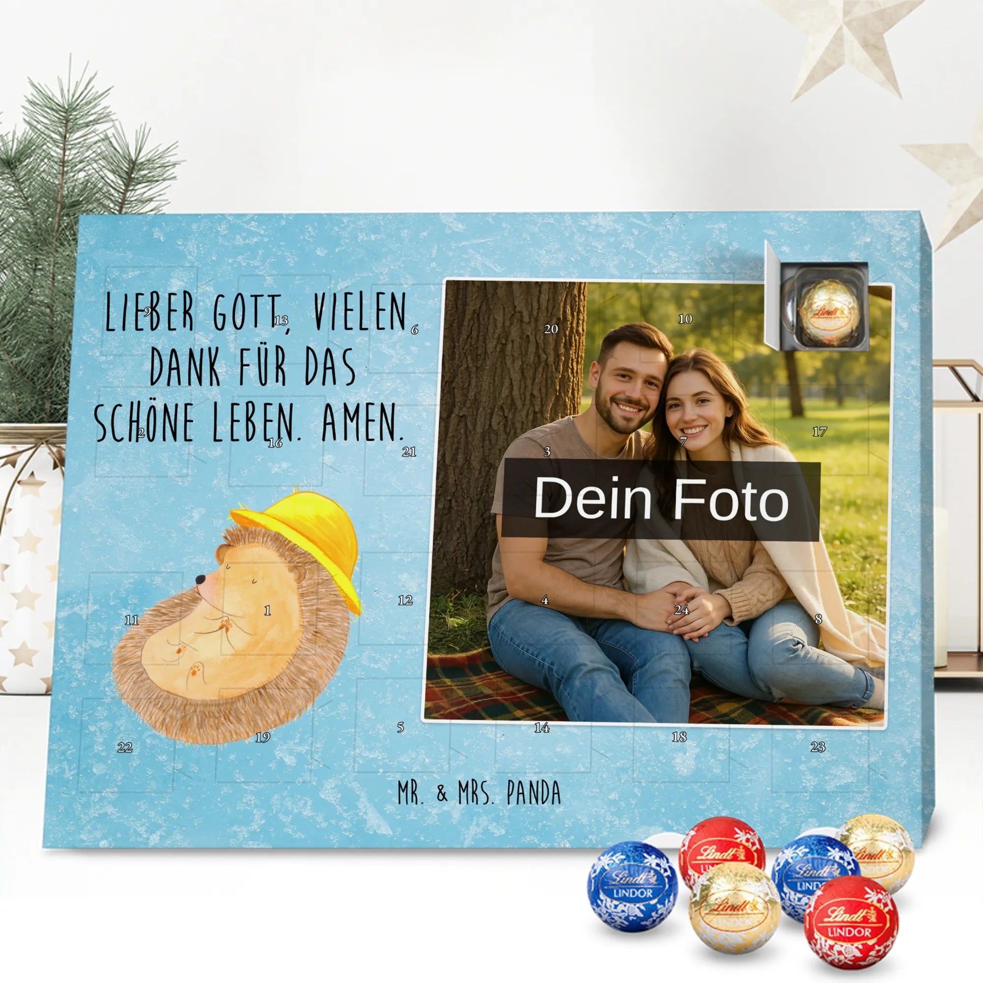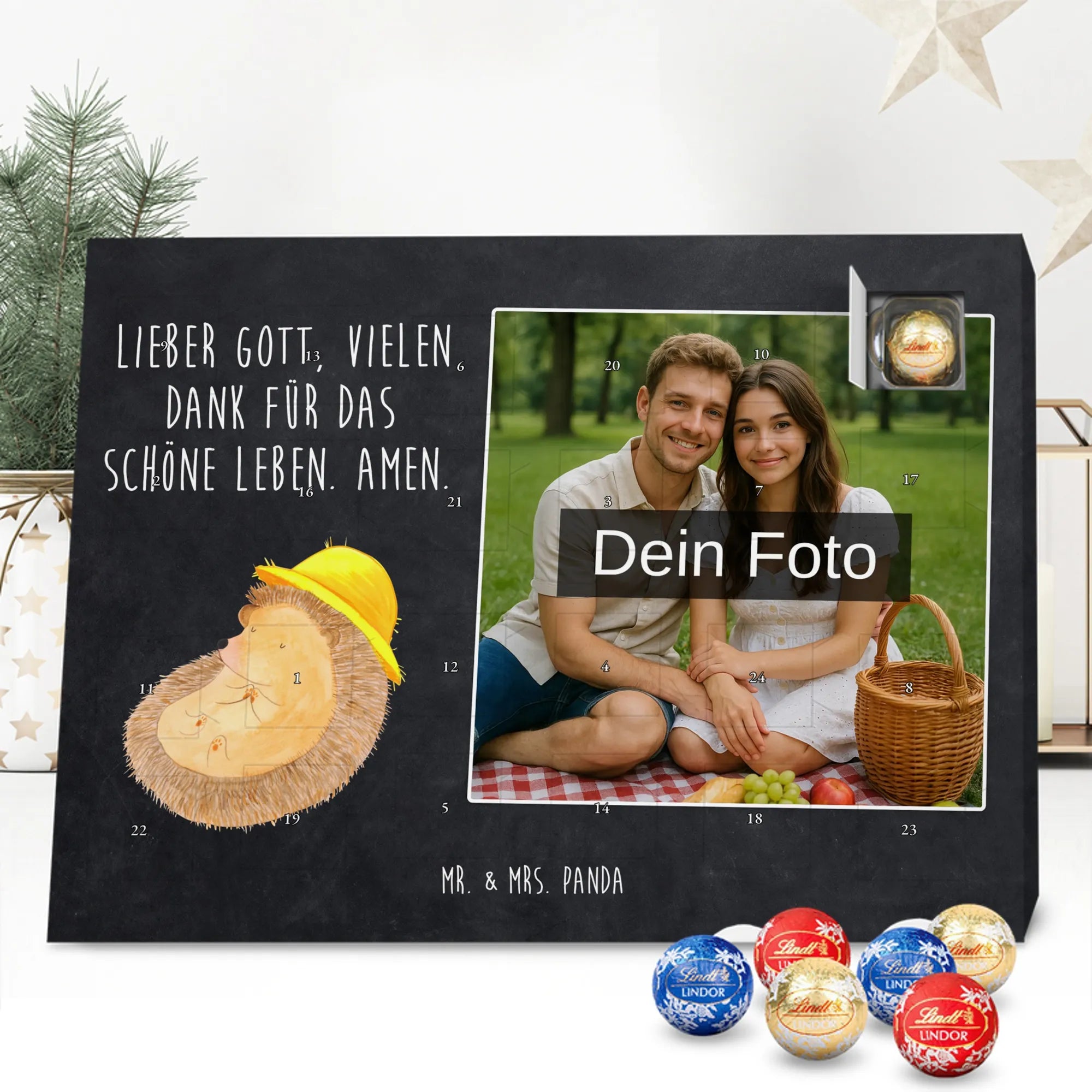Mach die Adventszeit persönlich mit unserem Personalisiertes Schoko Foto-Adventskalender von Mr. & Mrs. Panda. Dieser Kalender kombiniert dein Lieblingsfoto mit unseren fröhlichen Illustrationen und liebevollen Sprüchen – perfekt als Geschenk für Partner, Familie oder Freunde. Für ein optimales Druckergebnis bitte ein hochauflösendes Bild verwenden und den Bildausschnitt so wählen, dass wichtige Details nicht verloren gehen. Beachte, dass wir Fotos nicht nachbearbeiten oder zuschneiden; lade nur Bilder hoch, für die du die Rechte besitzt. Die hochwertige Verarbeitung beinhaltet eine seidenmatte Oberflächenveredelung und bedruckte Seitenflächen, außerdem ist der Kalender robust und kann aufgehängt oder aufgestellt werden. Maße: 233 mm x 178 mm x 24 mm. Gefüllt mit Lindt Lindor Markenschokolade: 24 einzeln verpackte Kugeln in den Sorten Vollmilch, Feinherb und Weiße Schokolade. Inhaltsstoffe und Allergene sind angegeben; es kann Haselnüsse und Mandeln enthalten. Hinweis: Personalisierte Foto-Artikel sind vom Umtausch ausgeschlossen. Ein süßer, persönlicher Adventsgruß von Mr. & Mrs. Panda.