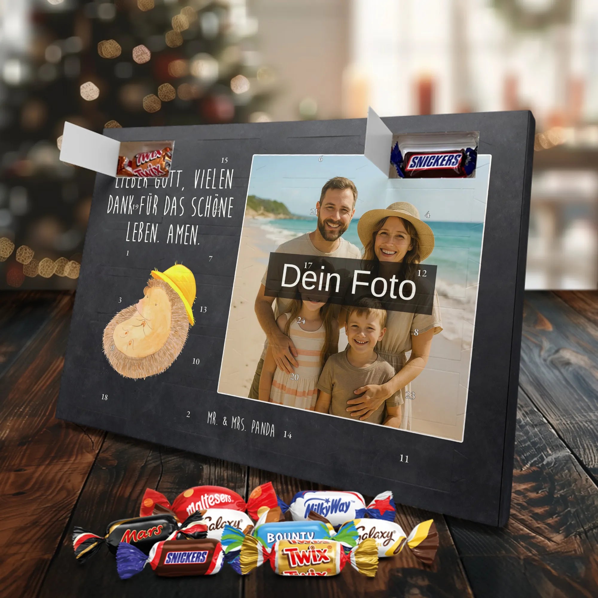 Lustiger Personalisierter Schoko Foto-Adventskalender – das Must-have für eine persönliche Adventszeit von Mr. & Mrs. Panda. Jeder Kalender wird mit unseren charmanten Illustrationen und liebevollen Sprüchen bedruckt, während dein Foto die Vorderseite einzigartig macht. Achte bitte darauf, ein Foto mit guter Qualität und ausreichend hoher Auflösung hochzuladen, damit der Druck gestochen scharf wirkt. Überprüfe den Bildausschnitt, damit wichtige Bereiche nicht verloren gehen. Denk daran, nur Bilder zu verwenden, bei denen du die nötigen Rechte besitzt. Die Verarbeitung ist hochwertig: brillante Druckqualität mit seidenmatter Oberflächenveredelung und bedruckten Seitenflächen. Maße: 325 mm x 225 mm x 27 mm. Du kannst den Kalender aufhängen oder aufstellen – sehr praktisch. Hinweis: Die hochgeladenen Fotos werden nicht nachbearbeitet oder zugeschnitten; Rücknahme bei personalisierten Foto-Artikeln ist ausgeschlossen. Gefüllt ist der Kalender mit Celebrations Schokolade – 24 Stück in 8 verschiedenen Sorten (Maltesers, Mars, Snickers, Twix, Milky Way, Bounty, Galaxy, Galaxy Caramel). Verschenke ein Stück persönlich gestaltete Vorfreude und mache jeden Dezembertag zu etwas Besonderem.