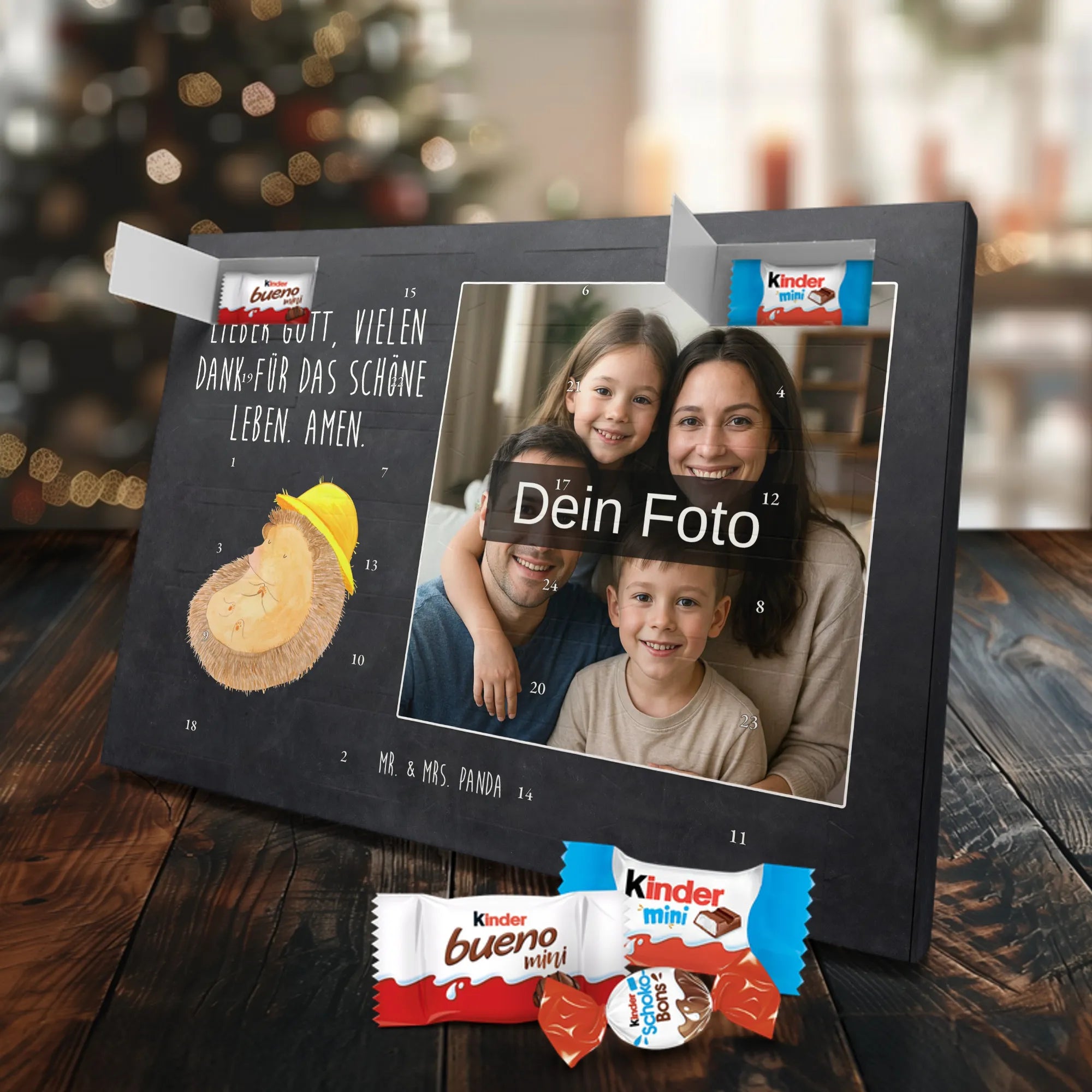 Schoko Foto Adventskalender personalisiert – ein zauberhaftes Produkt von Mr. & Mrs. Panda, das Erinnerungen und Süßigkeiten kombiniert. Gestalte die Vorderseite mit einem persönlichen Foto und überrasche deine Liebsten jeden Tag im Advent. Unsere Designs mit niedlichen Illustrationen und liebevollen Sprüchen runden das Foto perfekt ab. Bitte lade ein hochauflösendes Foto hoch und prüfe den Bildausschnitt, damit das Druckbild optimal wird. Verwende nur Bilder, für die du die Rechte besitzt oder die Freigabe der abgebildeten Personen vorliegt. Beachte: Wir schneiden oder bearbeiten die Fotos nicht; personalisierte Foto-Artikel sind von der Rückgabe ausgeschlossen. Der Kalender besticht durch brillante Druckqualität, seidenmatte Oberflächenveredelung und bedruckte Seitenflächen für ein hochwertiges Finish. Maße: 355 mm x 245 mm x 11 mm. Du kannst den Kalender aufstellen oder ihn an der Wand aufhängen. Gefüllt mit kinder® Schokolade – inklusive kinder® Schoko-Bons, kinder® Bueno mini und kinder® Schokolade mini. Ein warmherziges, persönliches Geschenk mit dem typischen Mr. & Mrs. Panda Flair, das Vorfreude und Geschmack vereint.