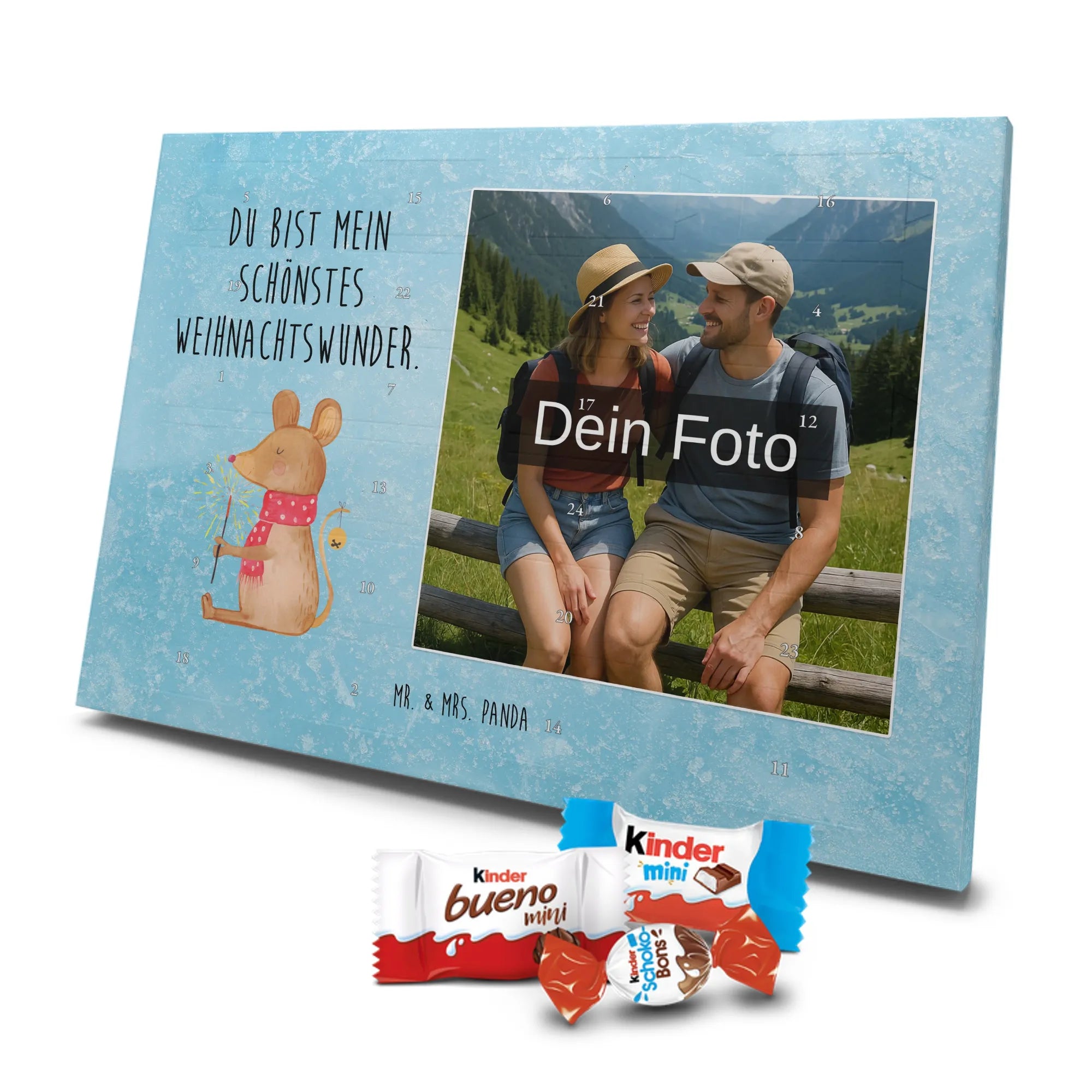 🐼 Personalisierter Schoko-Foto-Adventskalender mit deinem Bild, Mr. & Mrs. Panda Motiven und gefüllt mit kinder® Schokolade.