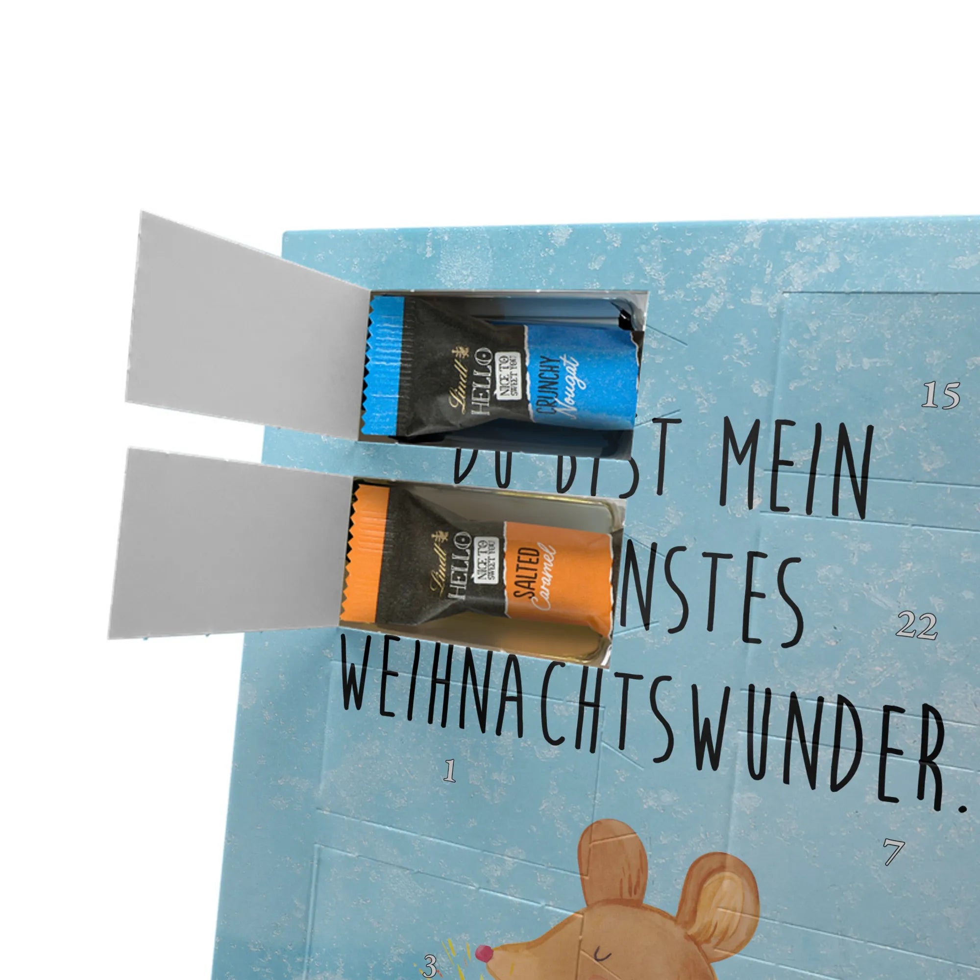 Entdecke unseren personalisierten Schoko-Foto-Adventskalender von Mr. & Mrs. Panda – ein liebevoll gestalteter Adventsbegleiter, der dich jeden Tag im Dezember mit süßen Überraschungen verwöhnt. Der Kalender ist mit charmanten Motiven und kurzen Sprüchen bedruckt und lässt sich mit deinem Lieblingsfoto personalisieren. Achte auf eine gute Bildqualität und den richtigen Bildausschnitt, damit dein Foto sauber gedruckt wird. Bitte nur Fotos hochladen, bei denen du die Rechte besitzt. Die hochwertige, seidenmatte Oberfläche und die bedruckten Seitenflächen verleihen dem Kalender einen besonderen Look. Maße: 325 mm x 225 mm x 27 mm. Innen findest du 24 einzeln verpackte Schokoladen Mini Sticks in vier köstlichen Sorten: Karamell-Schokoladenkuchen, Kekse, Knuspriger Nougat und Erdbeer-Cheesecake. Gefüllt mit Lindt Hello Schokolade. Wichtige Hinweise: Allergene wie Milcheiweiß, Milchzucker, Soja, Weizen und Haselnüsse sind enthalten. Kann Spuren von Mandeln und anderen Schalenfrüchten enthalten. Der Kalender kann aufgehängt oder aufgestellt werden. Hinweis: Fotos werden nicht nachbearbeitet oder zugeschnitten – Rücknahme ausgeschlossen. Verschenke Vorfreude mit deinem individuellen Foto-Adventskalender!