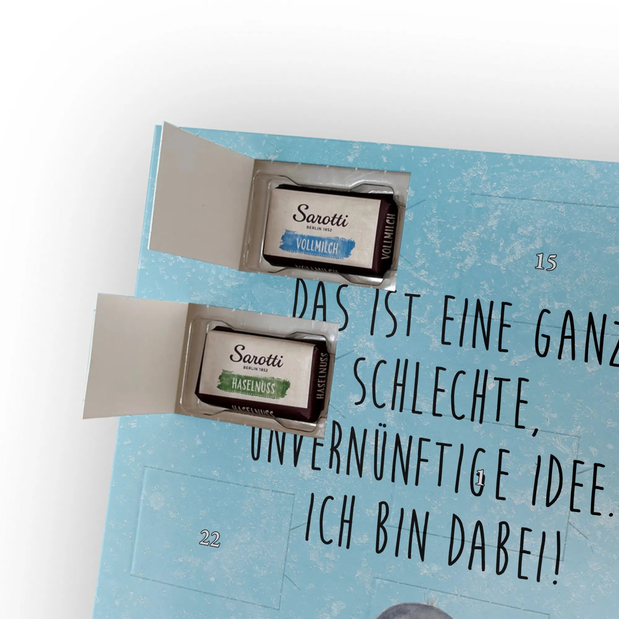 🐼 LECKERE FÜLLUNG: 24 Täfelchen, 107 g Markenschokolade (Sarotti® & Confiserie Heidel®) in vier Sorten.