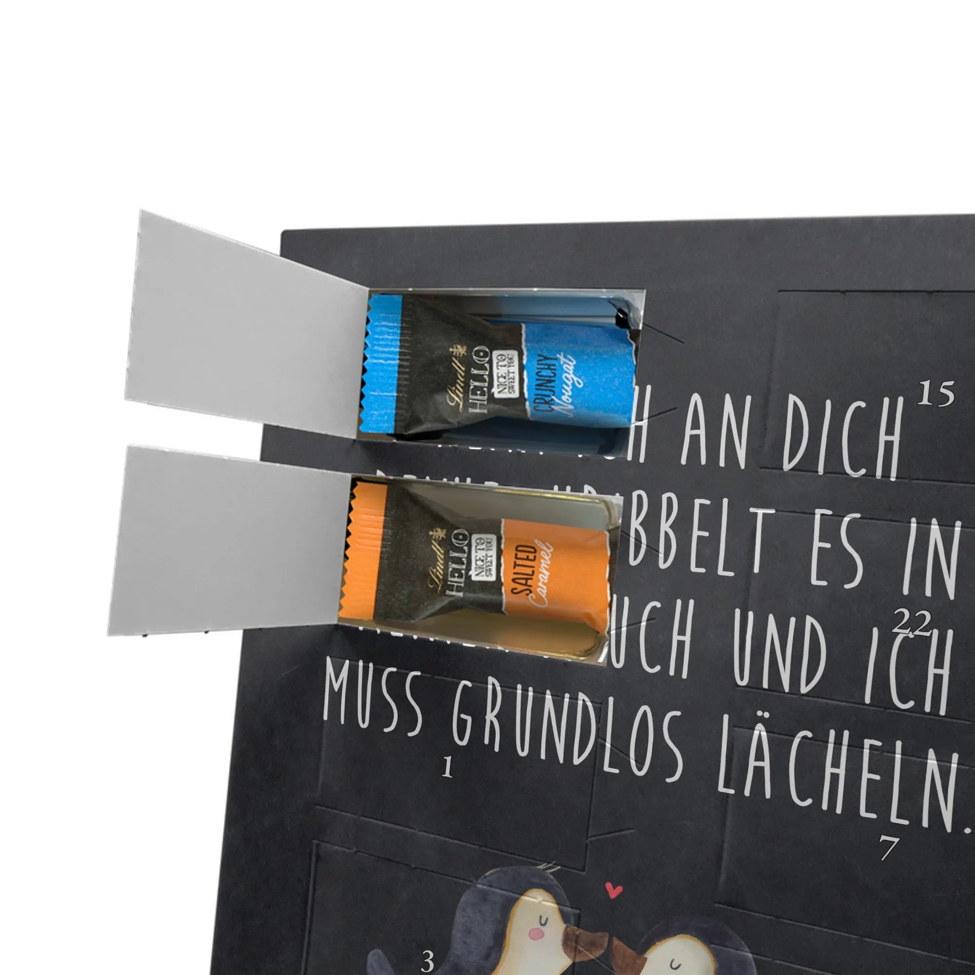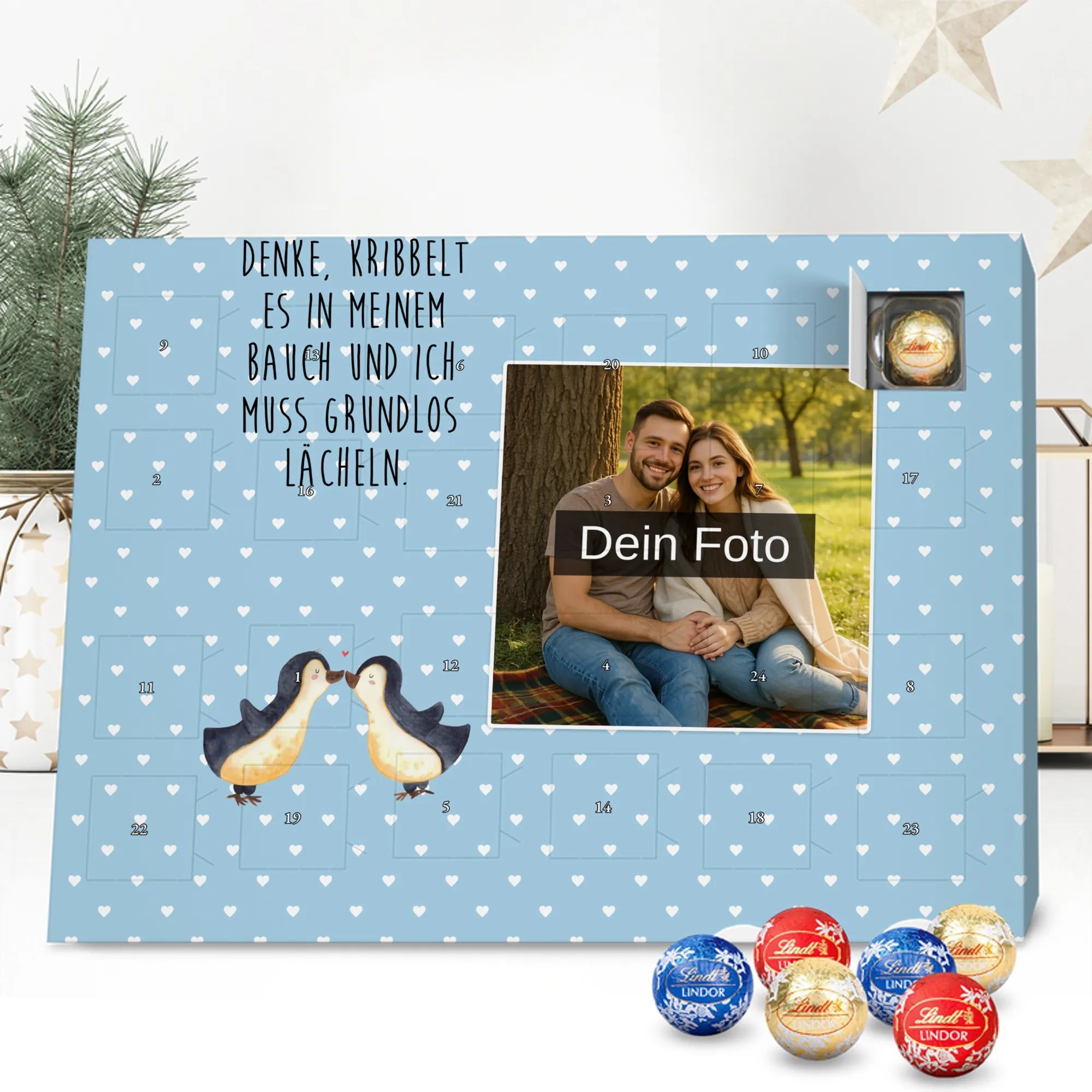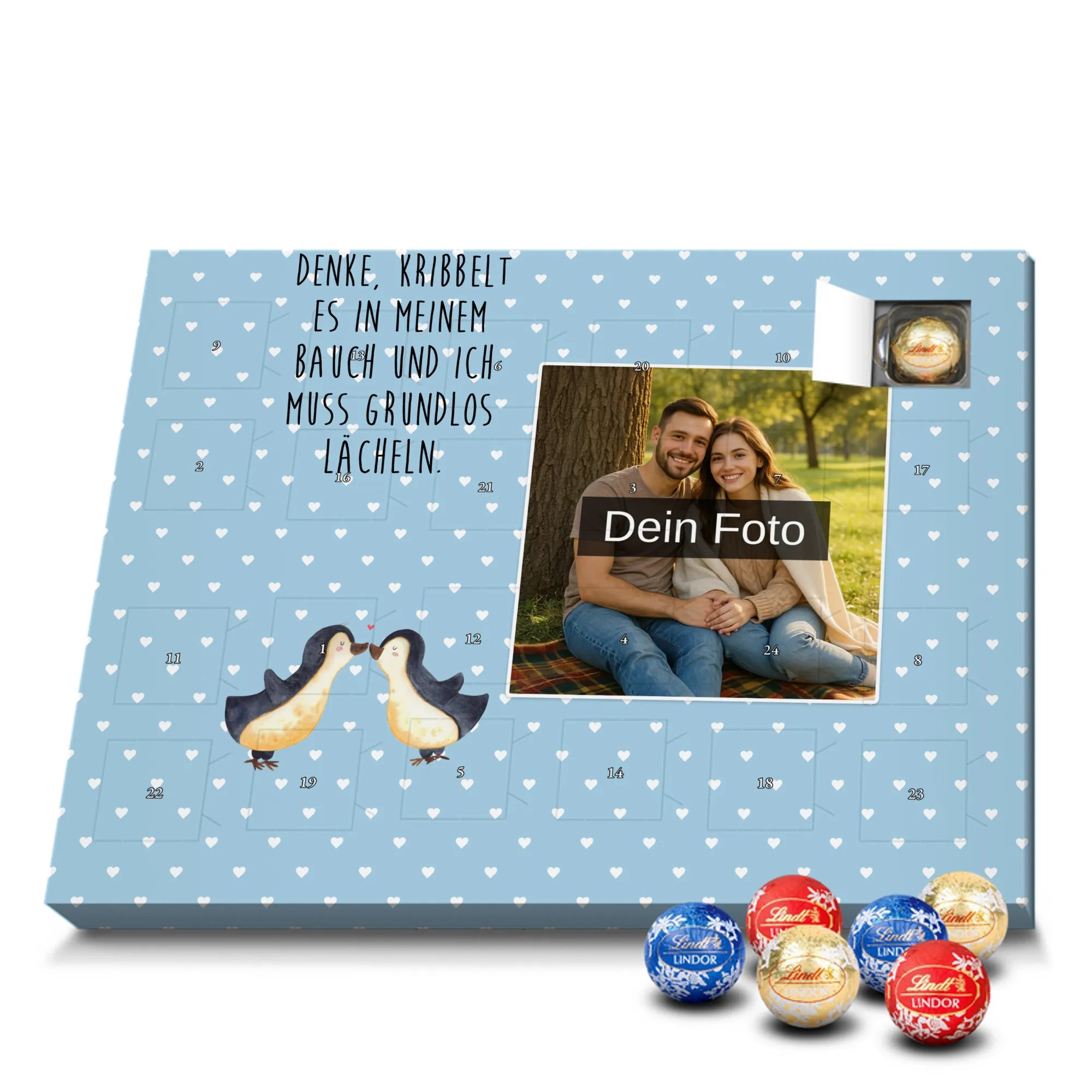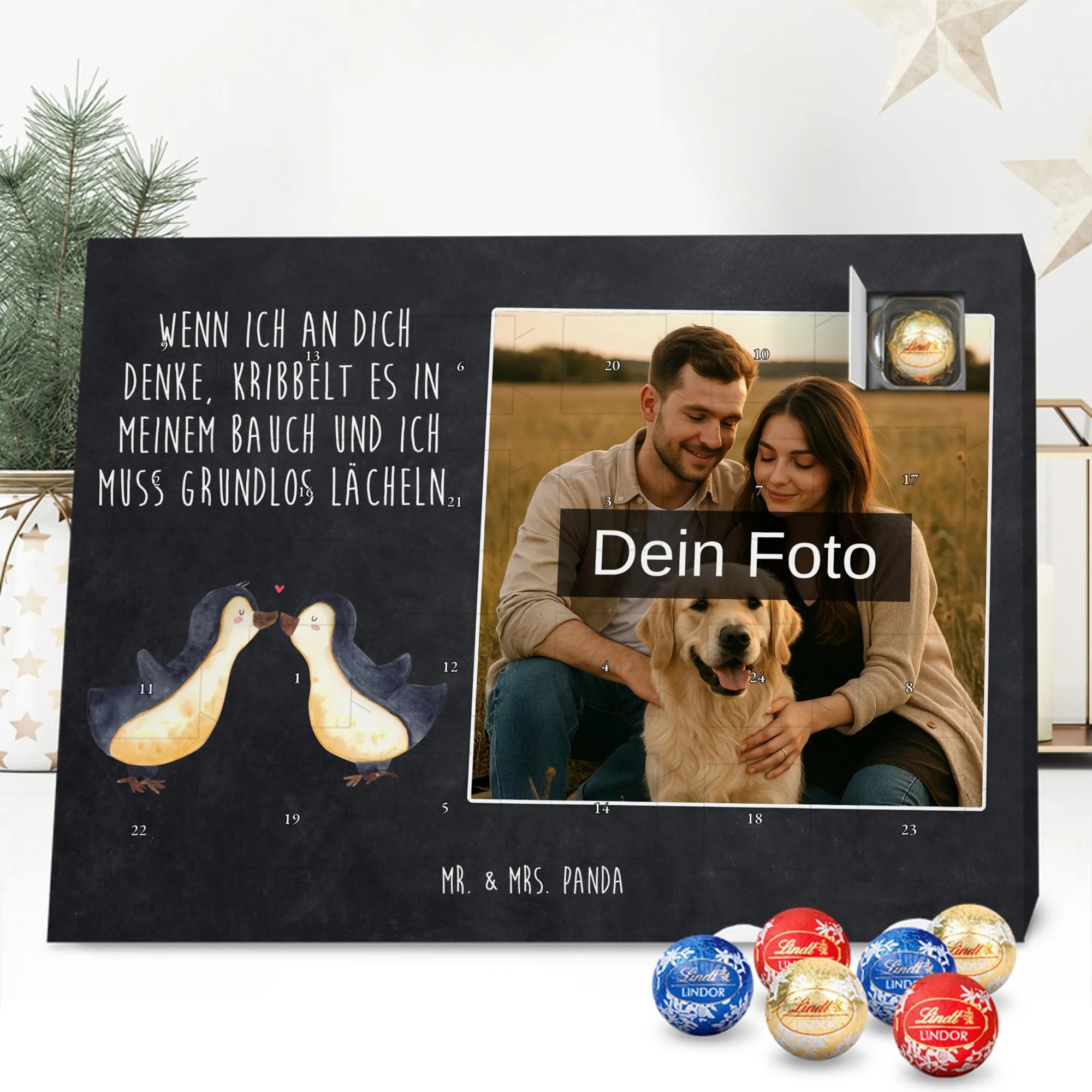 Entdecke unseren charmanten Personalisierter Schoko-Foto Adventskalender von Mr. & Mrs. Panda – ein liebevolles Geschenk für Freunde, Familie oder dich selbst. Aufdrucke mit süßen Motiven und herzlichen Sprüchen begleiten dein persönliches Foto, das du individuell hochlädst. Achte bitte auf eine ausreichende Auflösung des Bildes und einen passenden Bildausschnitt, damit das Druckbild klar bleibt. Wir weisen darauf hin, dass Fotos nicht nachbearbeitet oder zugeschnitten werden; achte daher auf Bildrechte und Zustimmung der abgebildeten Personen. Die Verarbeitung überzeugt durch eine seidenmatte Oberflächenveredelung und bedruckte Seitenflächen; dadurch wirkt der Kalender sehr hochwertig. Der Kalender ist vielseitig: Du kannst ihn sowohl aufstellen als auch aufhängen. Maße: 233 mm x 178 mm x 24 mm. Gefüllt mit Lindt Lindor Markenschokolade – 24 einzeln verpackte Markenschokoladen Kugeln in den Geschmacksrichtungen Vollmilch, Feinherb und Weiße Schokolade. Zutaten und Allergene sind auf der Verpackung angegeben; es kann Spuren von Haselnüssen und Mandeln geben. Hinweis: Personalisierte Foto-Artikel sind vom Umtausch ausgeschlossen.