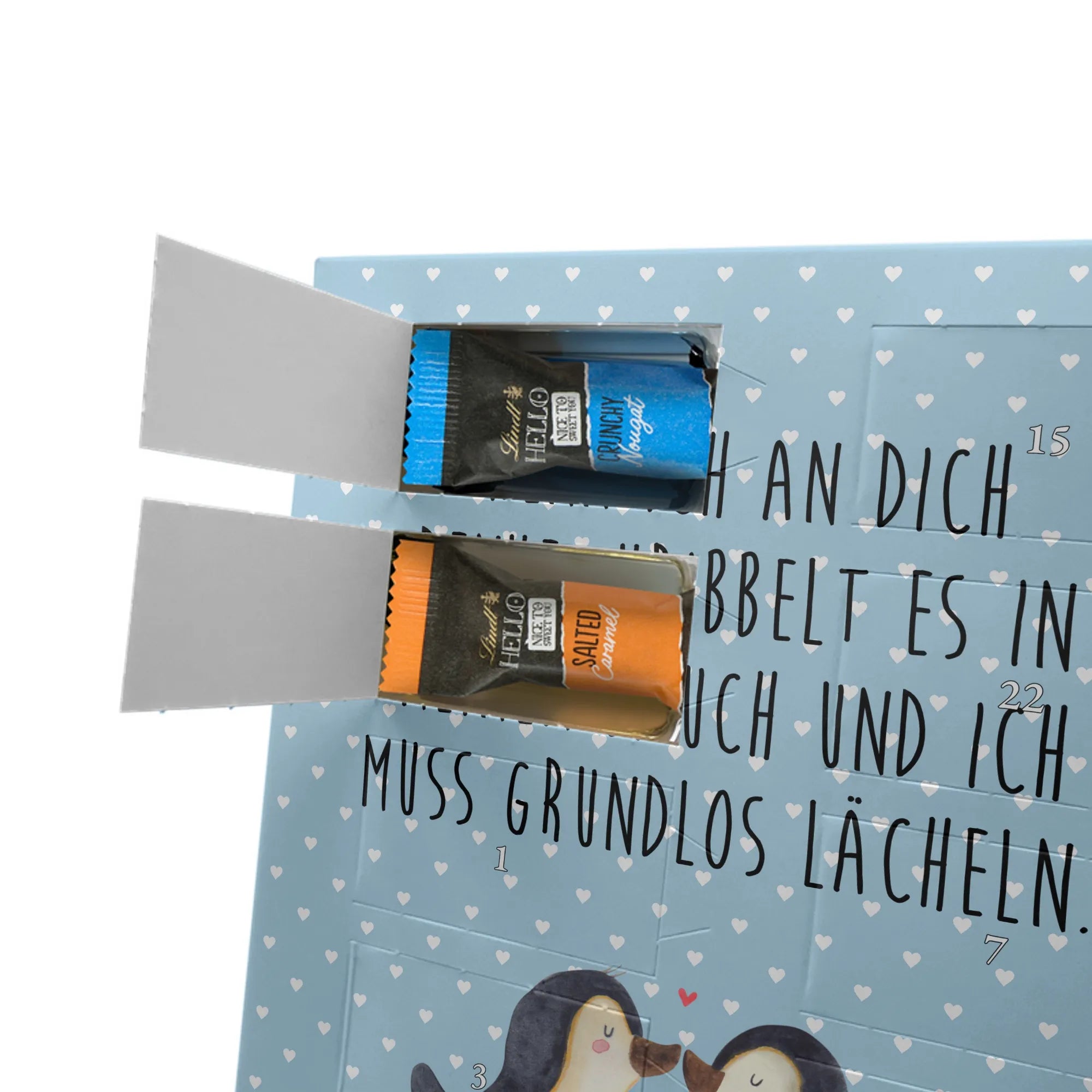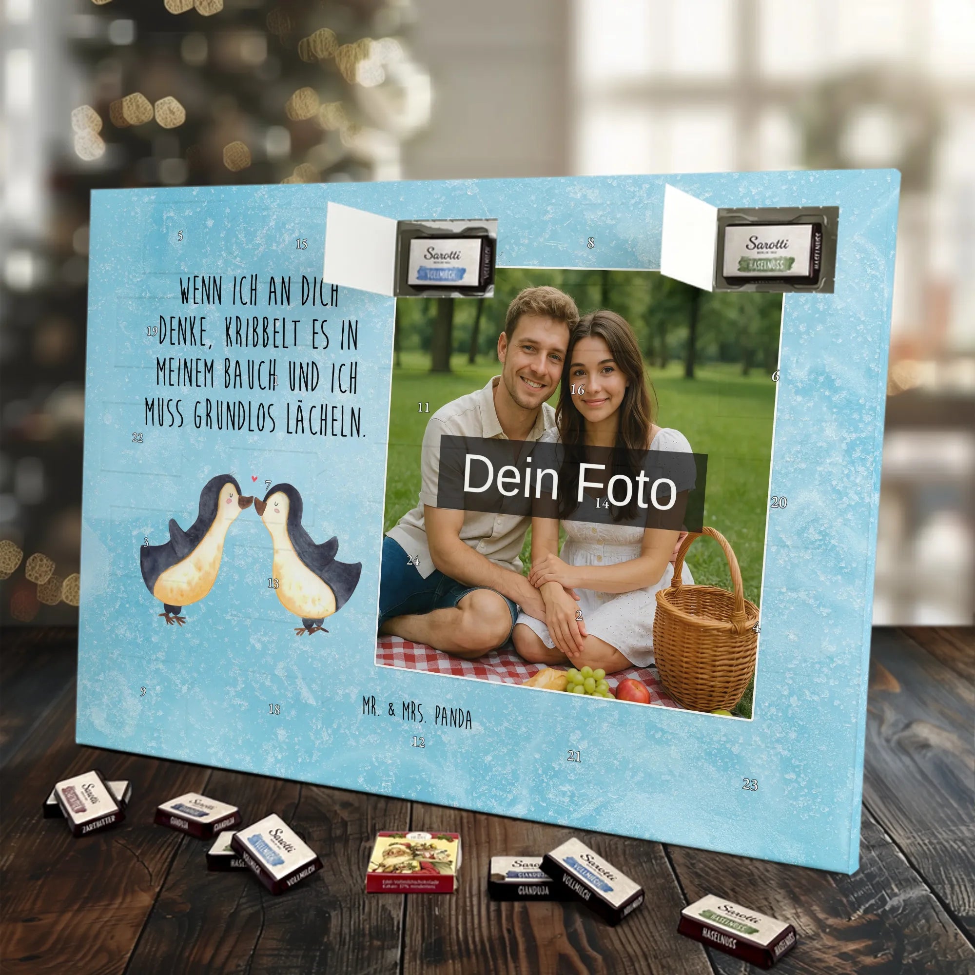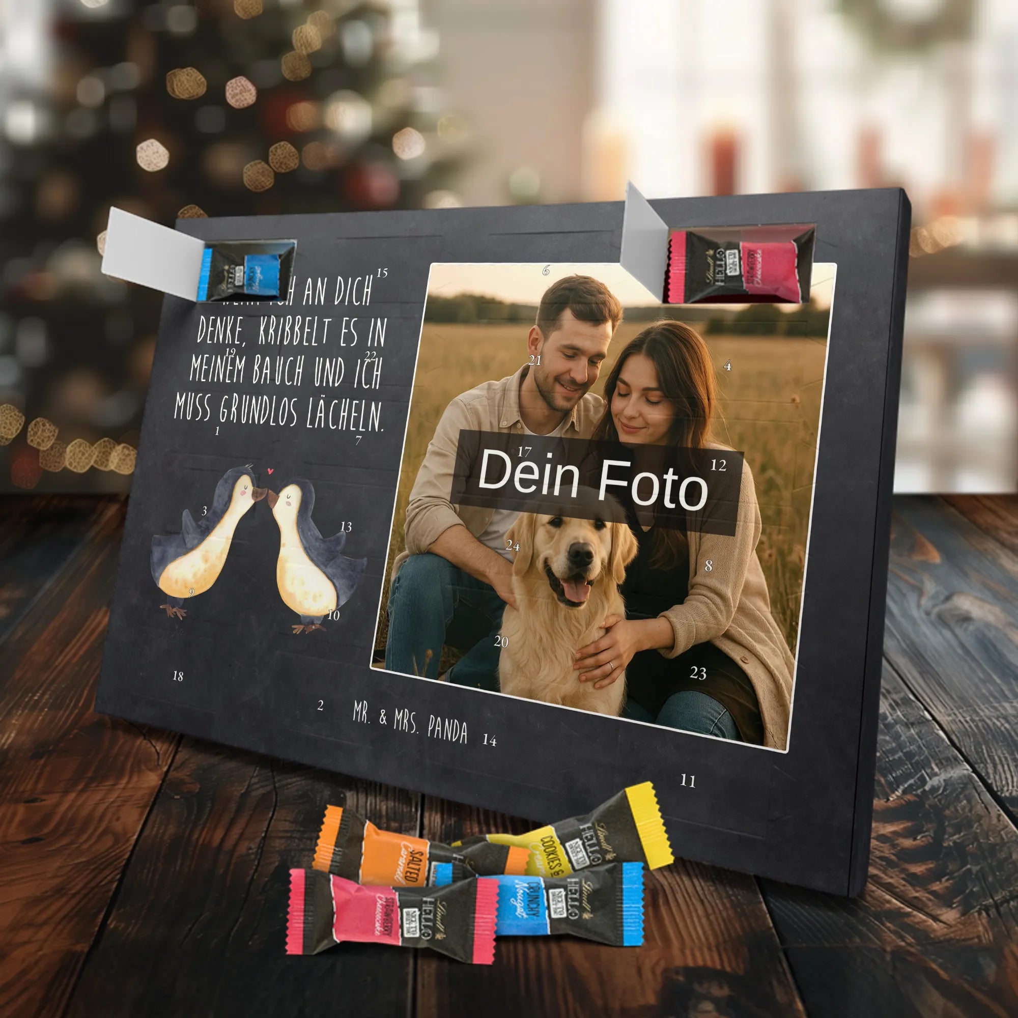 Verschenke Vorfreude: Unser individueller Foto-Adventskalender mit Schokolade von Mr. & Mrs. Panda macht jeden Dezembertag zum kleinen Fest. Der Kalender kombiniert bezaubernde Illustrationen und Sprüche von Mr. & Mrs. Panda mit deinem eigenen Foto – so entsteht ein ganz persönliches Geschenk. Achte auf Bildqualität und Bildausschnitt, damit das Foto optimal zur Geltung kommt, und nutze nur Bilder, für die du die Rechte besitzt. Die hochwertige seidenmatte Oberfläche mit bedruckten Seitenflächen veredelt das Design. Maße: 325 mm x 225 mm x 27 mm. Gefüllt mit Lindt Hello Schokolade: 24 einzeln verpackte Mini Sticks in den Sorten Karamell-Schokoladenkuchen, Kekse, Knuspriger Nougat und Erdbeer-Cheesecake. Zutaten und Allergene findest du auf der Verpackung; enthalten sind z. B. Milcheiweiß, Milchzucker, Soja, Weizen und Haselnüsse. Besonderheit: Du kannst den Kalender aufstellen oder an der Wand aufhängen. Bitte beachten: Die Fotos werden weder aufbereitet noch zugeschnitten – personalisierte Foto-Artikel sind vom Rückgaberecht ausgeschlossen. Hol dir ein Stück Adventszauber mit deinem persönlichen Foto-Adventskalender!