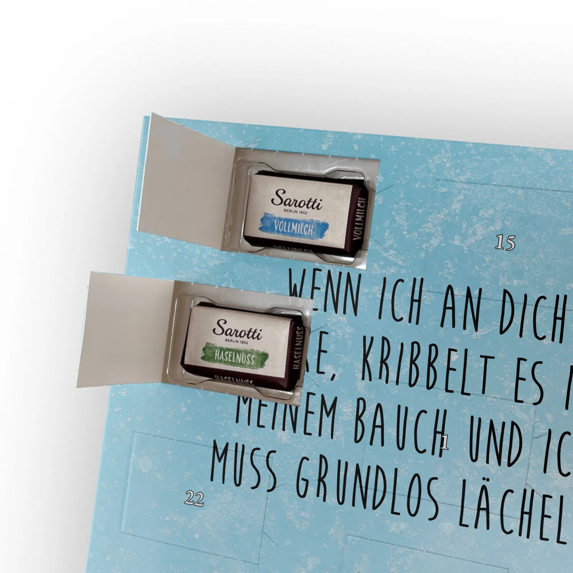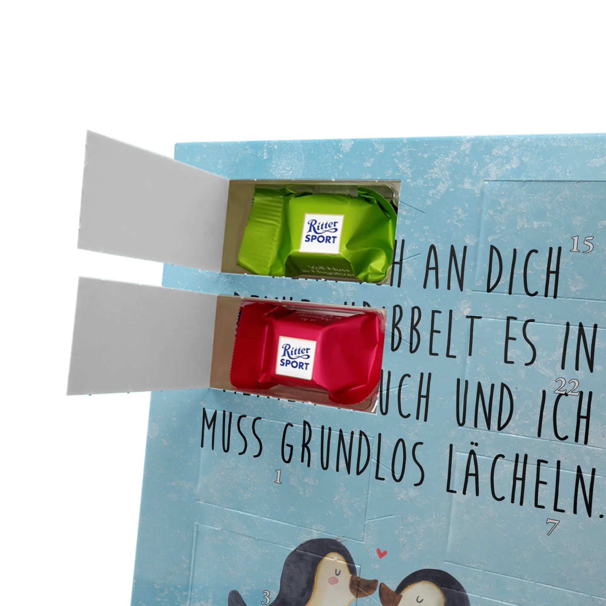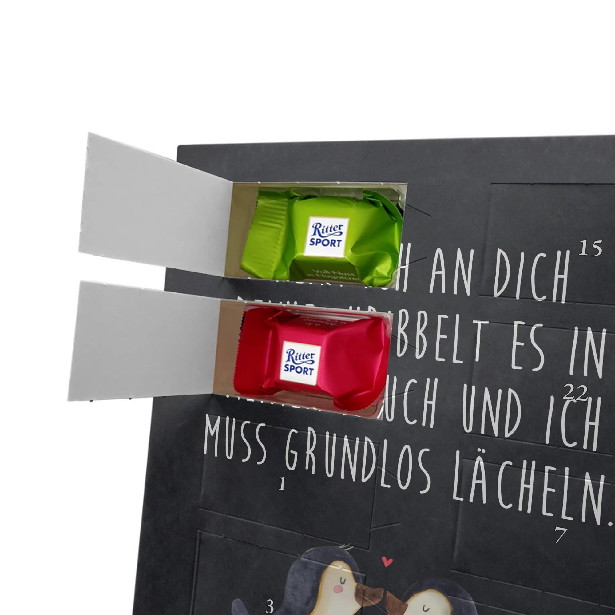Schoko Foto Adventskalender personalisiert – ein fröhlicher Hingucker von Mr. & Mrs. Panda, der Adventszeit und Erinnerungen verbindet. Der Kalender ist bedruckt mit zauberhaften Motiven & Sprüchen von Mr. & Mrs. Panda und lässt sich ganz leicht mit einem Foto deiner Wahl personalisieren. Achtung Bildqualität: Für ein scharfes Druckbild solltest du ein Foto in hoher Auflösung verwenden. Kontrolliere den Bildausschnitt, damit wichtige Gesichter oder Details nicht verloren gehen. Verwende nur Fotos, für die du die Rechte besitzt oder die frei nutzbar sind. Bitte beachte: Die Fotos werden weder nachbearbeitet noch zugeschnitten und personalisierte Foto Artikel sind vom Umtausch ausgeschlossen. Die Verarbeitung überzeugt mit seidenmatter Oberflächenveredelung und bedruckten Seitenflächen für ein edles Finish. Maße: 325 mm x 225 mm x 27 mm. Besonderheit: Du kannst den Kalender aufhängen oder aufstellen – ganz flexibel. Gefüllt ist der Kalender mit Ritter Sport Schokowürfeln in leckeren Geschmacksrichtungen wie Mousse au Chocolat, Schoko Crisp, Voll-Nuss in Nougatcreme, Karamell Duo, Joghurt und Erdbeer-Joghurt. Ein liebevolles Geschenk, das jeden Tag im Advent versüßt.