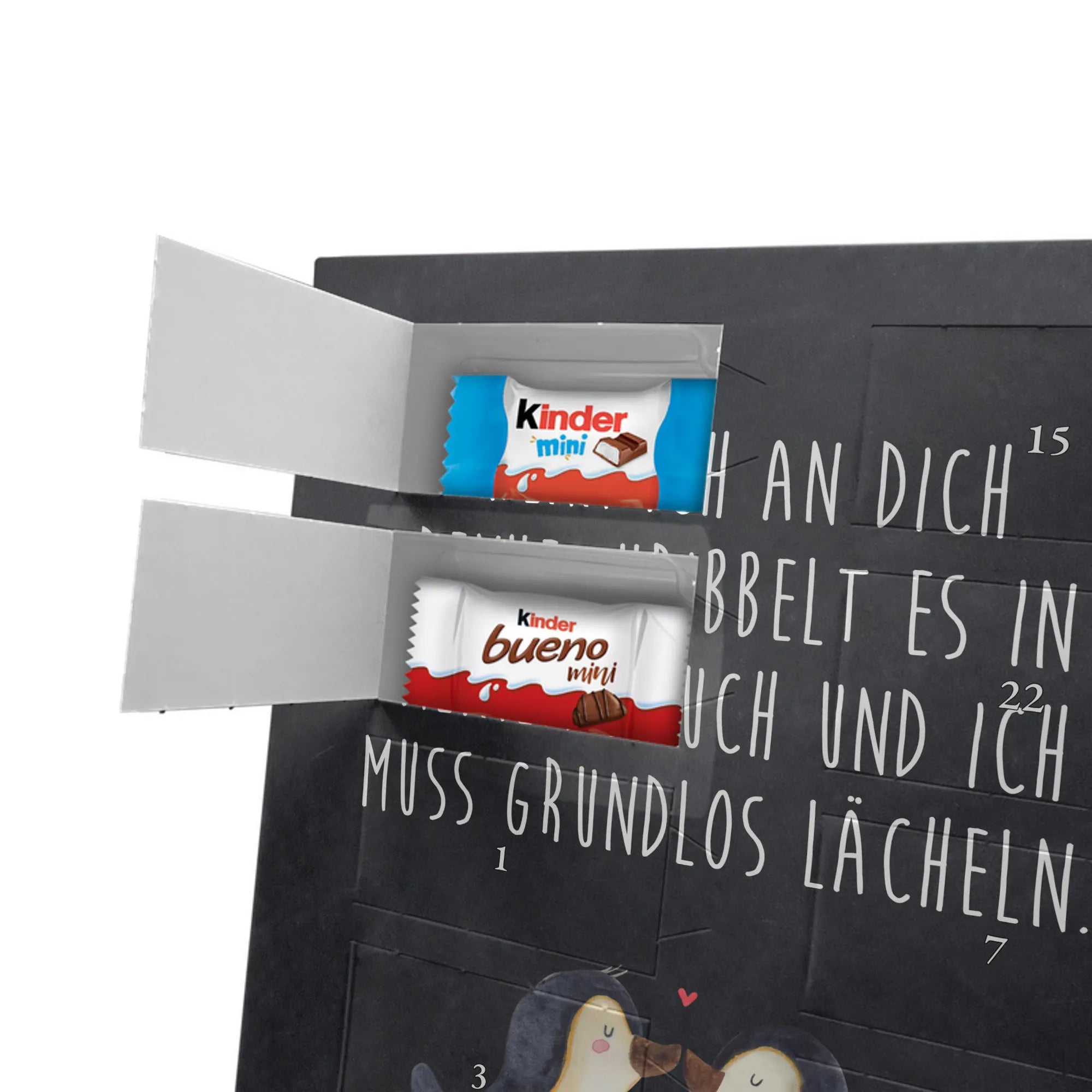 Unser personalisierten Schoko Foto Adventskalender ist ein echtes Highlight in der Adventszeit – handlich, individuell und voller süßer Überraschungen. Du personalisierst die Vorderseite mit deinem liebsten Foto und wir kombinieren es mit liebevollen Motiven und Sprüchen von Mr. & Mrs. Panda. Bitte achte auf eine ausreichende Bildauflösung und einen passenden Bildausschnitt, damit das Druckergebnis gestochen scharf ist. Lade nur Bilder hoch, deren Rechte du besitzt oder bei denen du die Erlaubnis hast, besonders wenn Personen darauf zu sehen sind. Wichtig: Fotos werden nicht retuschiert oder zugeschnitten; personalisierte Foto-Artikel sind vom Widerruf ausgeschlossen. Der Kalender besticht durch brillante Druckqualität und eine seidenmatte Oberflächenveredelung sowie bedruckte Seitenflächen. Maße: 355 mm x 245 mm x 11 mm. Du kannst ihn entweder aufstellen oder an die Wand hängen. Gefüllt ist der Adventskalender mit kinder® Schokolade, inklusive kinder® Schoko-Bons, kinder® Bueno mini und kinder® Schokolade mini. Ein liebevolles, persönliches Geschenk für Kinder, Freunde oder die bessere Hälfte – individuell, süß und mit dem typischen Mr. & Mrs. Panda Charme.