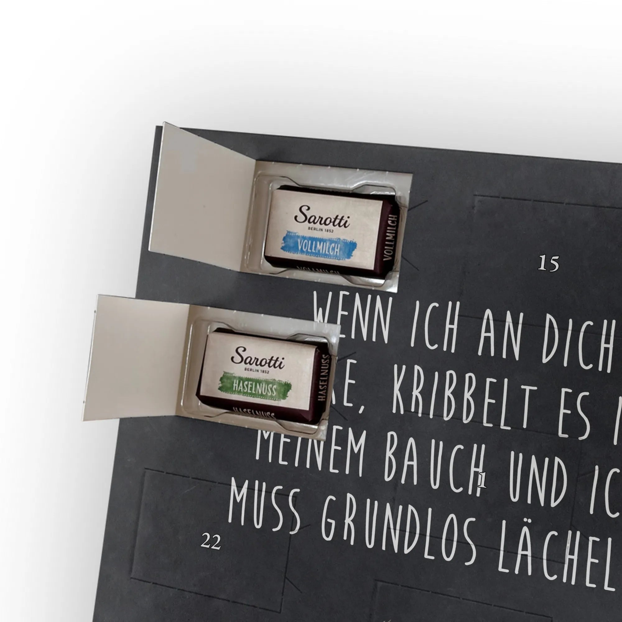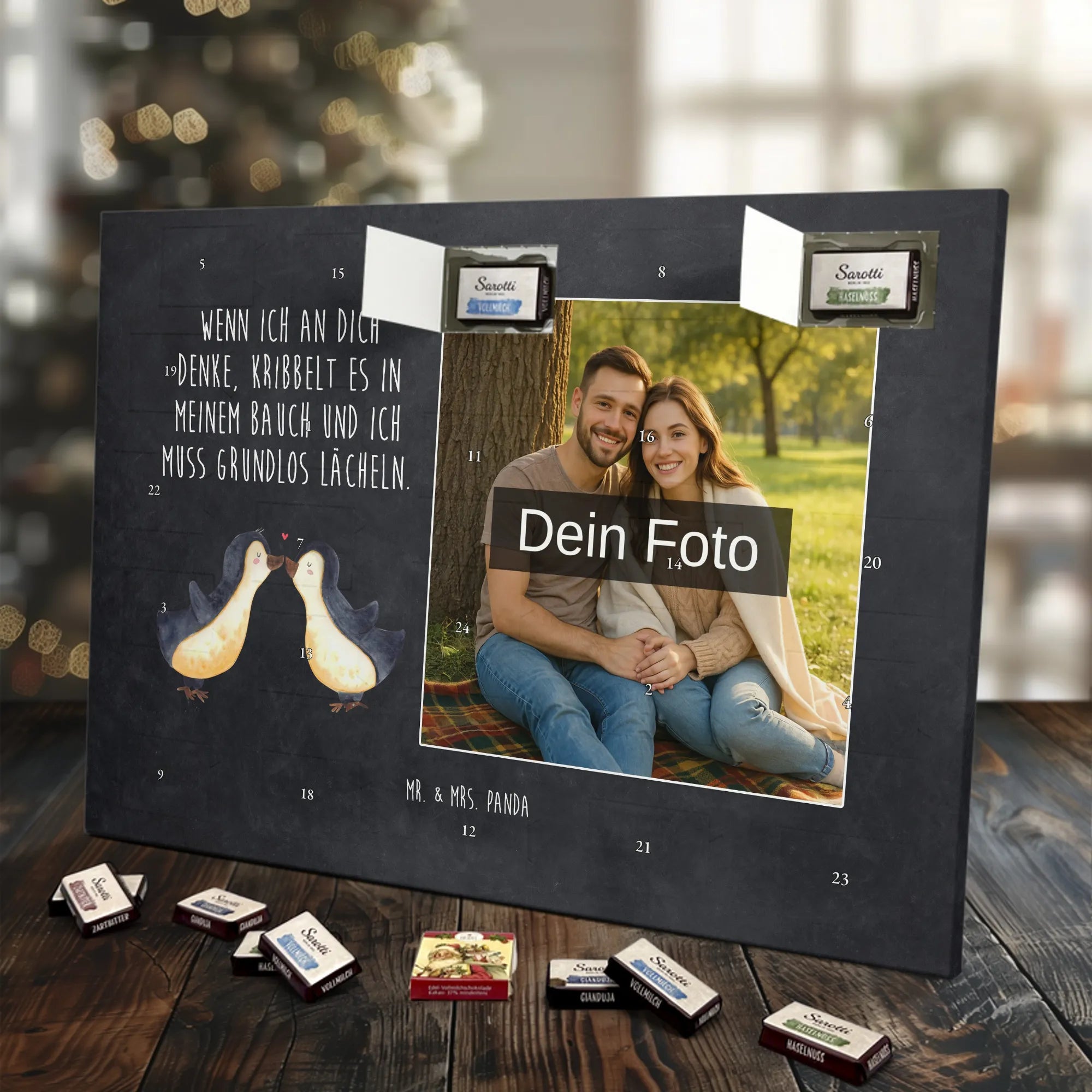 Schoko Foto Adventskalender personalisiert – ein zauberhaftes Geschenk, das Erinnerungen und Geschmack vereint. Mr. & Mrs. Panda haben liebevolle Motive und Sprüche gestaltet, die den Kalender umrahmen; dein Foto setzt die persönliche Note. Für ein optimales Druckbild lade bitte ein Foto mit hoher Auflösung hoch und achte auf einen passenden Bildausschnitt, damit wichtige Details nicht abgeschnitten werden. Bitte nur Bilder verwenden, für die du die Rechte besitzt. Die seidenmatte Oberflächenveredelung sorgt für edle Haptik und die bedruckten Seitenflächen für ein rundum gelungenes Design. Maße: 355 mm x 245 mm x 11 mm – kann aufgehängt oder aufgestellt werden. Wichtiger Hinweis: Wir bearbeiten oder schneiden die Fotos nicht nach; eine Rücknahme personalisierter Foto Artikel ist ausgeschlossen. Gefüllt mit 24 einzeln verpackten Schokoladentäfelchen in den Geschmacksrichtungen Vollmilch, Nougat, Zartbitter und Haselnuss von Sarotti® und Confiserie Heidel®. Insgesamt enthält der Kalender 107 g Markenschokolade. Ideal als Geschenk für Partner, Familie oder Freunde – persönlich, süß und liebevoll verpackt von Mr. & Mrs. Panda.